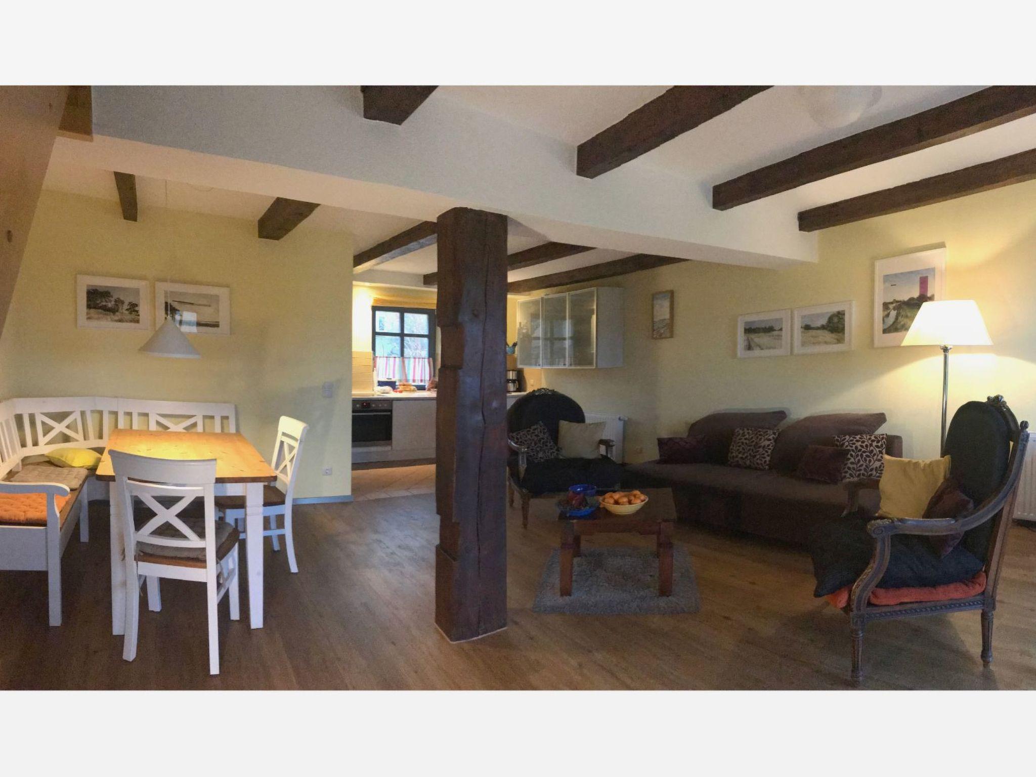 The holiday home is about 61m² in size and has 2 floors. On the upper floor there are two bedrooms, one with a double bed and travel cot and one with two single beds (some of which can be converted into extra beds). The ground floor is characterised by its historic beams. The open-plan living area with sofa bed (extra bed for a 5th person, flat-screen TV, WLAN), dining area (6 people) and open-plan kitchen (cooker, oven, fridge/freezer, dishwasher, coffee machine, toaster) looks really spacious thanks to the large window front facing the garden. The bathroom/WC with shower cubicle has a window facing the street. Bed linen (charged per person/stay) and/or towels (charged per person/stay) can be booked in addition. The costs are to be paid directly to the landlord. The terrace is equipped with weatherproof garden furniture (cushions on the upper floor). Each flat has its own car park in front of the house. In the bicycle room, which is available to all guests, not only bicycles can be locked, but also other garden furniture can be borrowed, as well as children's high chairs and toys. Please note the minimum booking of 5 nights in the high season. Gap bookings of 2 nights or more are possible on request.