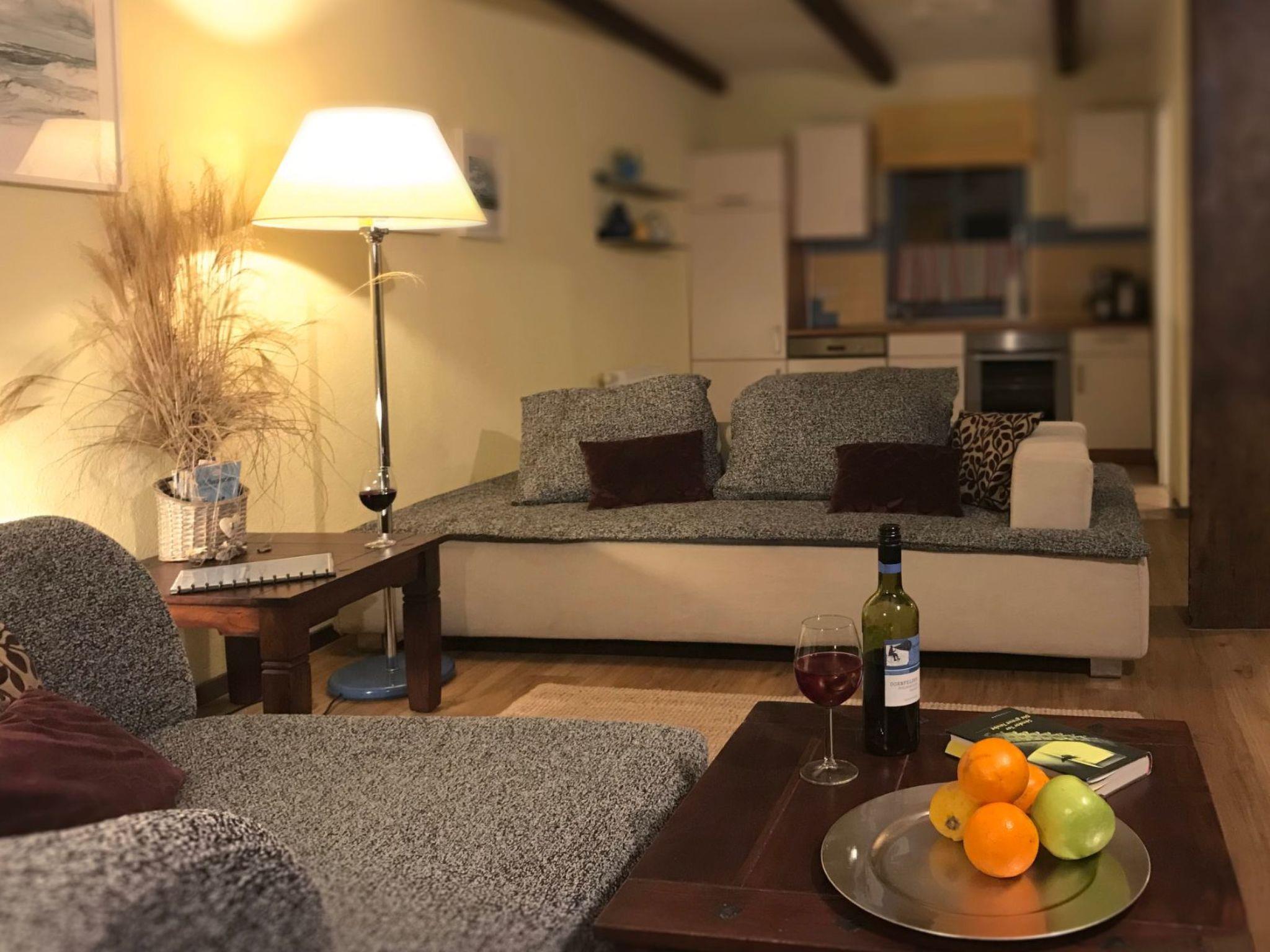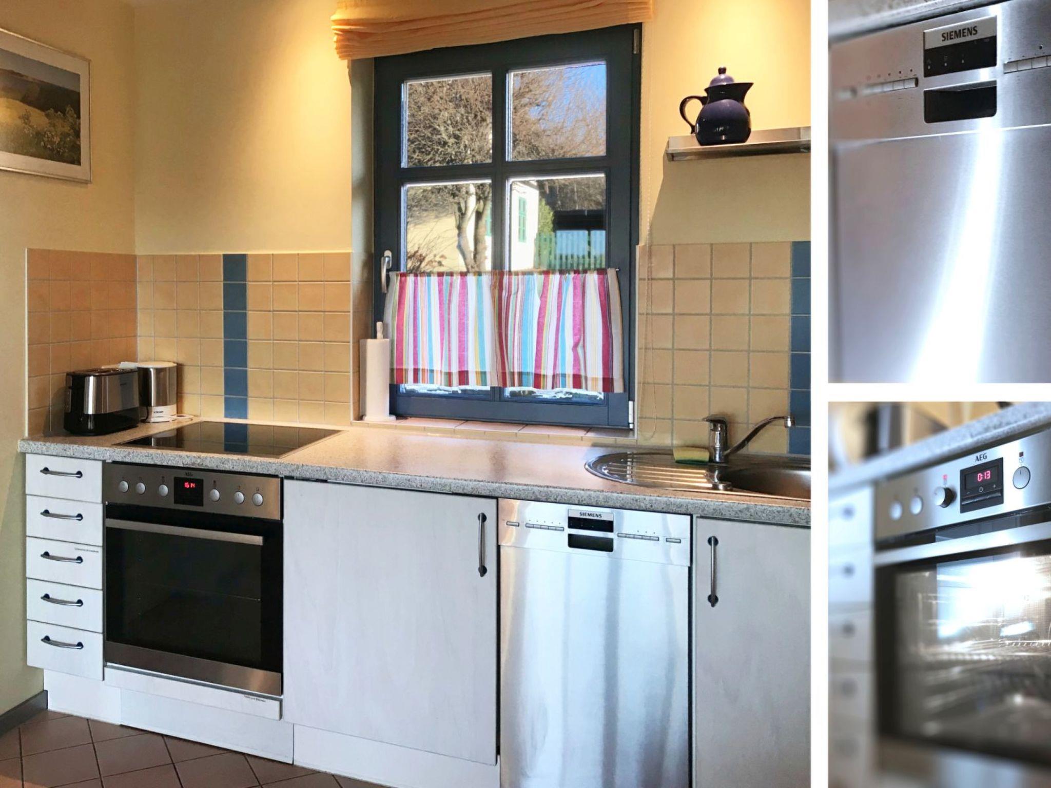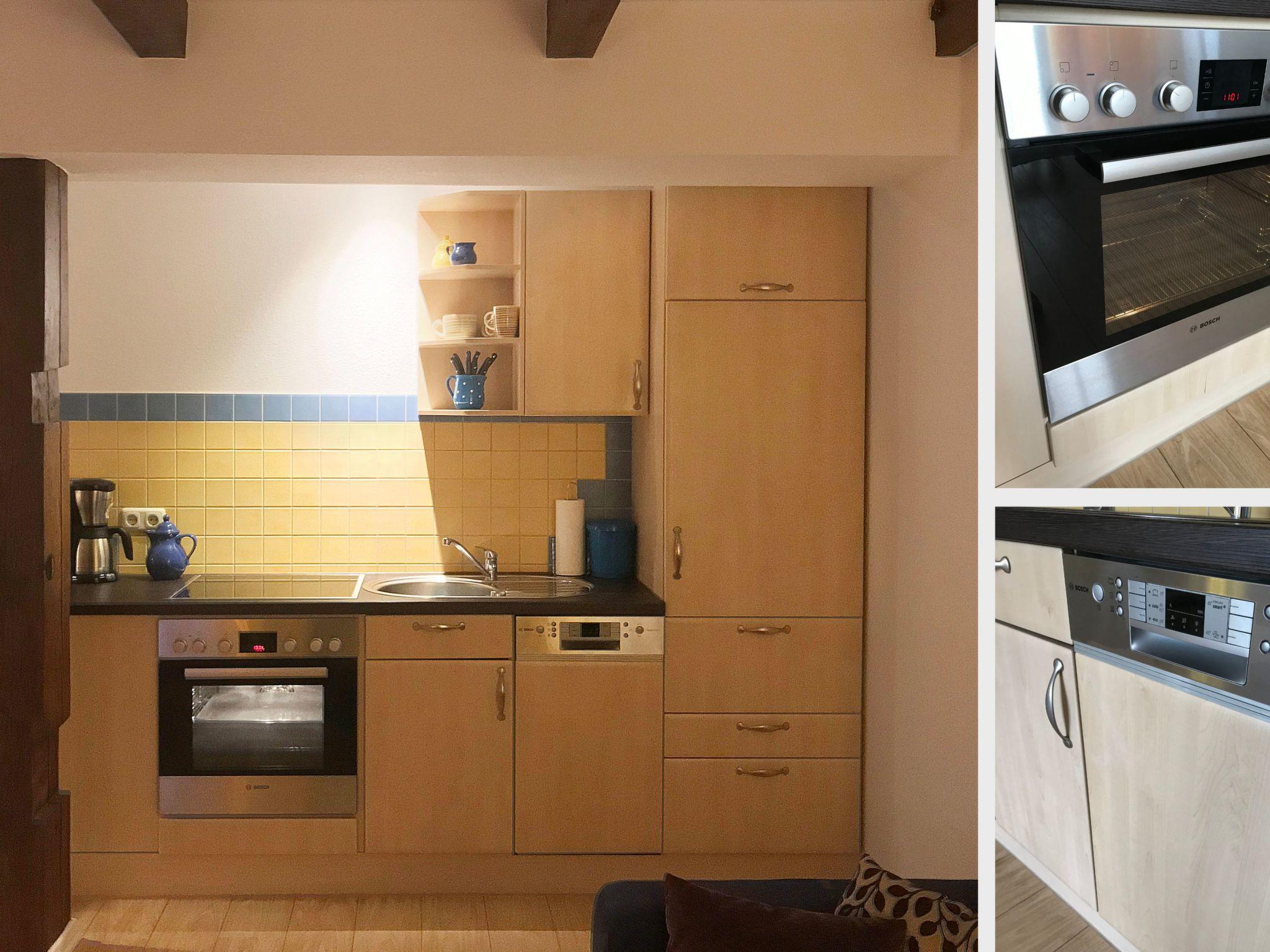 The holiday home is about 61m² in size and has 2 floors. There are two bedrooms on the upper floor, one with a double bed and travel cot and one with two single beds (some of which can be converted into extra beds). The ground floor is characterised by its historic timber beams. The open-plan living area with sofa bed (extra bed for a 5th person, flat-screen TV, WiFi), dining area (6 people) and open-plan kitchen (hob, oven, fridge/freezer, dishwasher, coffee machine, toaster) looks really spacious thanks to the large window front facing the garden. The bathroom/WC with shower cabin has a window facing the street. Bed linen (charged per person/stay) and/or towels (charged per person/stay) can be booked in addition. The costs are to be paid directly to the landlord. The terrace is equipped with weatherproof garden furniture (cushions on the upper floor). Each flat has its own free car park in front of the house. In the bicycle room, which is available to all guests, not only bicycles can be locked, but also other garden furniture can be borrowed, as well as children's high chairs and lots of toys. Please note the minimum booking of 5 nights in the high season. Gap bookings of 2 nights or more are possible on request.