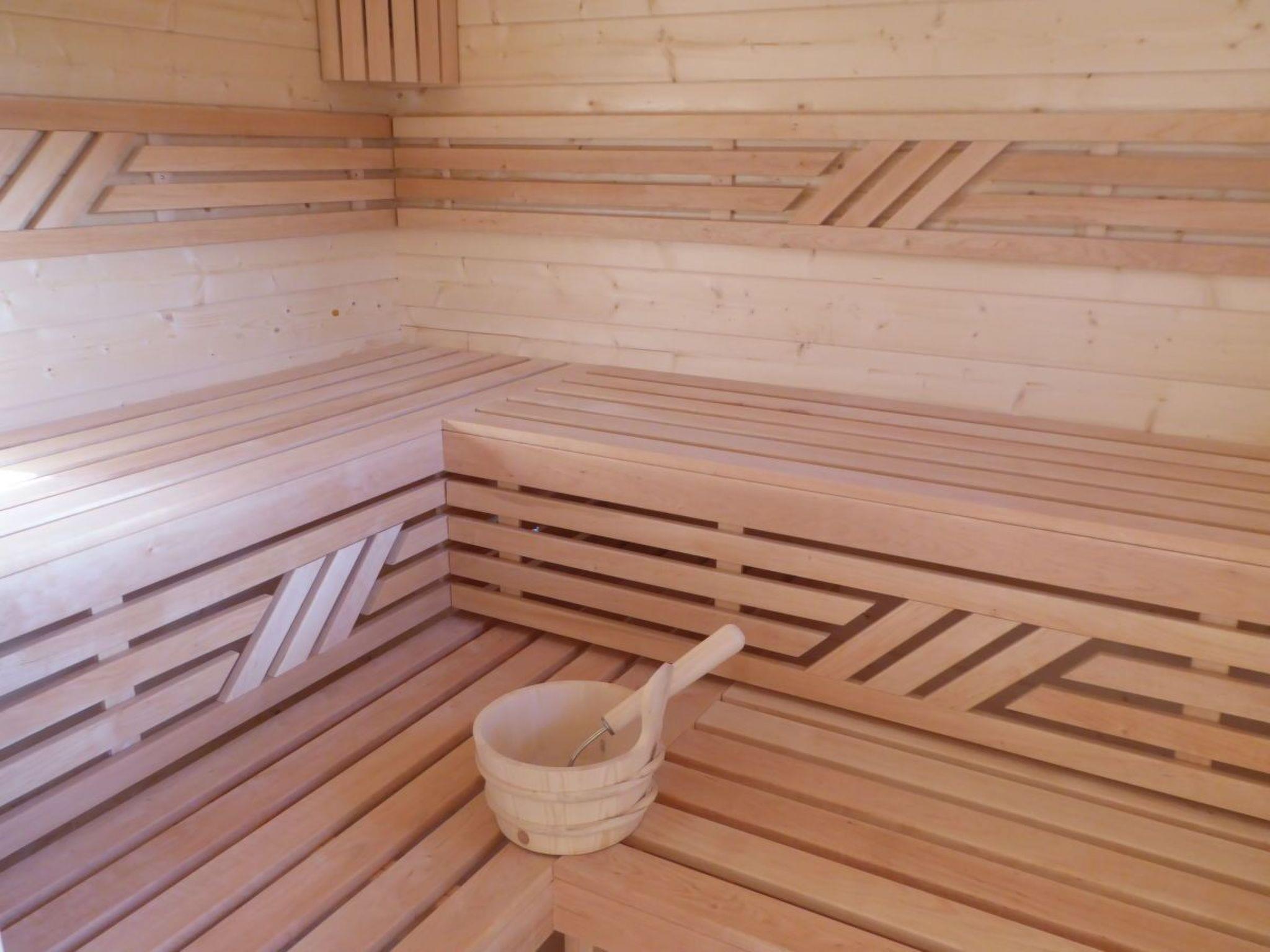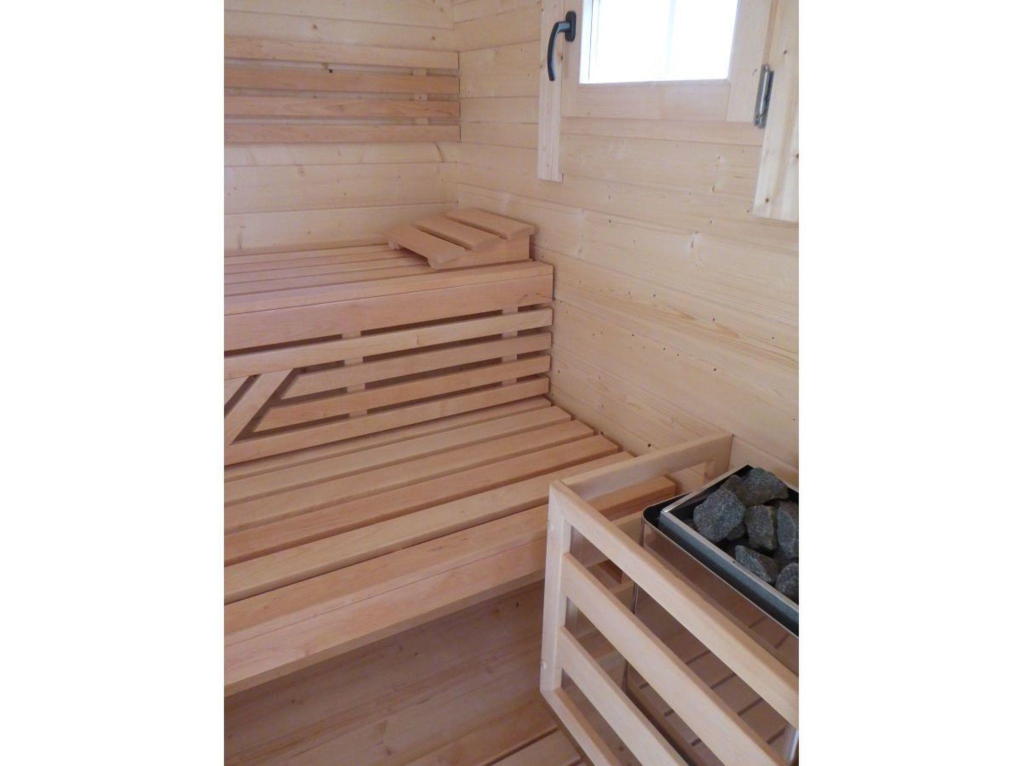 The outdoor area with two terraces provides garden furniture, two loungers, a bench and a charcoal grill. There is an outdoor sauna in the garden. The balcony on the upper floor, also with a view towards the island Hiddensee, has seating.