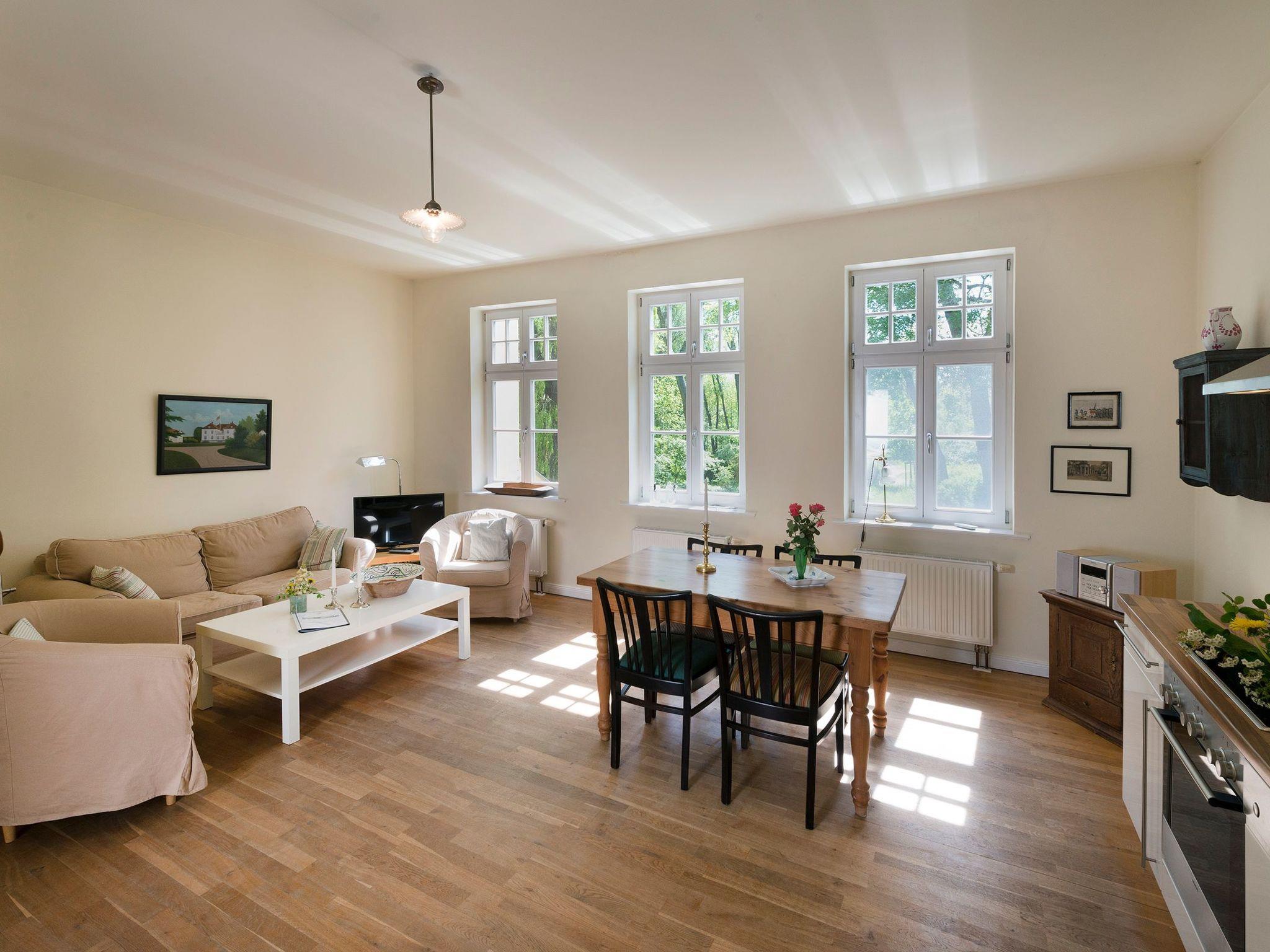 Holiday apartment 2 in the manor house is on the ground floor and in the basement, on two floors, connected by a spiral staircase. The apartment is suitable for up to four people and measures 85m². It is comfortably furnished and comprises a big living room with an open kitchen, (quality Siemens appliances) and a beautiful view to the south onto the garden, two generous bedrooms each with a double bed, and two separate bathrooms with WC, one with a bath and one with a shower. The floors are laid with oak parquet.