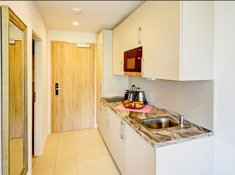 Die komplett zur Sonnenseite ausgerichtete Wohnung im 7. Stock, erreichbar mit dem Fahrstuhl, bietet den ganzen Tag über Sonnenschein. Im Wohn-Schlafbereich erwartet Sie ein hochwertiges Doppelbett, ein geräumiger Kleiderschrank, ein TV und eine sonnige Essecke.