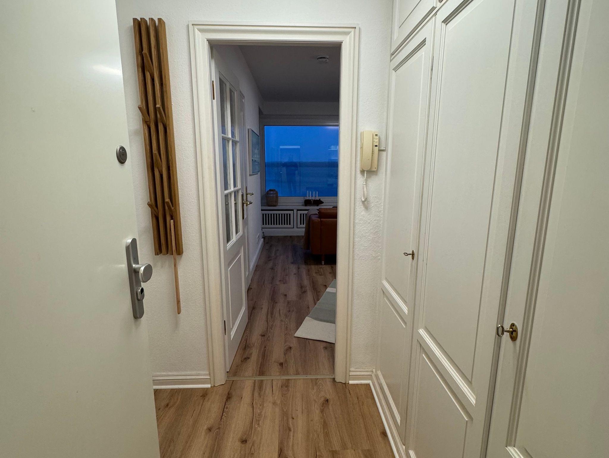 Die 34 Quadratmeter große Wohnung verfügt über einen Balkon mit Meerblick, ein separates Schlafzimmer mit einem 140 cm großem französischen Bett und Einbauschränken, einem Wohn-/Esszimmer, eine kleine gut ausgestattete Küche sowie einem Badezimmer mit einer Badewanne. Außerdem befindet sich im Flur ein großer Einbauschrank und Garderobe.