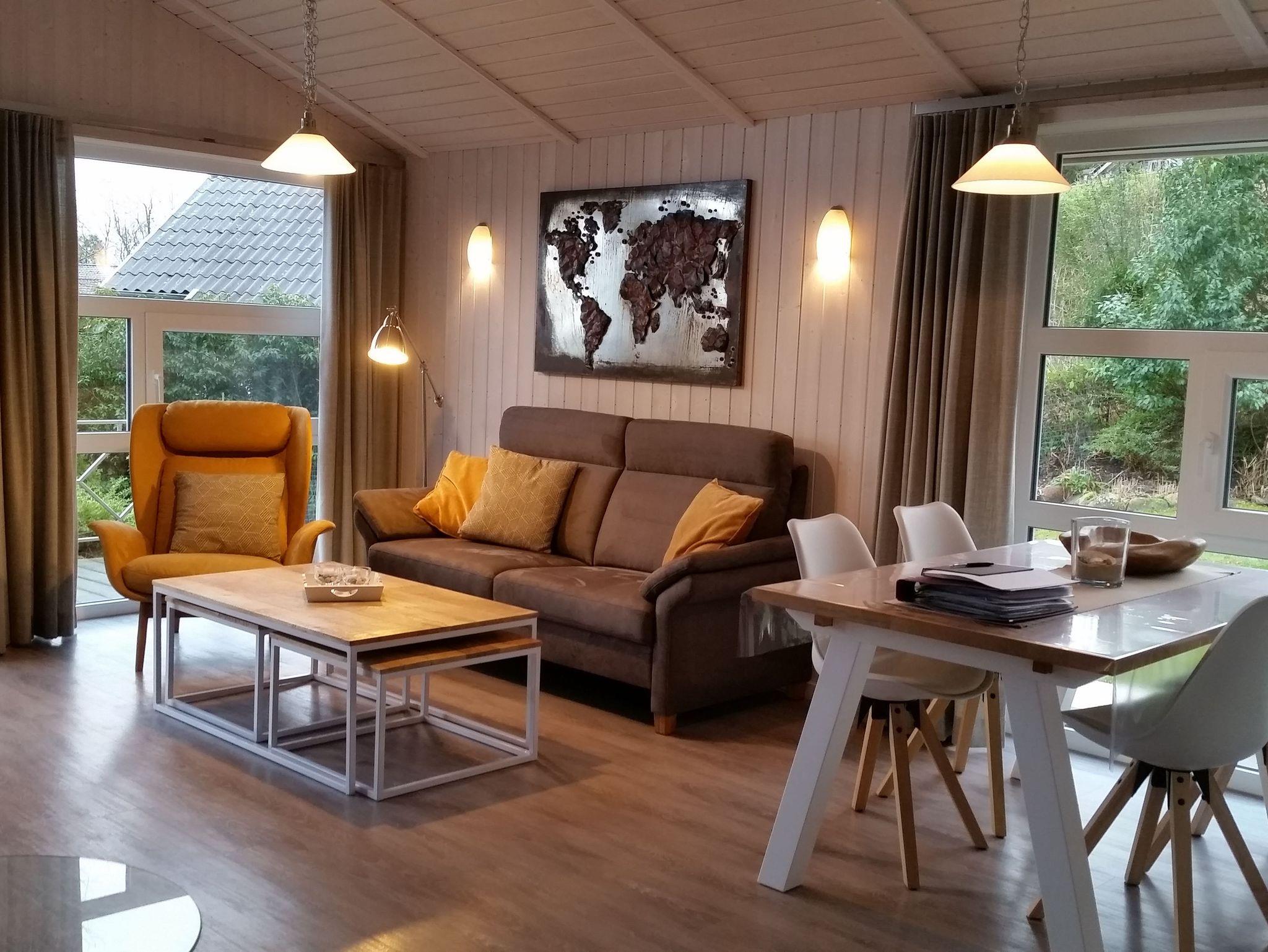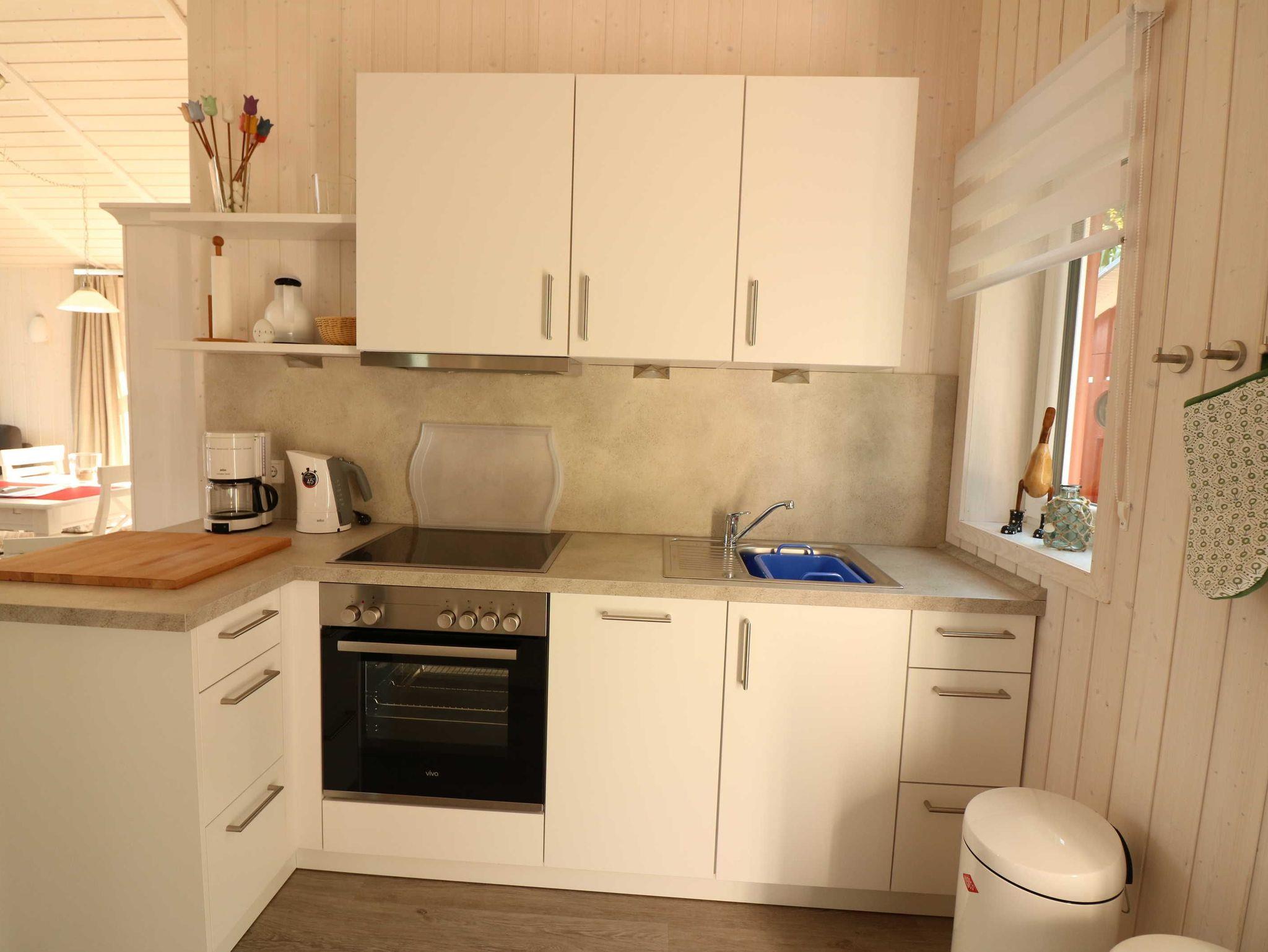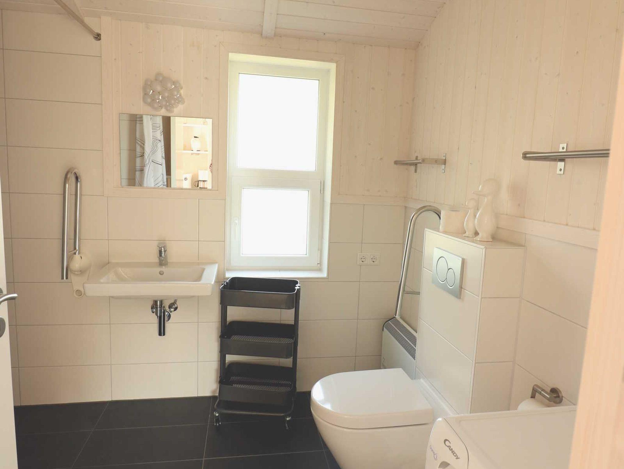 Das barrierefreie Haus erreicht man bequem vom eigenen Parkplatz über einen befestigten Weg (Splittbelag). Die lichtdurchflutete Unterkunft bietet Ihnen auf 60 m² einen Wohnbereich mit Kaminofen, Essecke und offener Küche, 1 Schlafraum mit einem Doppelbett (2x80x200 cm), 1 Schlafraum mit 2 Einzelbetten (80x200cm), Badezimmer mit Fußbodenheizung, offener Dusche, Waschmaschine und einer Terrasse mit Gartenmöbeln und Grill. Die helle offene Einbauküche verfügt über E ? Herd mit Ceranfeld, Kühlschrank mit Eisfach, Geschirrspüler und den üblichen elektrischen Küchengeräten wie Mikrowelle, Mixer, Toaster, Kaffeemachine etc. Das Haus wird über Elektroheizkörper beheizt.