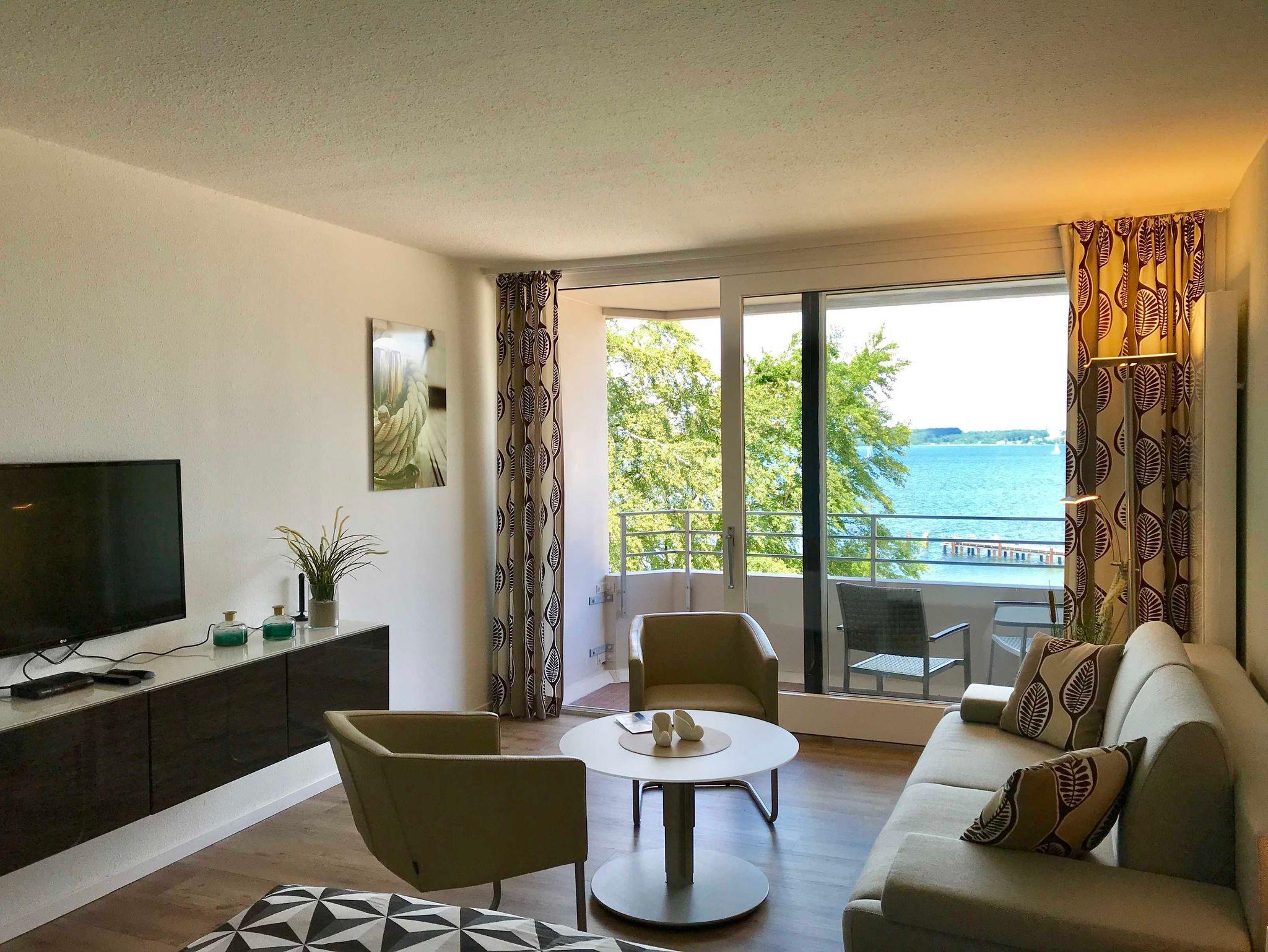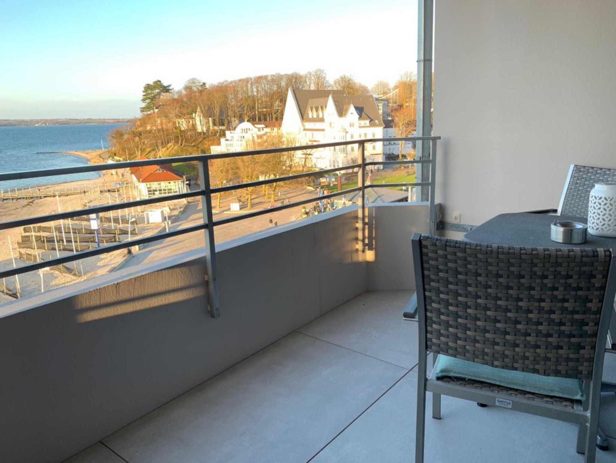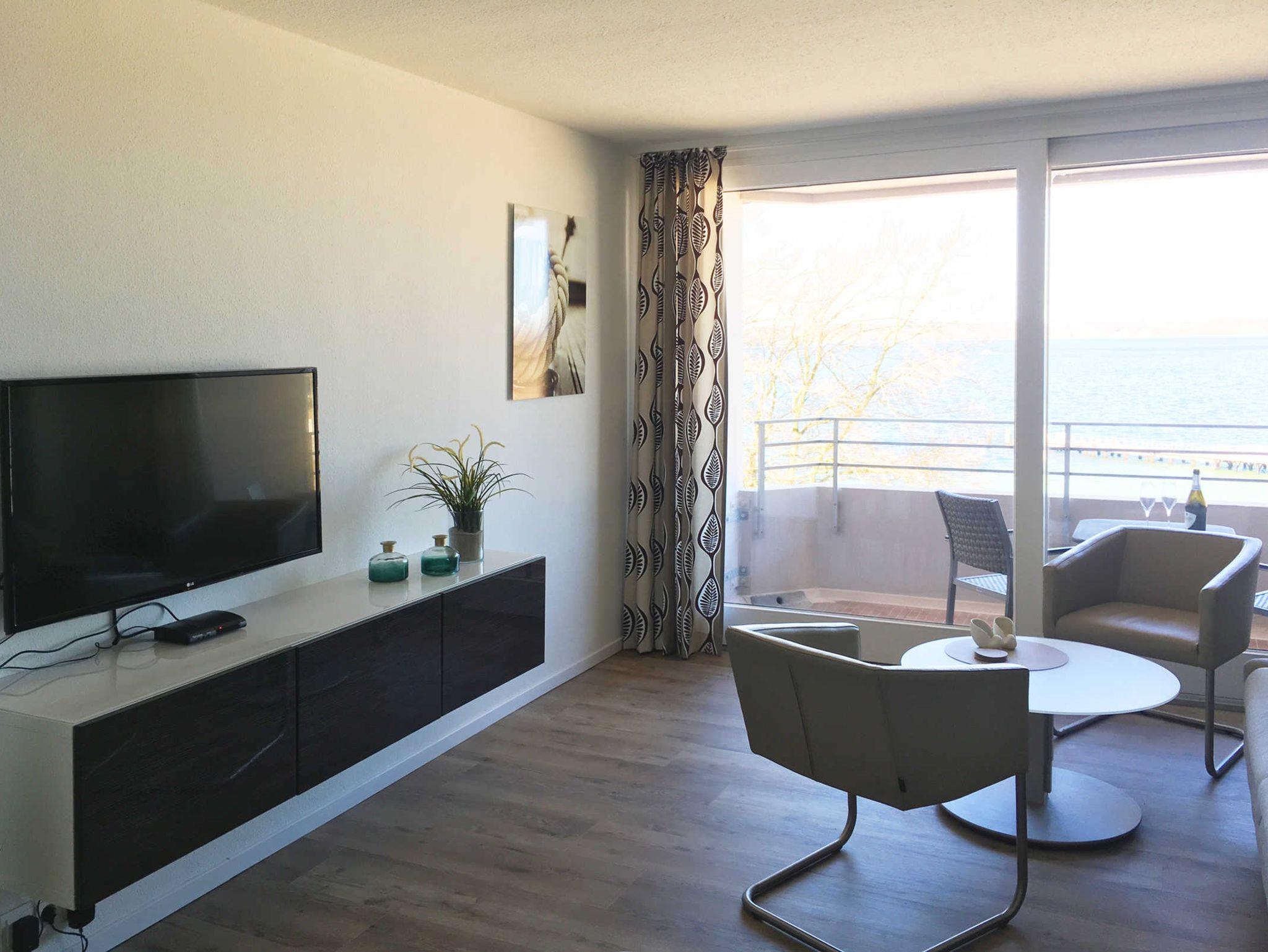 Helle, freundliche Ferienwohnung mit Balkon zur Glücksburger Strandpromenade und Blick über die Flensburger Förde bis nach Dänemark. Das kombinierte Wohn-/Schlafzimmer ist möbliert mit einem Schrank, einem Sideboard, einem Doppelbett, einer Sitzgruppe mit Sofa und einem höhenverstellbaren Tisch. Zur Unterhaltung steht ein 43-Fernseher fur Sie bereit. Die Küche ist ausgestattet mit einem Induktionskochfeld, einer Grill-Mikrowellenkombination mit Absaugfunktion und einem Kühlschrank mit Gefrierfach. Sämtliche Küchenutensilien, die ein Kochherz begehrt, sind vorhanden.