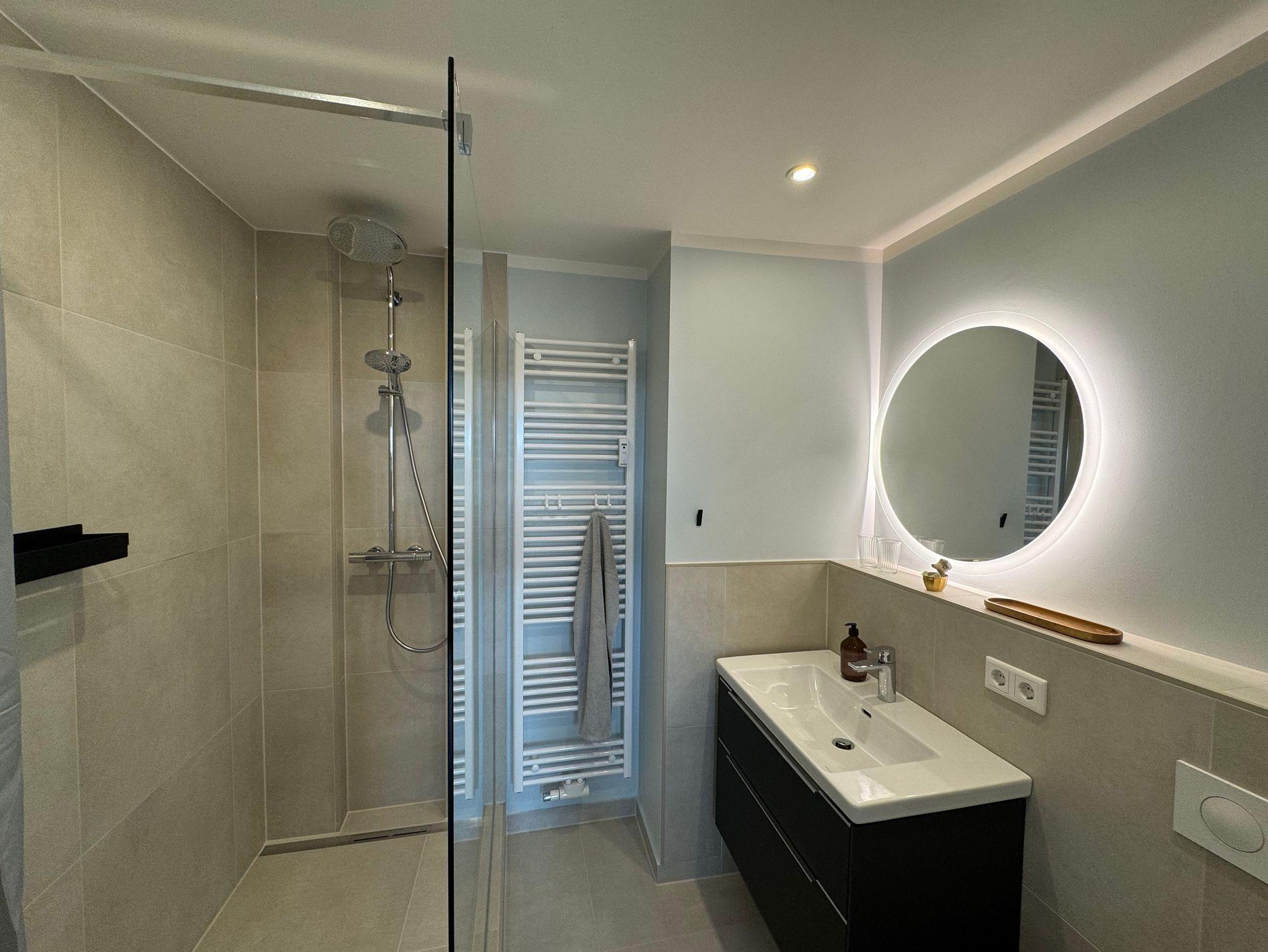 • Modernes Badezimmer mit großer begehbarer Dusche mit Raindance Deckenbrause, WC, beleuchteter Spiegel, Haartrockner, Schminkspiegel, u.a.m.