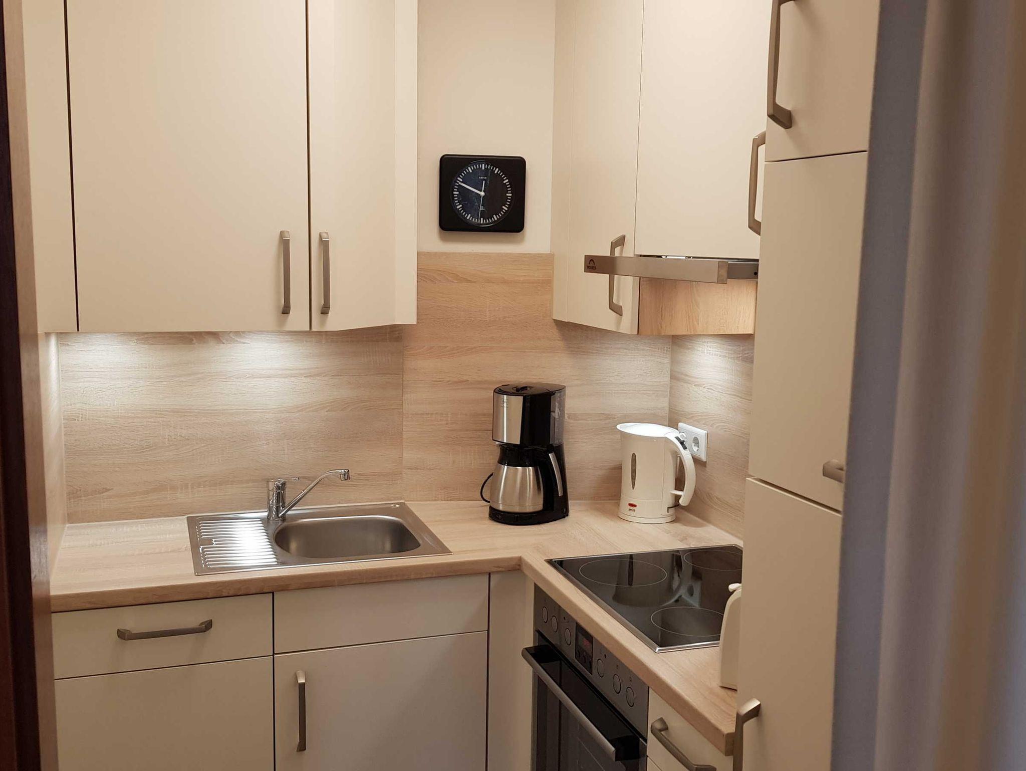 • Küche mit Ceran 4-Zonen Kochfeld, Einbauherd mit Backofen (Grillheizstab und Kühlgebläse), Dunstabzugshaube und Geschirrspüler, neuer Fußboden