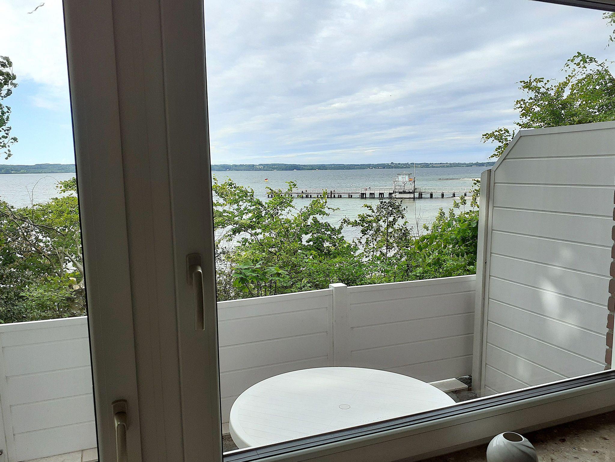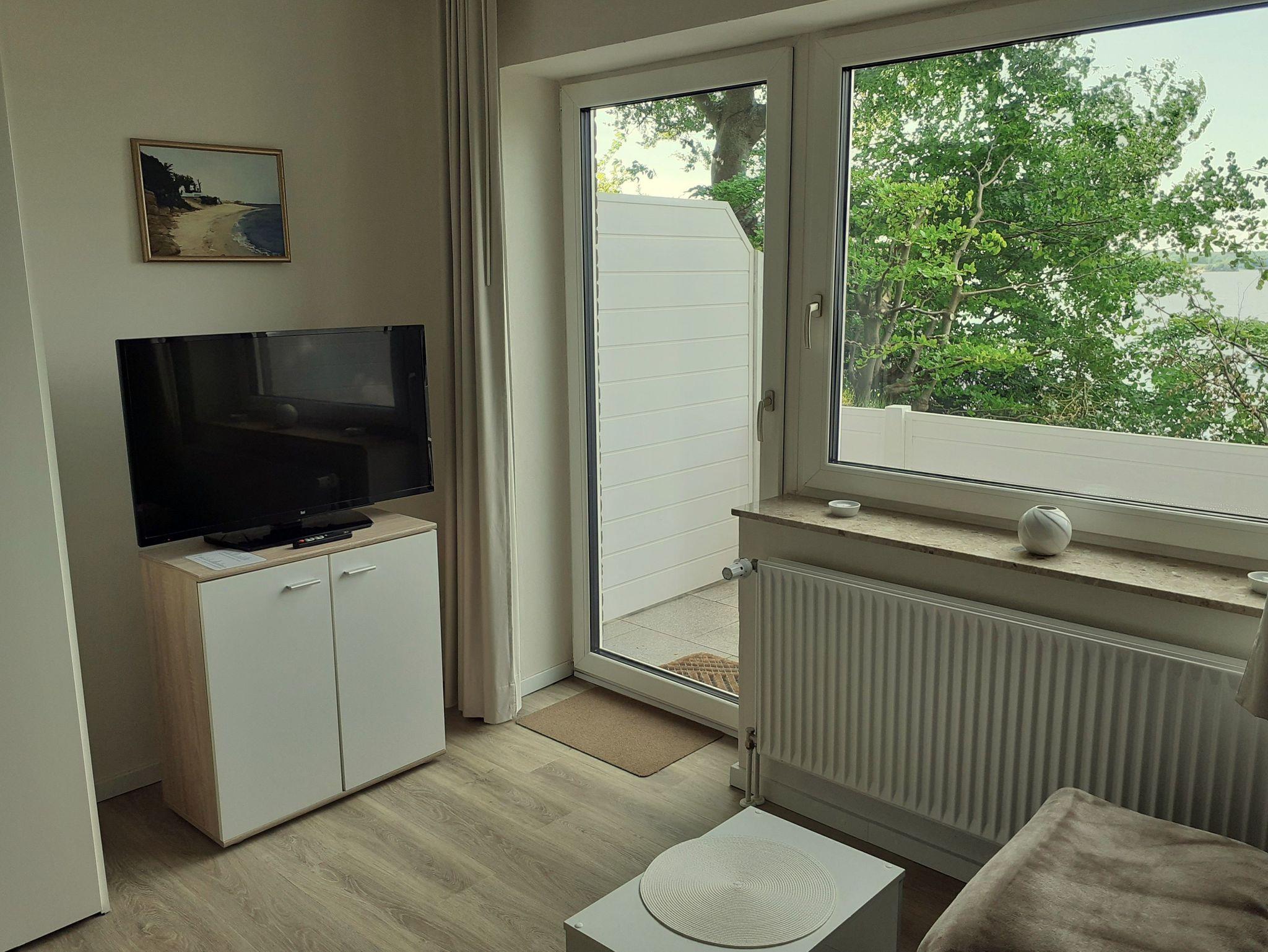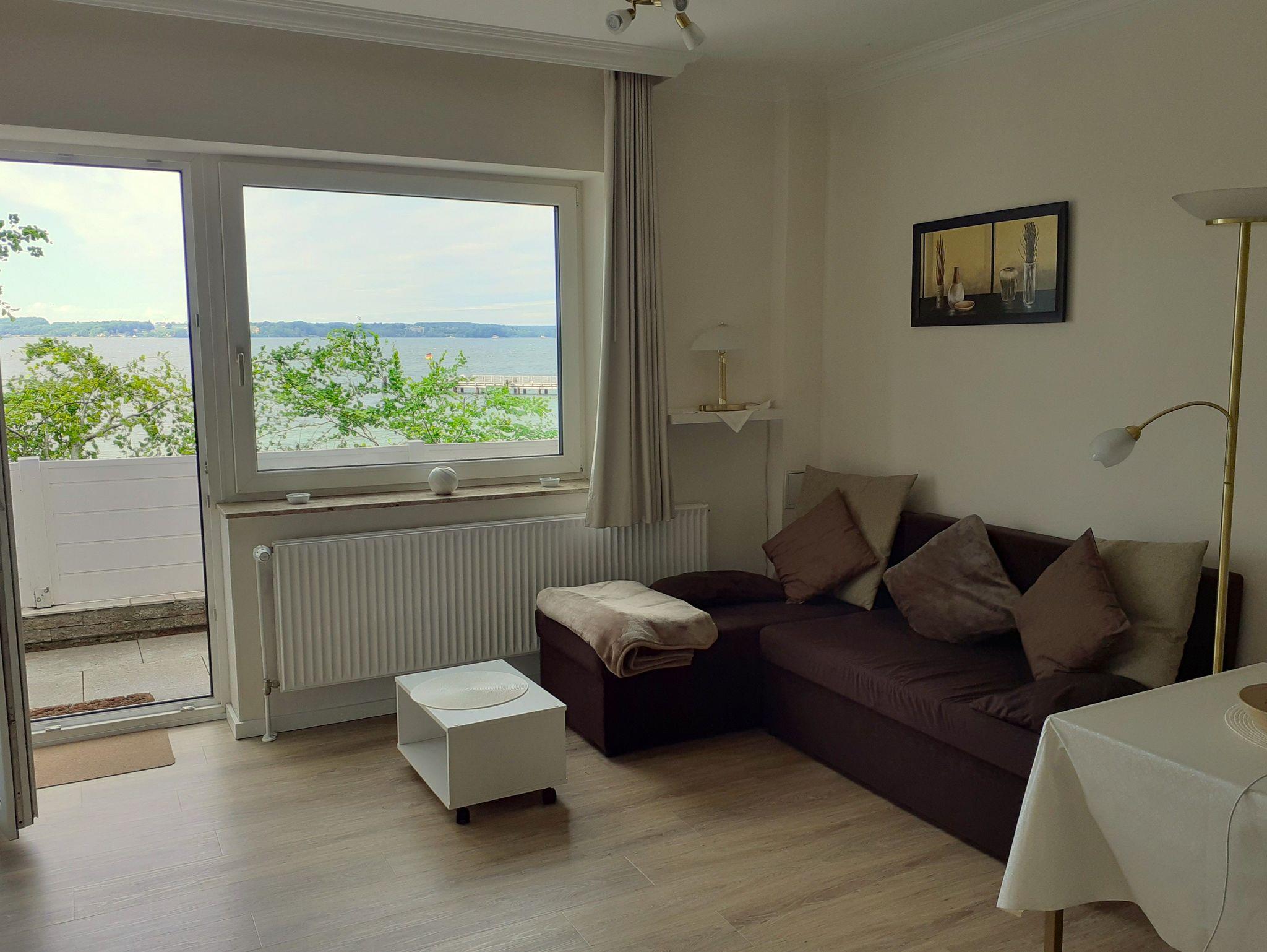 Das Appartement liegt zur Meerseite im Erdgeschoss des Hauses. Es verfügt über eine Terrasse mit direktem Blick auf die Förde, ein innenliegendes Badezimmer mit Dusche, ein Wohnzimmer mit Couch, Schrankbett (90cmx1,90 cm) sowie einem Schreib-/Esstisch. Im Wohnzimmer befindet sich zudem ein Bistro-Vitrinenschrank. Dieser ist ausgestattet mit einer Spüle, Kühlschrank, Filterkaffeemaschine, Wasserkocher, Toaster und Mikrowelle.