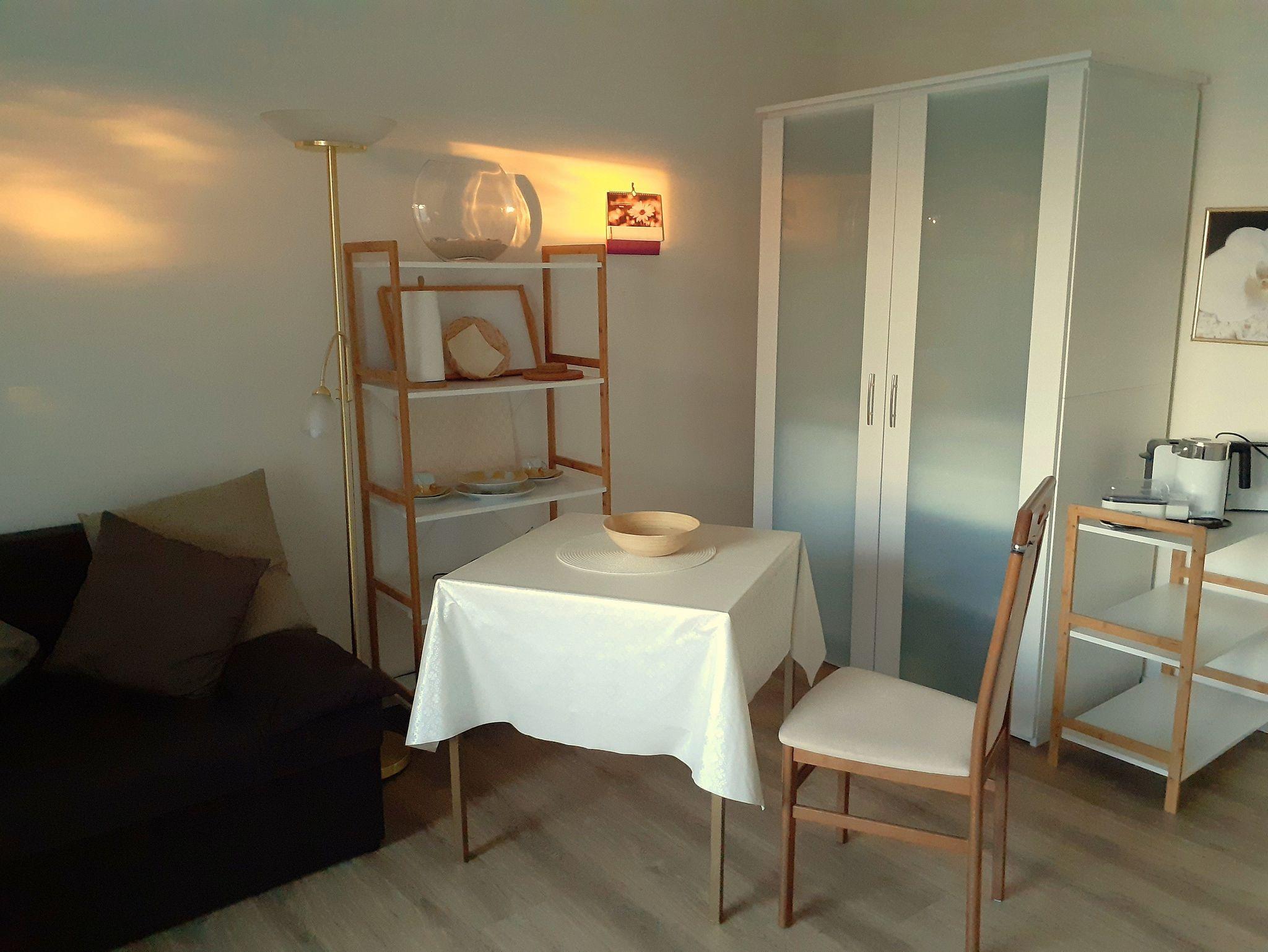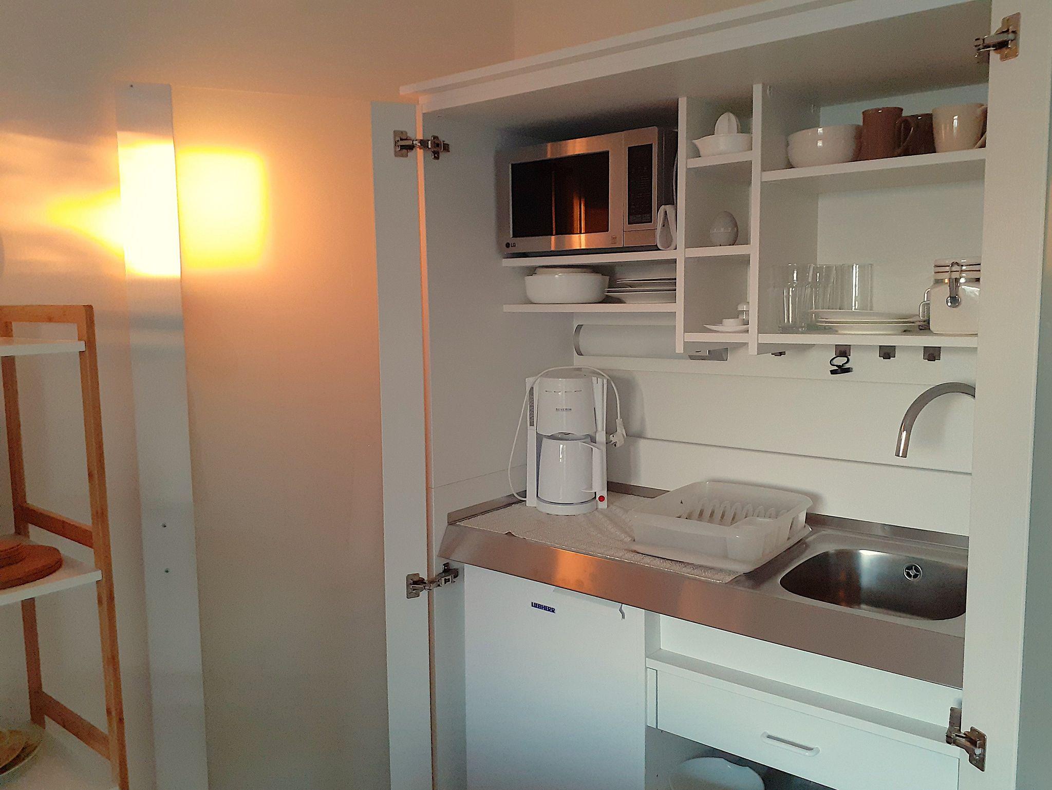 1-Zimmer Appartement mit Terrasse mit Meerblick für 1 Person mit kombiniertem Wohn-und Schlafbereich, Badezimmer mit Dusche, und einer Möglichkeit sich Frühstück und Abendbrot zuzubereiten.