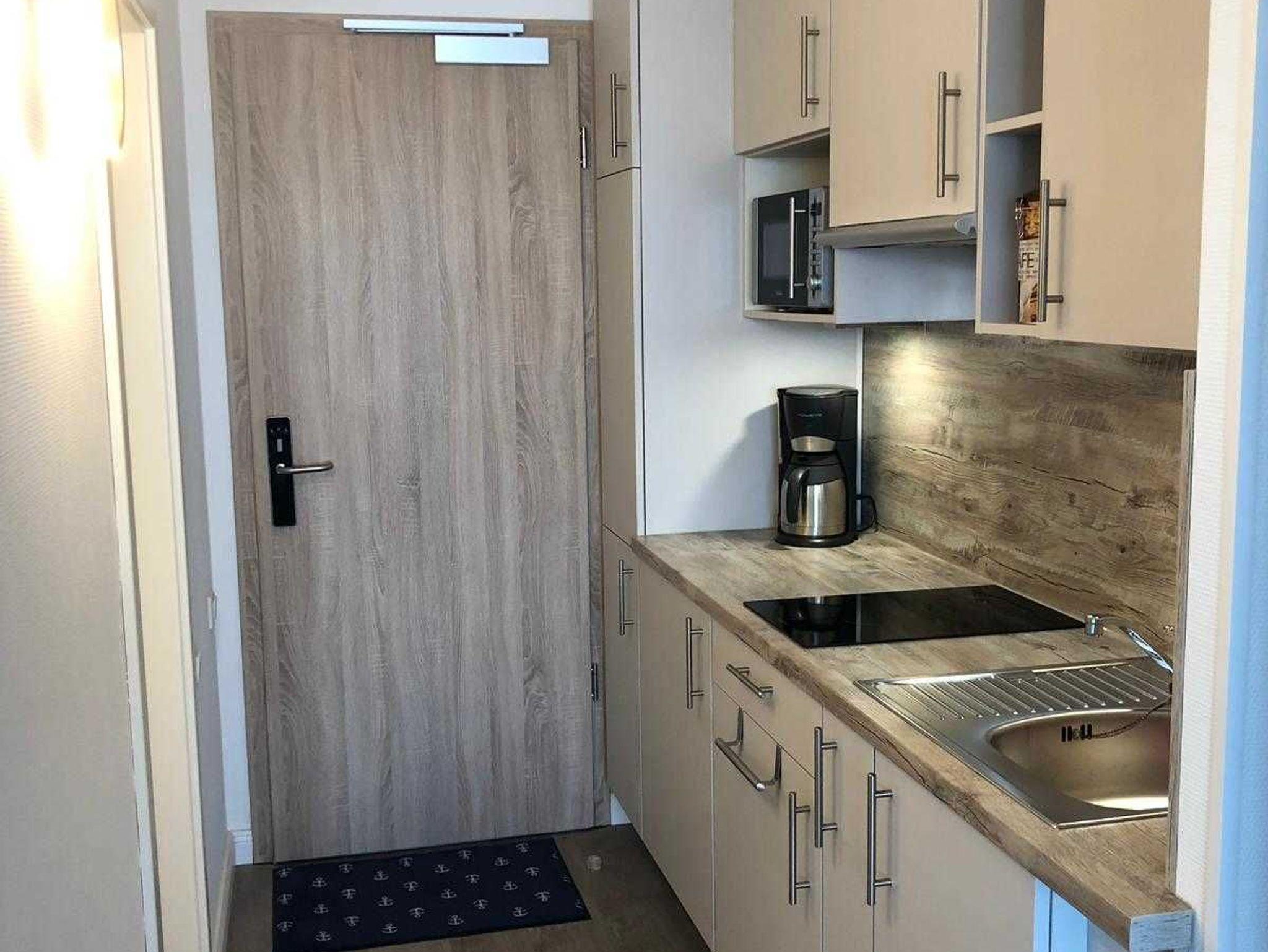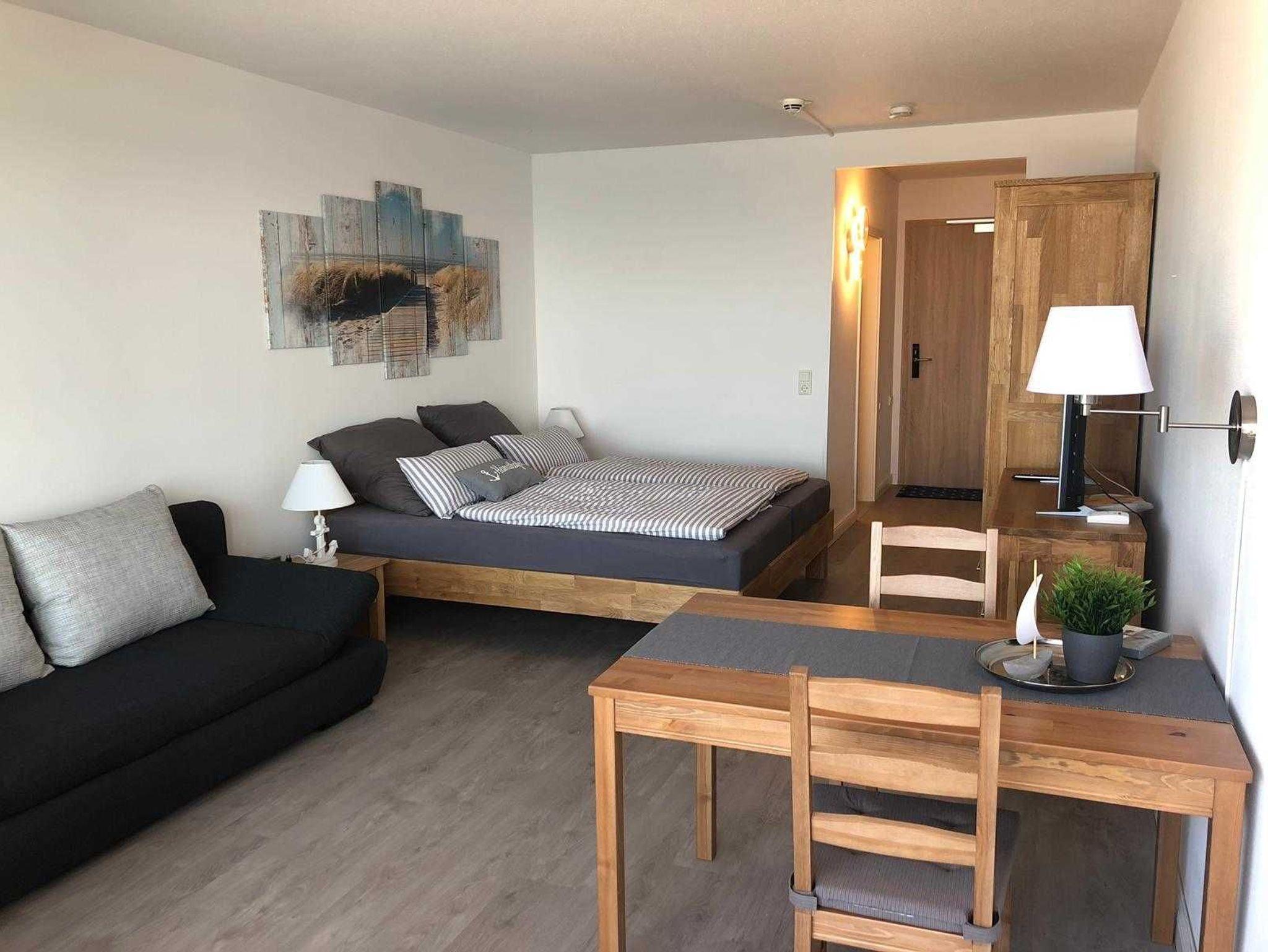 Komplett neu renoviertes 1-Zimmer-Appartement (3. OG) für 2 - 3 Personen mit Duschbad, Küchenzeile, Balkon und Meerblick.
