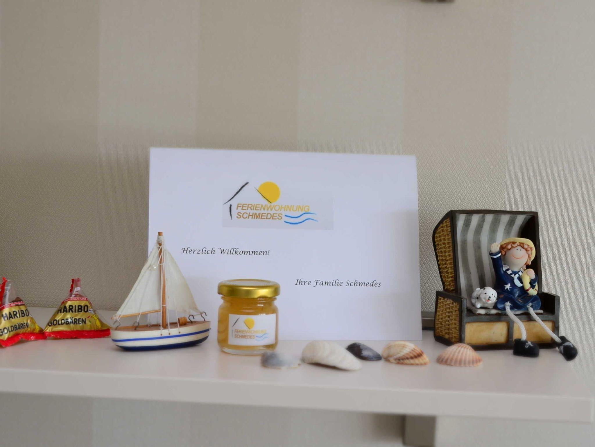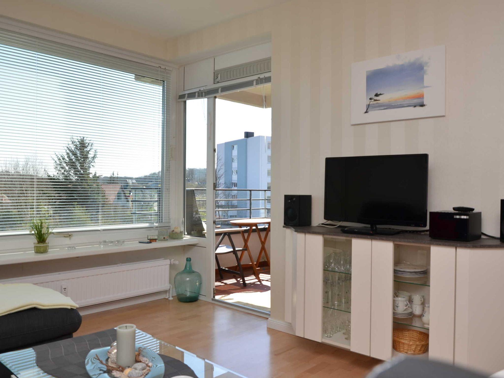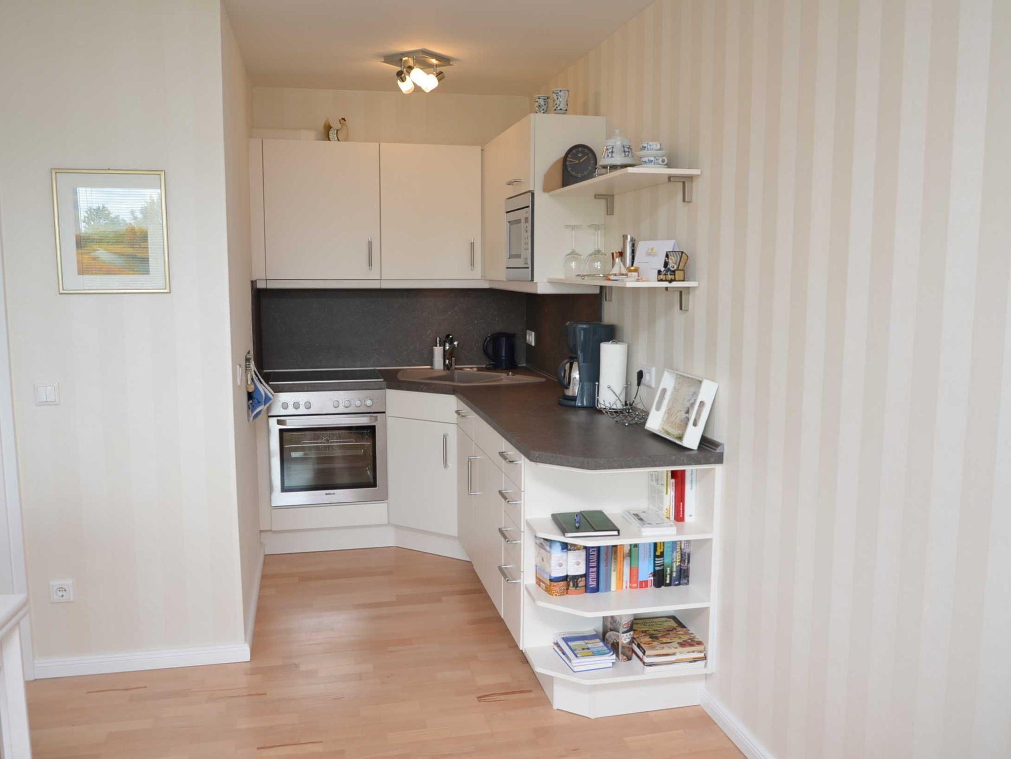 Das Appartement zur Selbstverpflegung mit seitlichem Meerblick (dafür Sonne vom Frühstück bis Nachmittagskaffee) ist ausgestattet mit:
