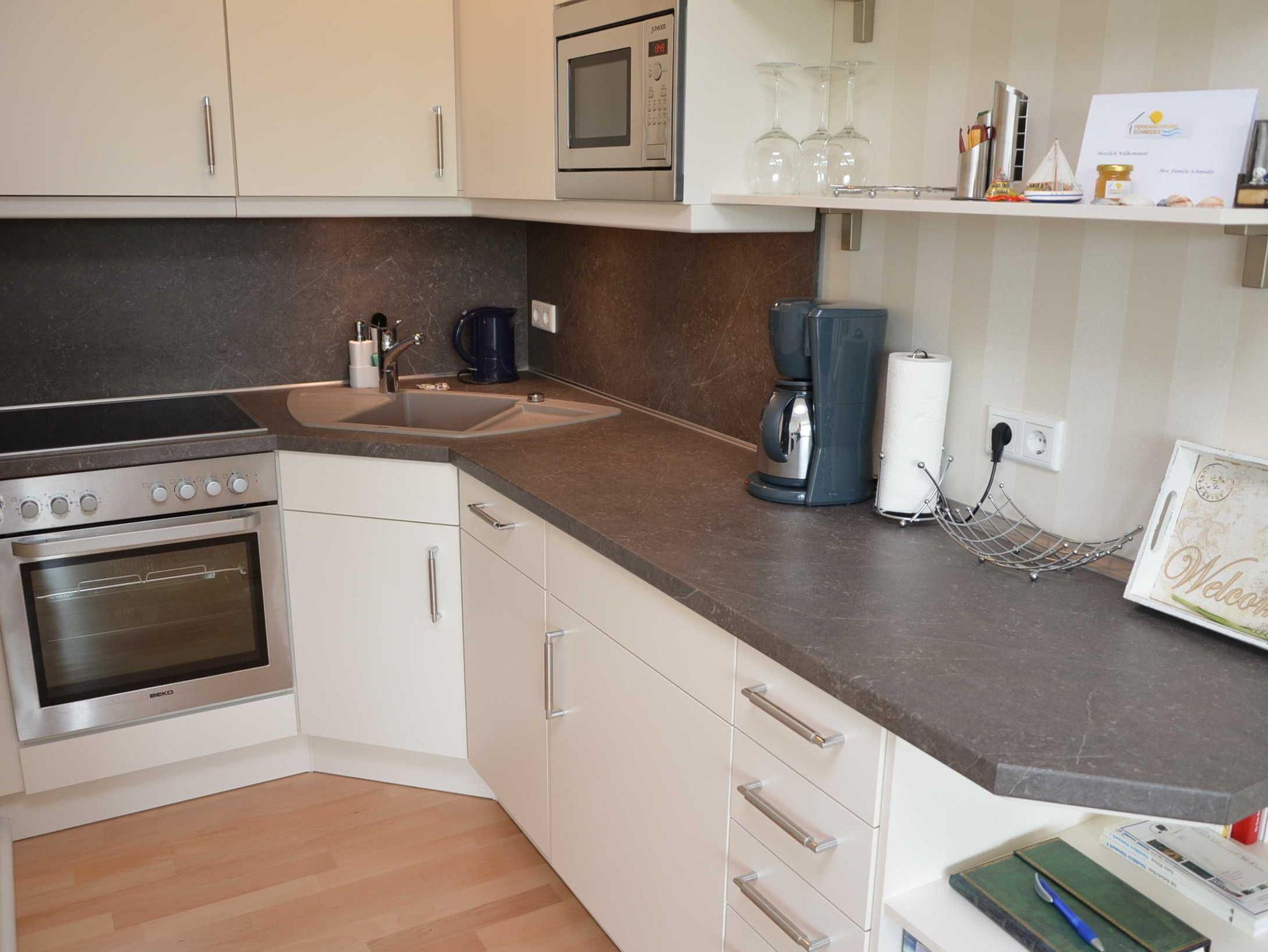 • Küche mit Kühlschrank/Gefrierfach, Ceranfeld, Backofen, Mikrowelle, Geschirrspüler, Wasserkocher, Kaffeemaschine, Toaster, hochwertigem Geschirr