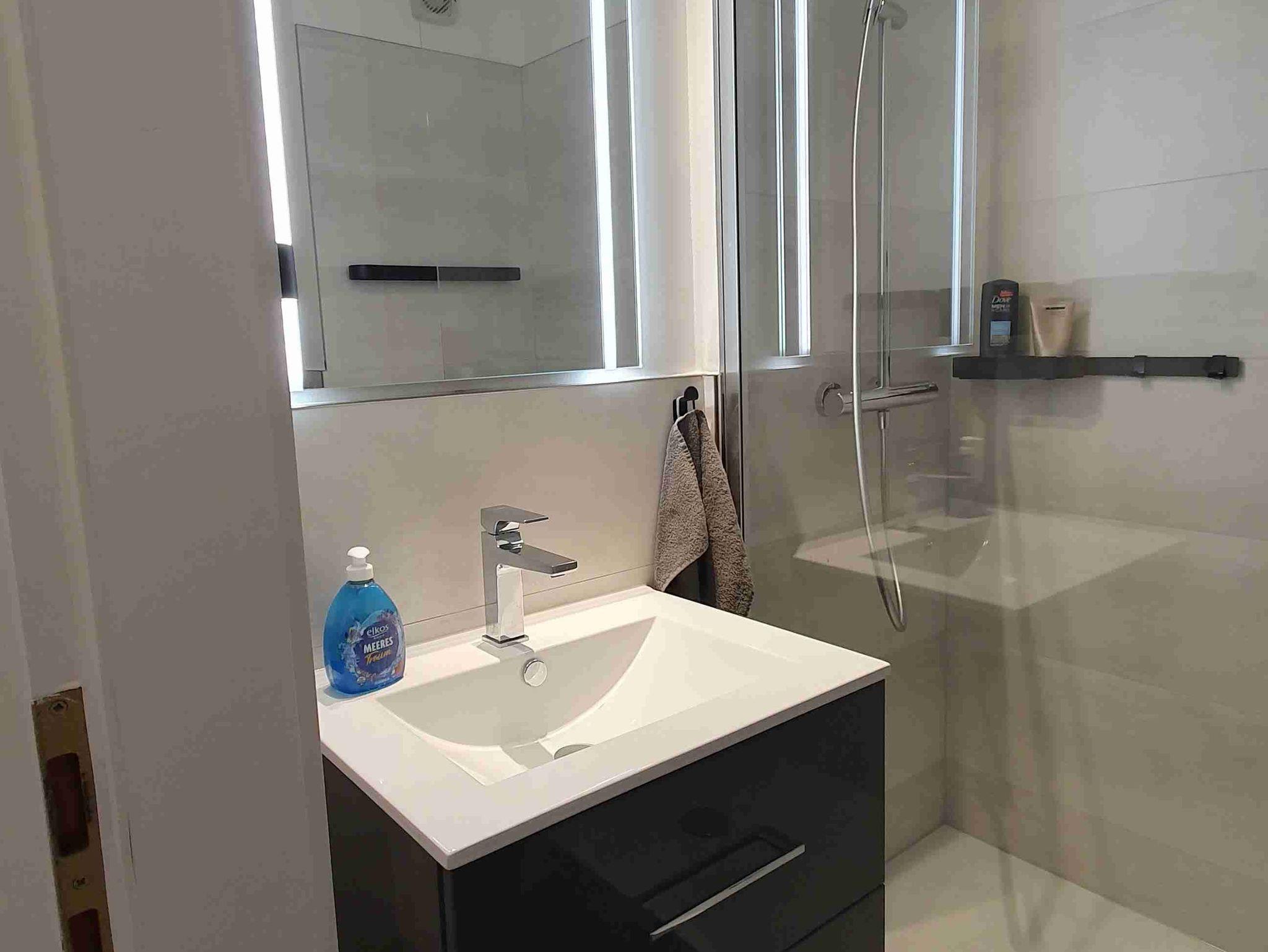 • Bad/WC mit begehbarer offener Regendusche (Walk-In), Fön