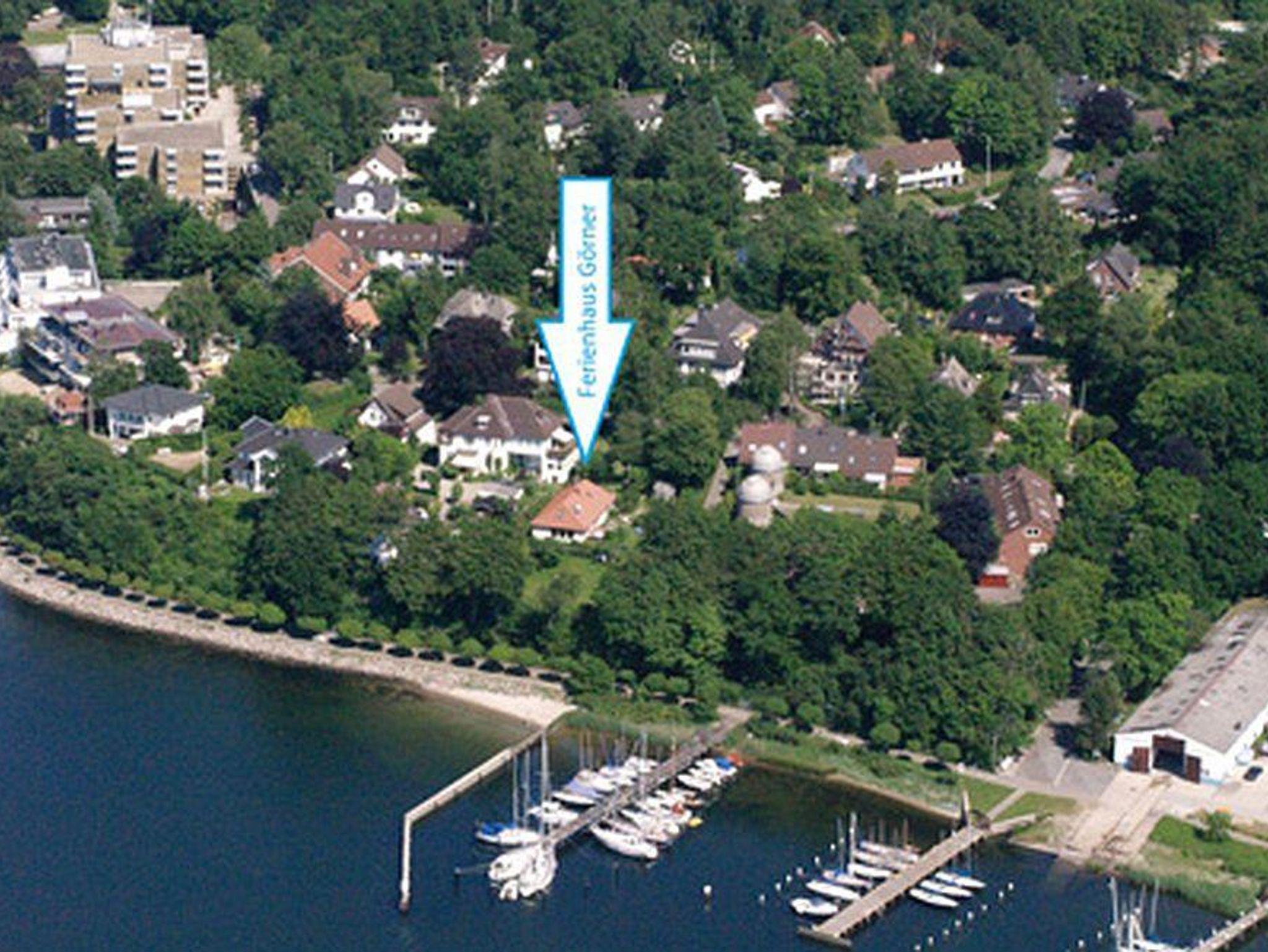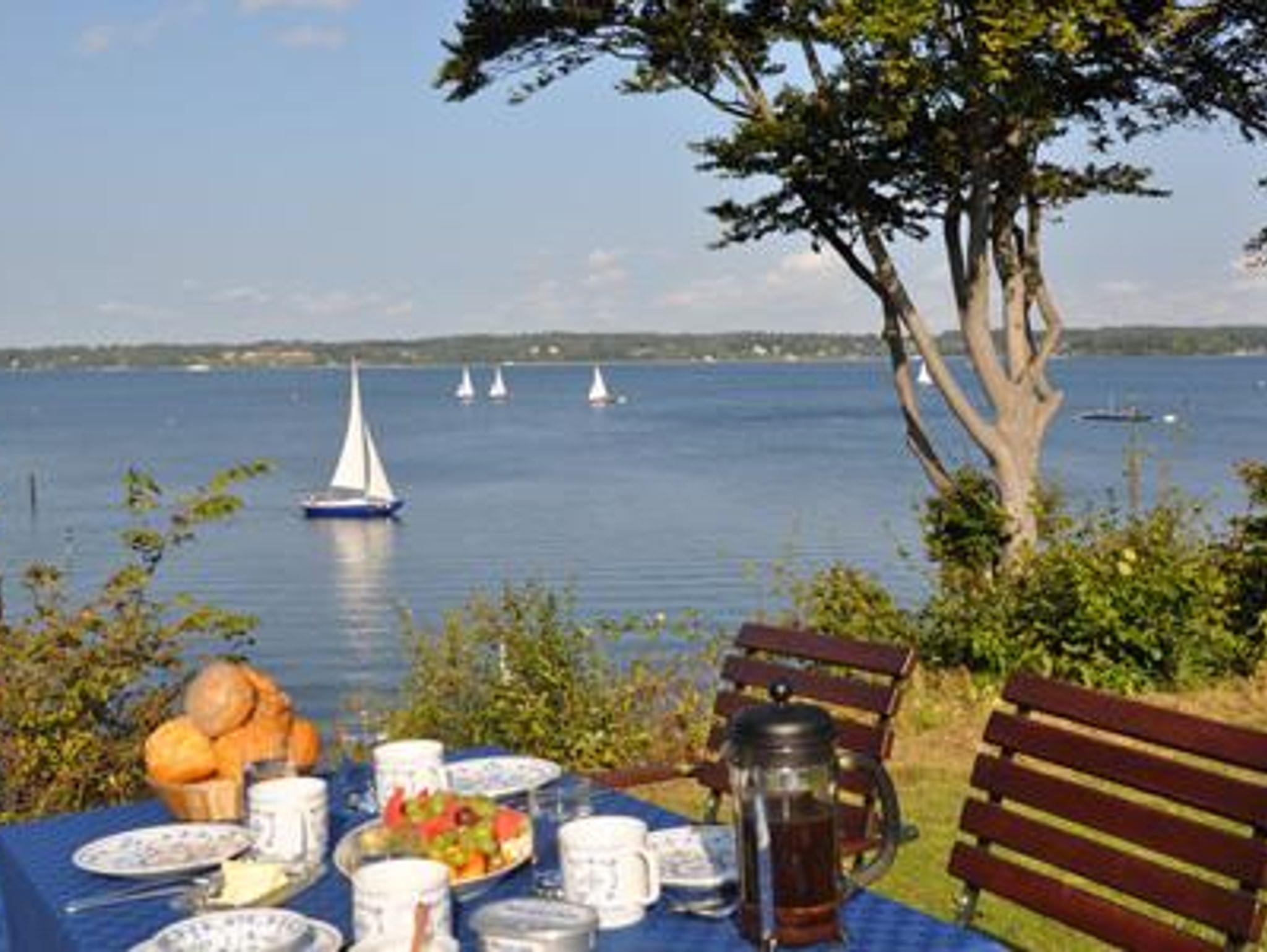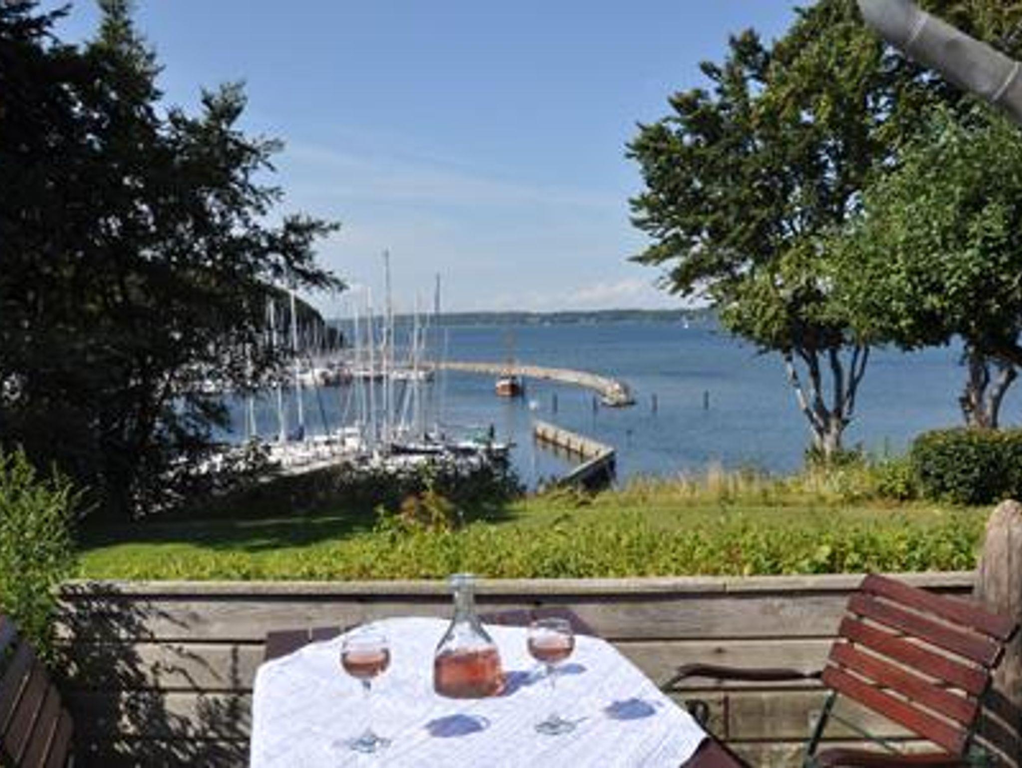 Die ruhig gelegene Ferienwohnung ist die größere (70 qm) von zwei Wohnungen (separate Eingänge) in einem frei stehenden eingeschössigen Haus auf einem 1200 qm großen Grundstück. Vom Wohnzimmer und der Terrasse kann man auf den Yachthafen und über die Flensburger Förde bis nach Dänemark blicken. Der große Garten mit Liegewiese fällt über einen Abhang direkt zum Strand ab.