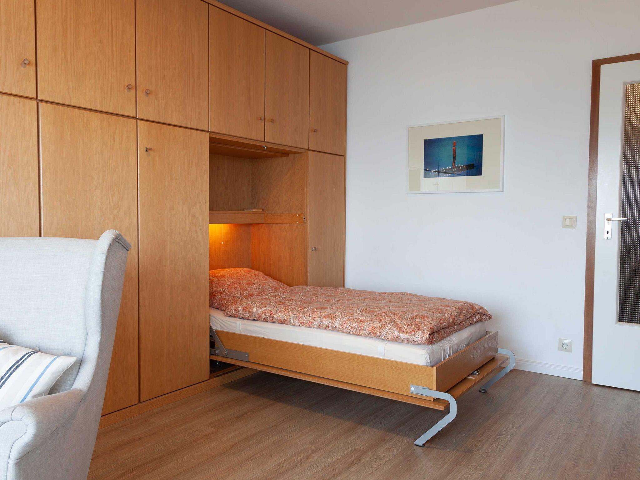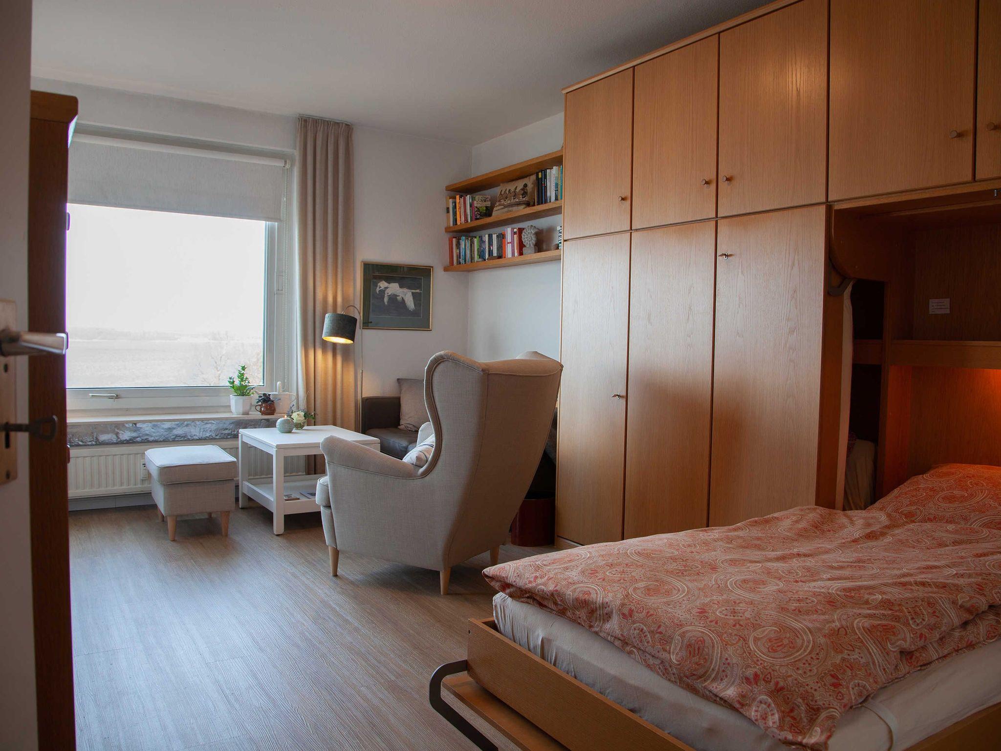 • Kombinierter Wohn- und Schlafraum (Schrankbett mit 2 Einzelbetten, Länge 2 Meter), Sofa und einem gemütlichen Ohrensessel mit passenden Hocker