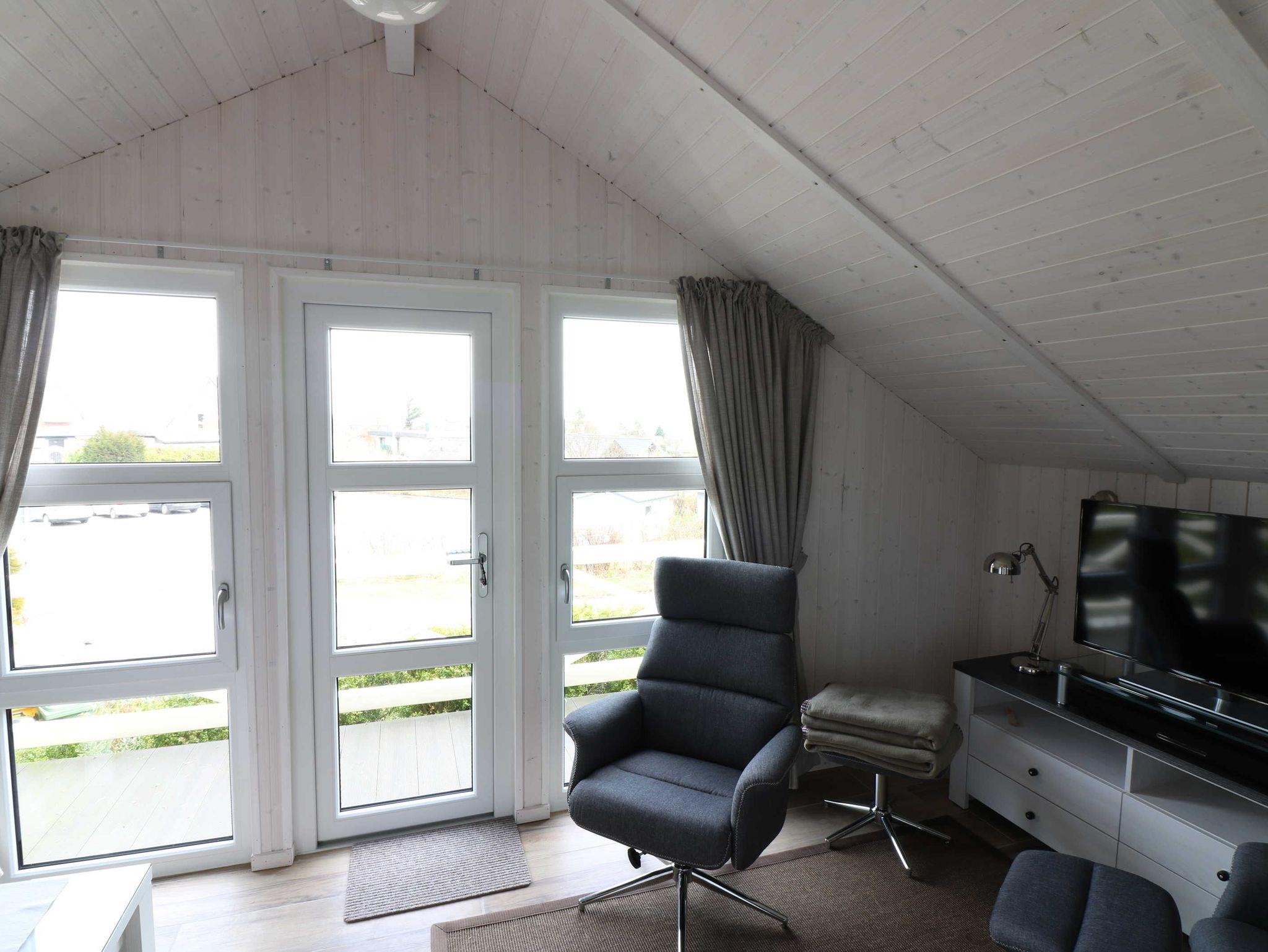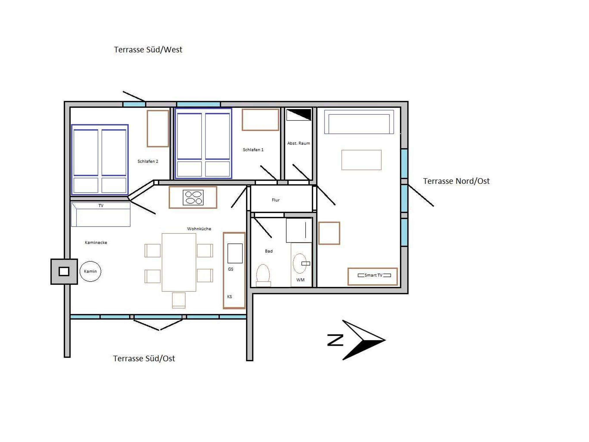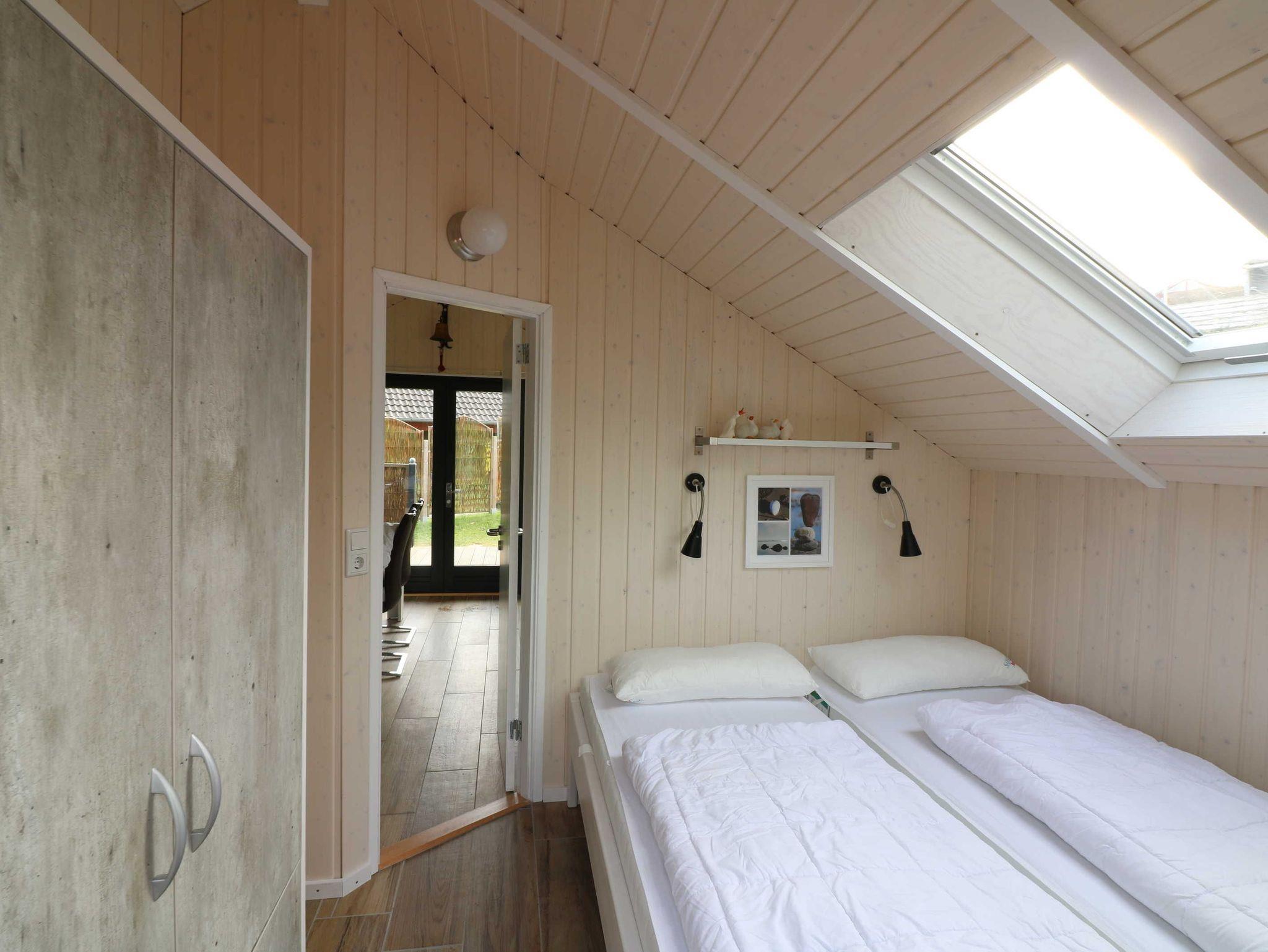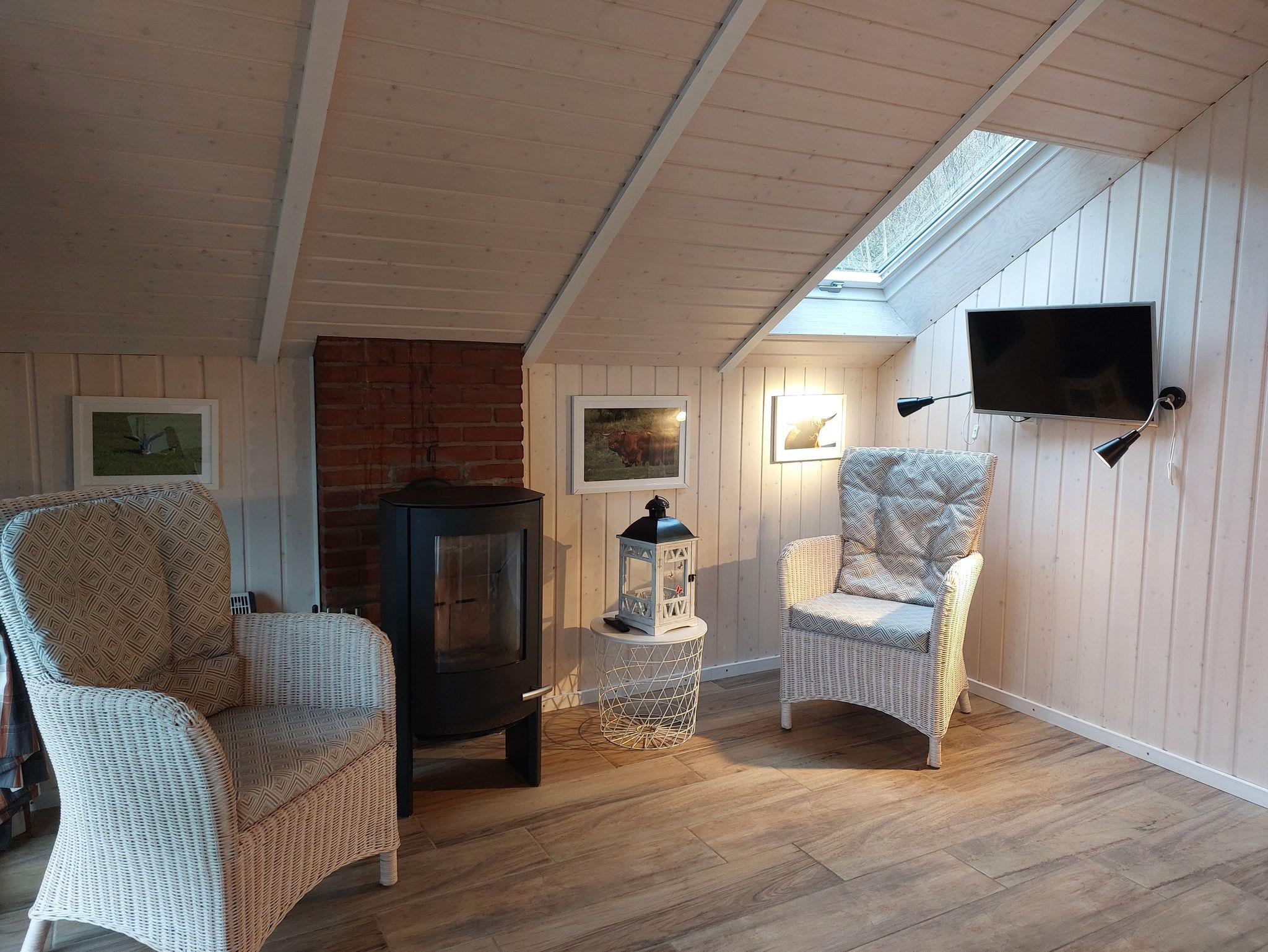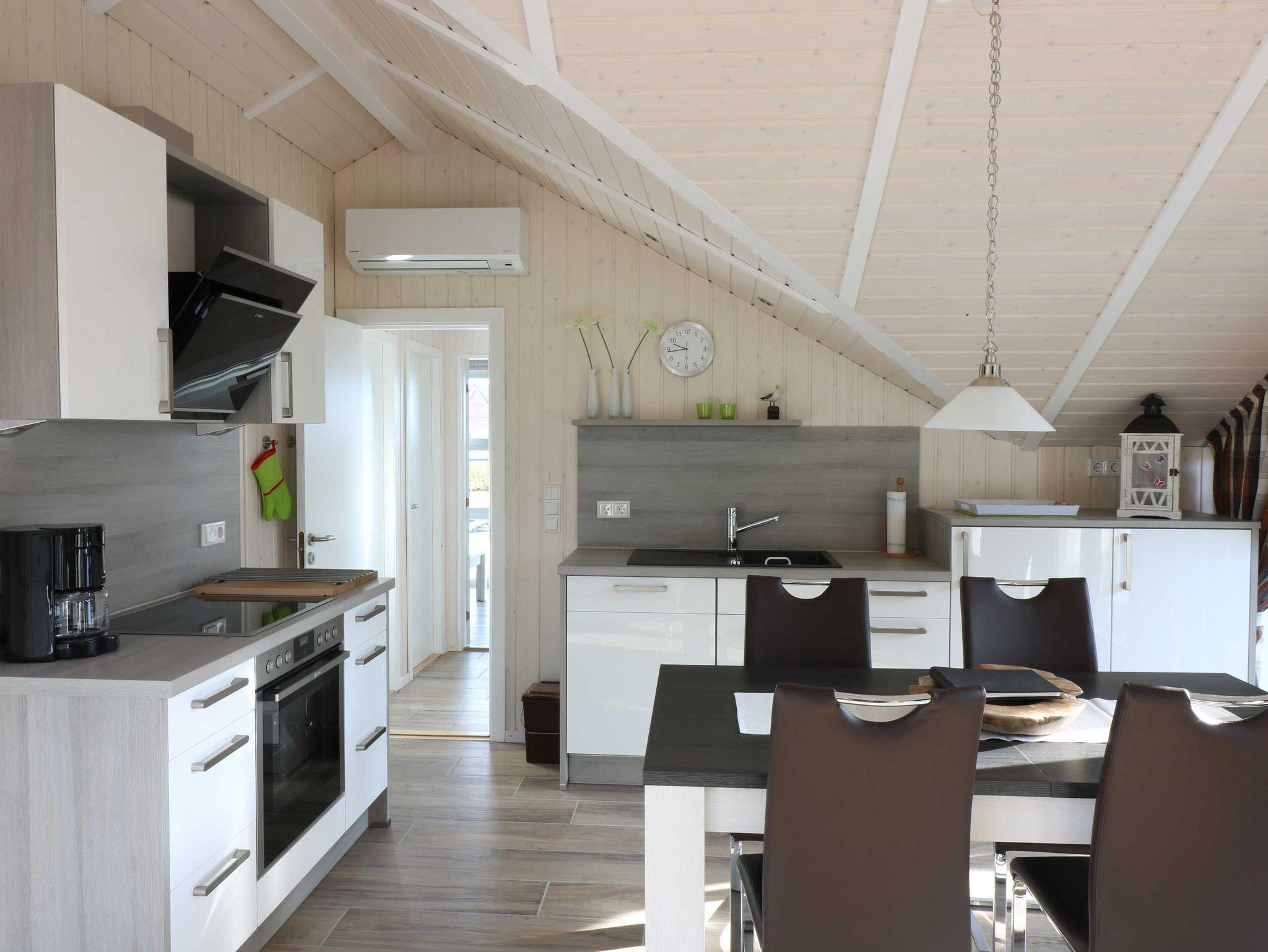 Auf 60 qm Grundfläche verteilen sich eine Wohnküche mit Essbereich, Schlafcouch und Kaminofen, ein separates Wohnzimmer, 2 Schlafzimmer mit Doppelbett (2x80x200 cm) und ein Duschbad mit Fußbodenheizung.