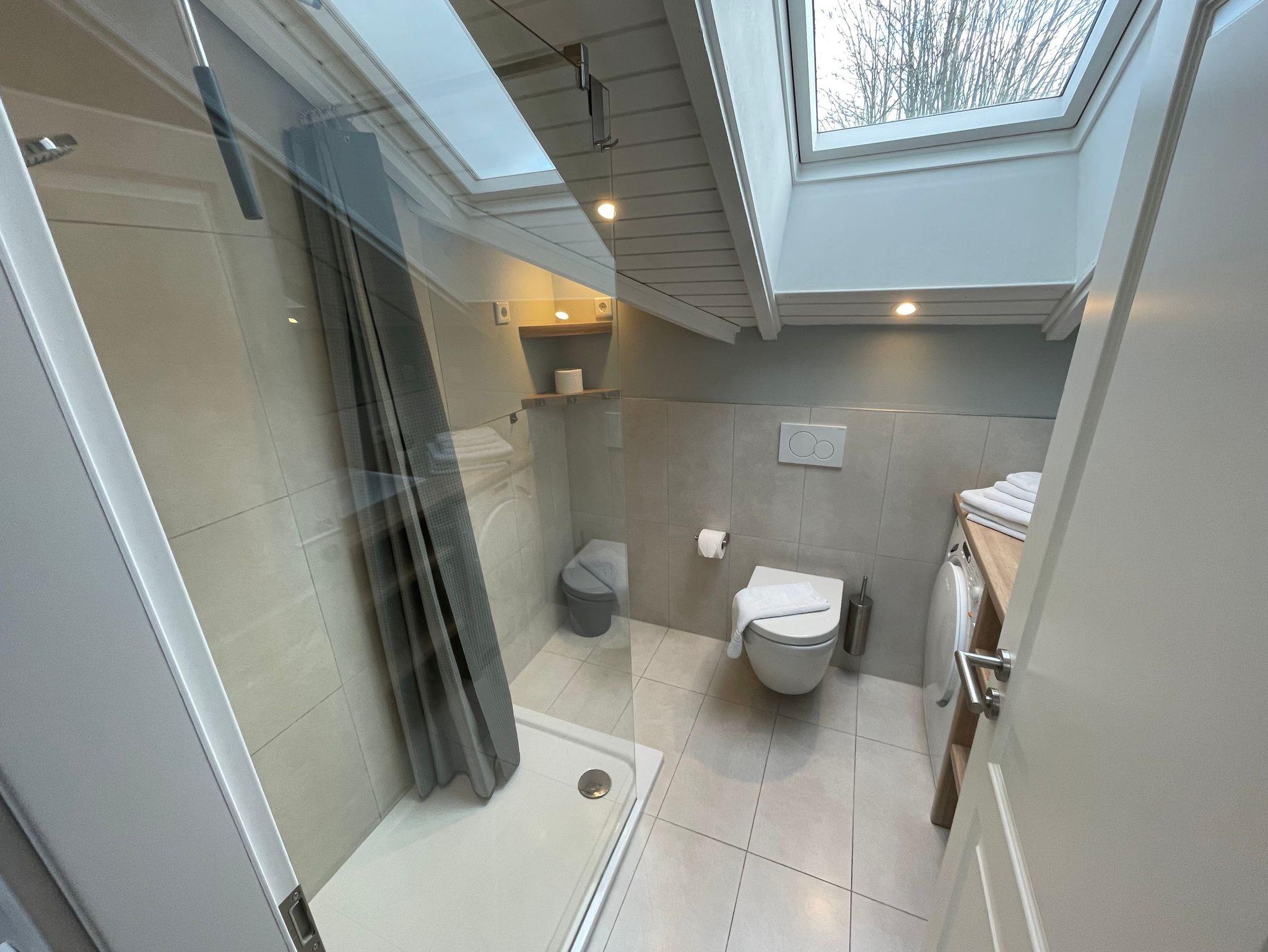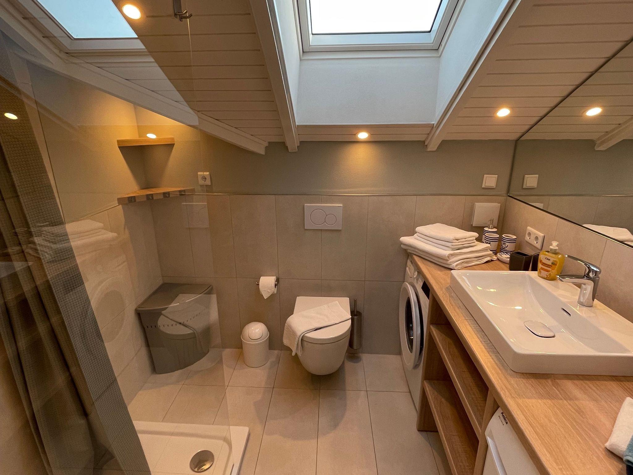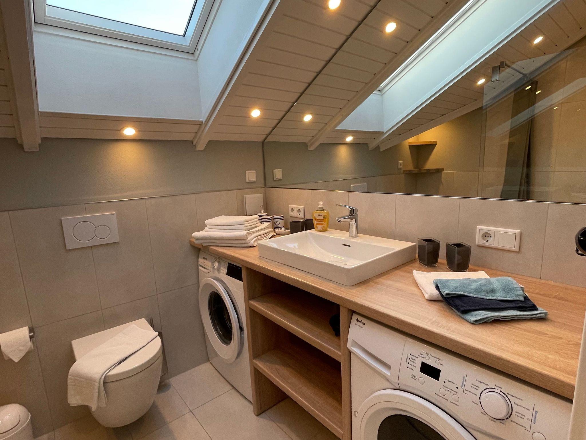 Das moderne Badezimmer bietet nicht nur viel Ablagefläche, sondern ist außerdem ausgestattet mit einer: Walk in Dusche, Waschmaschine und Trockner sowie heller und freundlicher Ausstattung ? ideal für längere Aufenthalte.