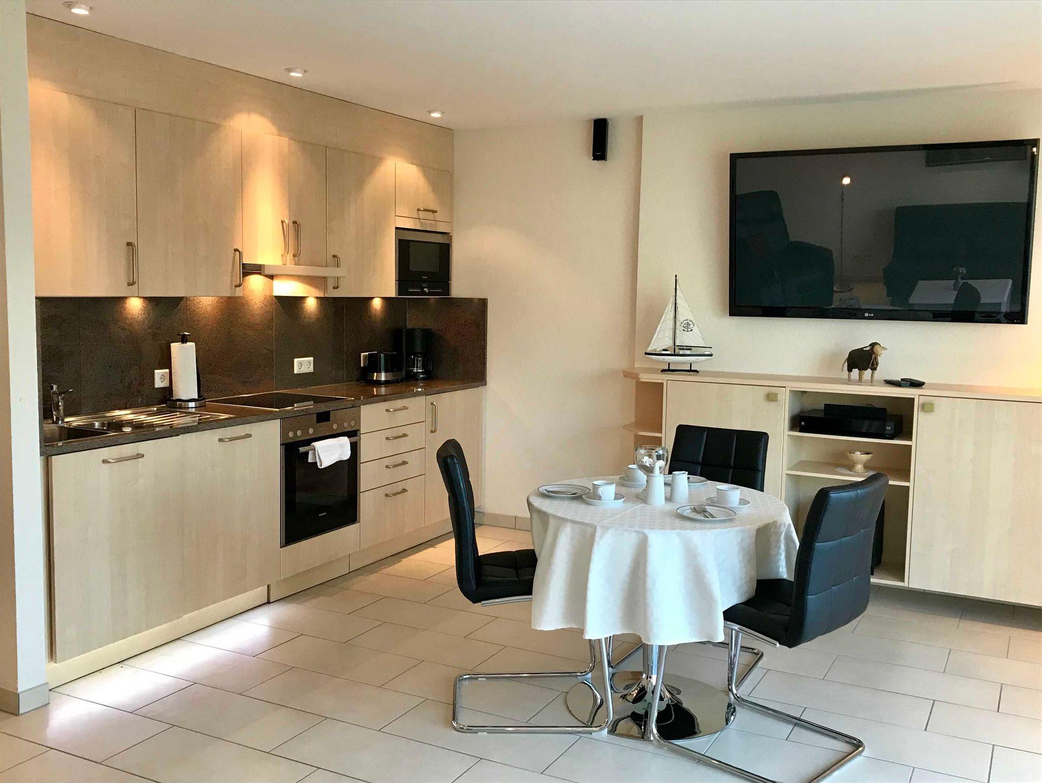 Die Ferienunterkunft verfügt über ein großes, sonniges Wohnzimmer, eine Einbauküche mit Spülmaschine, Mikrowelle, Kühlschrank und Einbauherd mit Cerankochfeld sowie über ein großzügiges Badezimmer mit großer, ebenerdiger Dusche mit WC und Bidet. Das Schlafzimmer ist ausgestattet mit einem Fernseher und einem angrenzenden Ankleidezimmer.