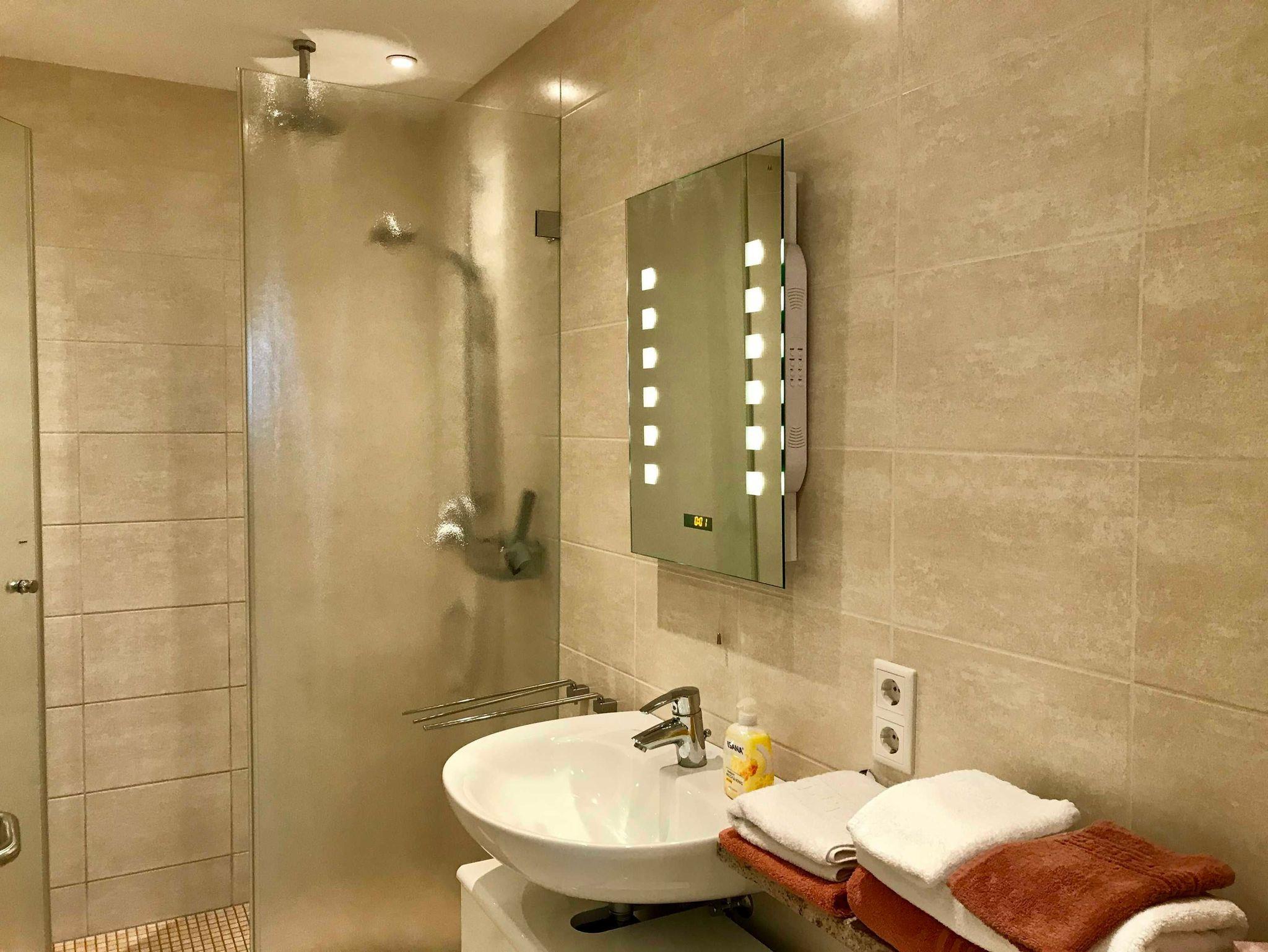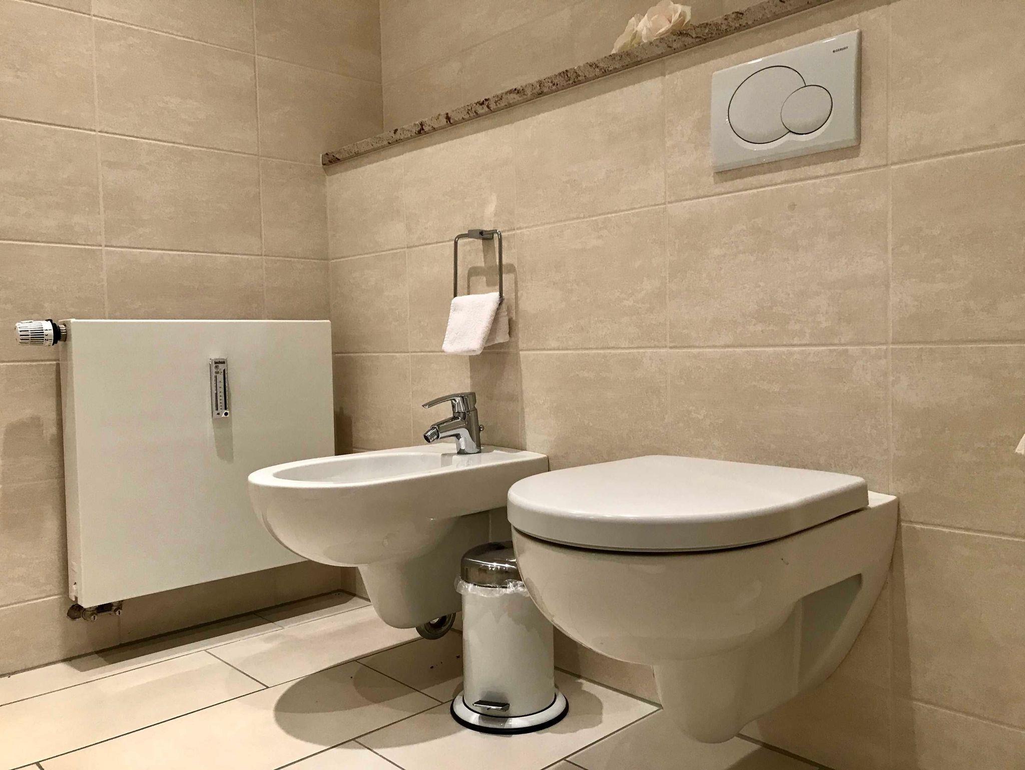 • 1 modernes Bad mit WC, Bidet, Waschtisch und sehr großer verglaster Dusche