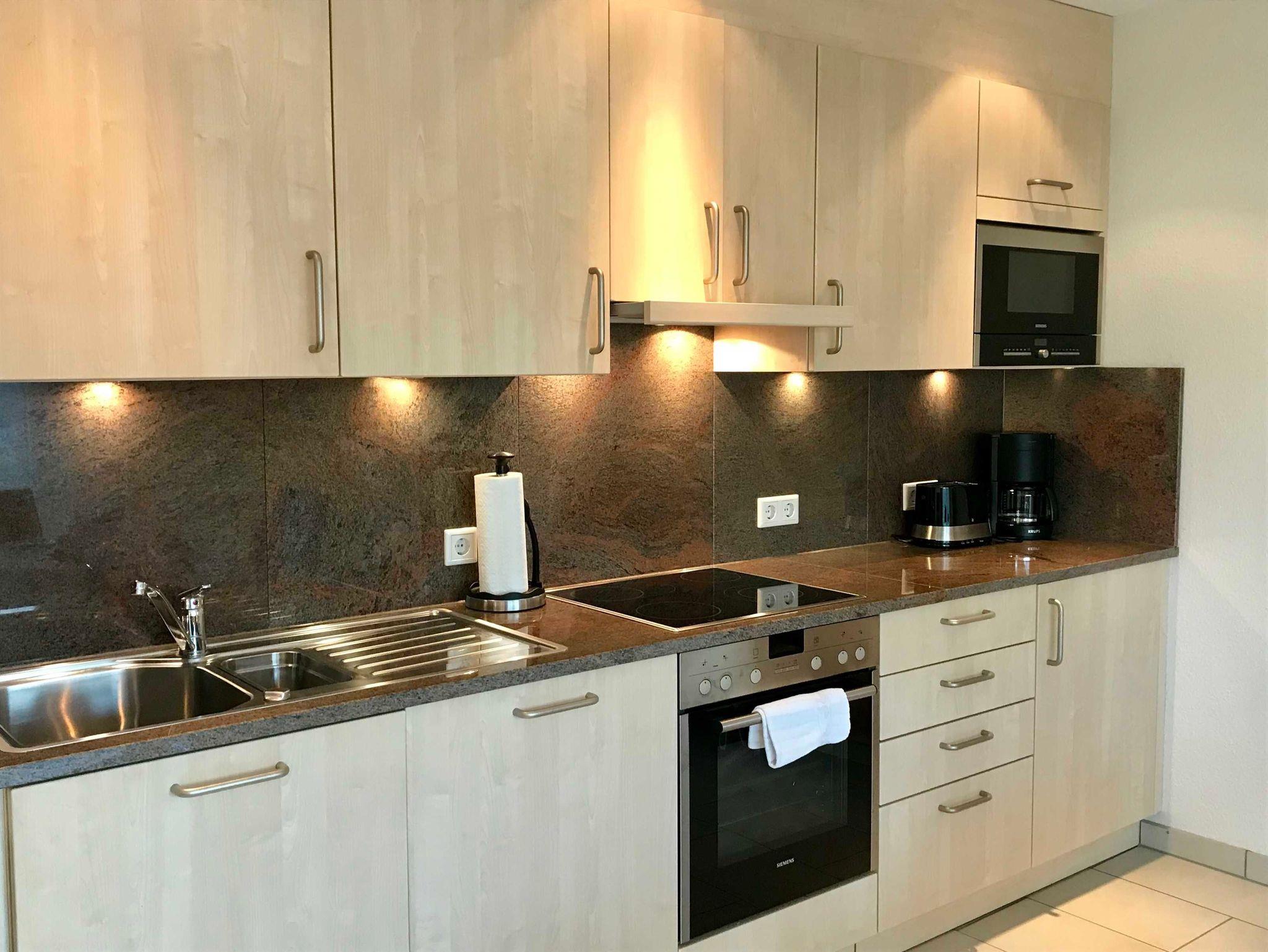 • integrierte komplett eingerichteter Küche mit Geschirrspüler, Mikrowelle, Kaffeemaschine, Wasserkocher, Toaster und Esstisch