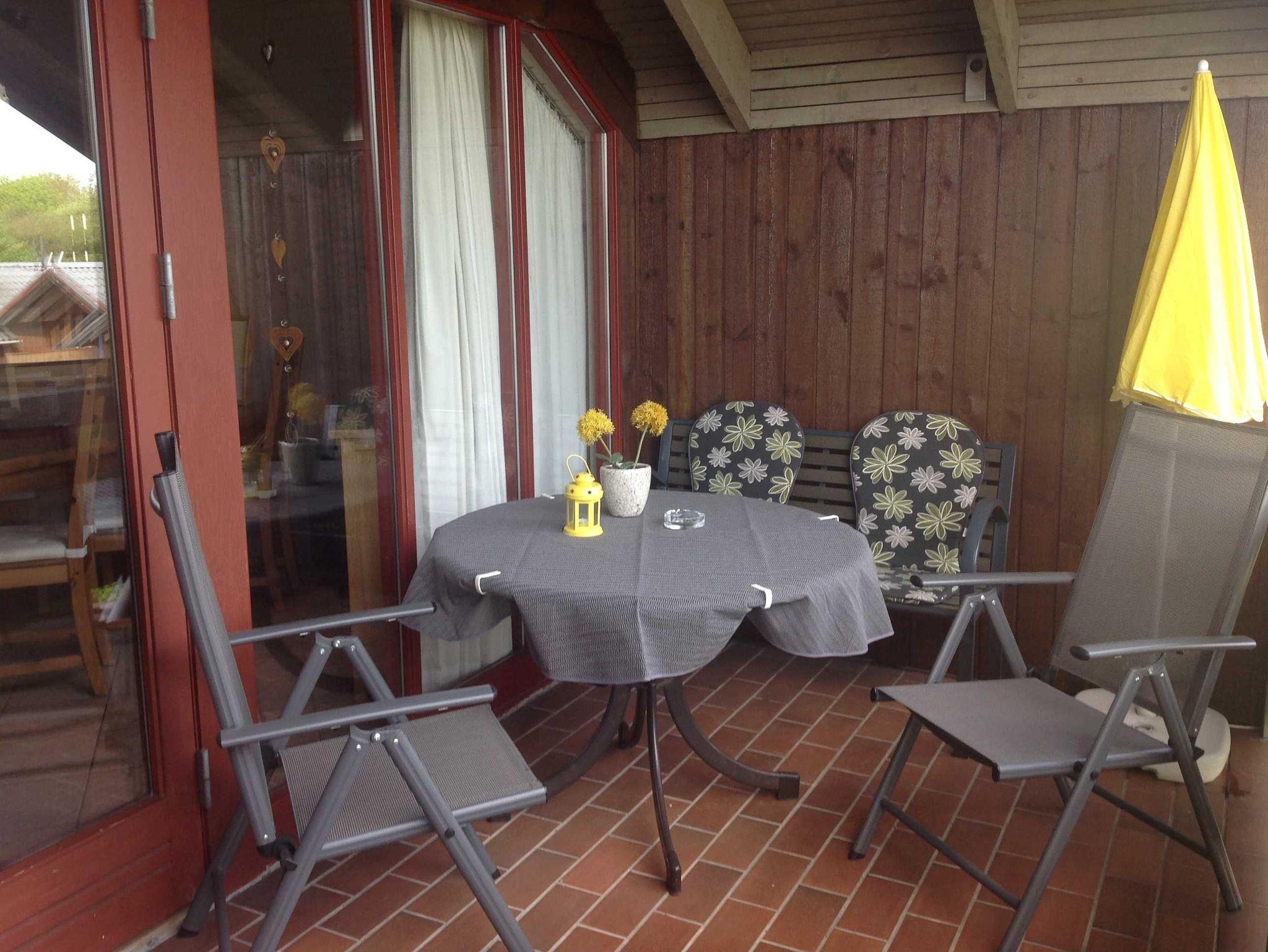• 1 großer Balkon mit Gartenmöbeln und Sonnenschirm