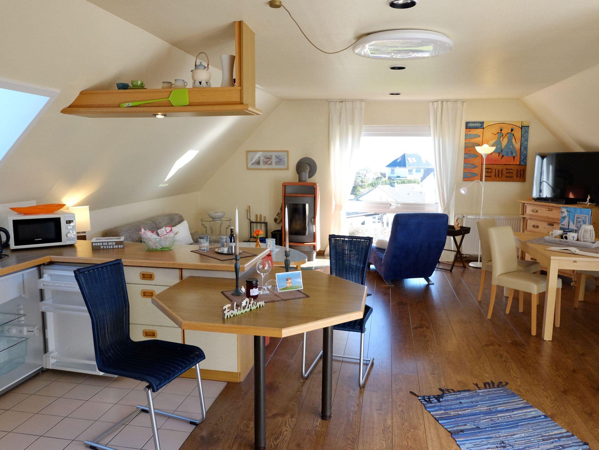 Die gemütliche und freundliche Ferienwohnung „Viola“ mit herrlichem Meerblick über die Flensburger Außenförde lädt zum Verweilen ein. Die gut ausgestattete Ferienwohnung trumpft nicht nur mit Ihrem Meerblick, sondern besticht auch für gemütliche Abendstunden am Kaminfeuer. Das kombinierte Wohn-, Küche und Esszimmer ist großzügig eingerichtet und durch die Schrägen wird die Grundfläche optimal ausgenutzt. Es gibt ein separates Schlafzimmer für 2 Personen, ein Badezimmer mit Dusche, Badewanne und WC. Im Falle einer Belegung bis 4 Personen ist eine Couch als Schlafcouch im Wohnzimmer vorhanden. Die sonnige Loggia, der PKW-Stellplatz und eine sichere Unterstellmöglichkeit für Fahrräder runden das Gesamtbild ab.