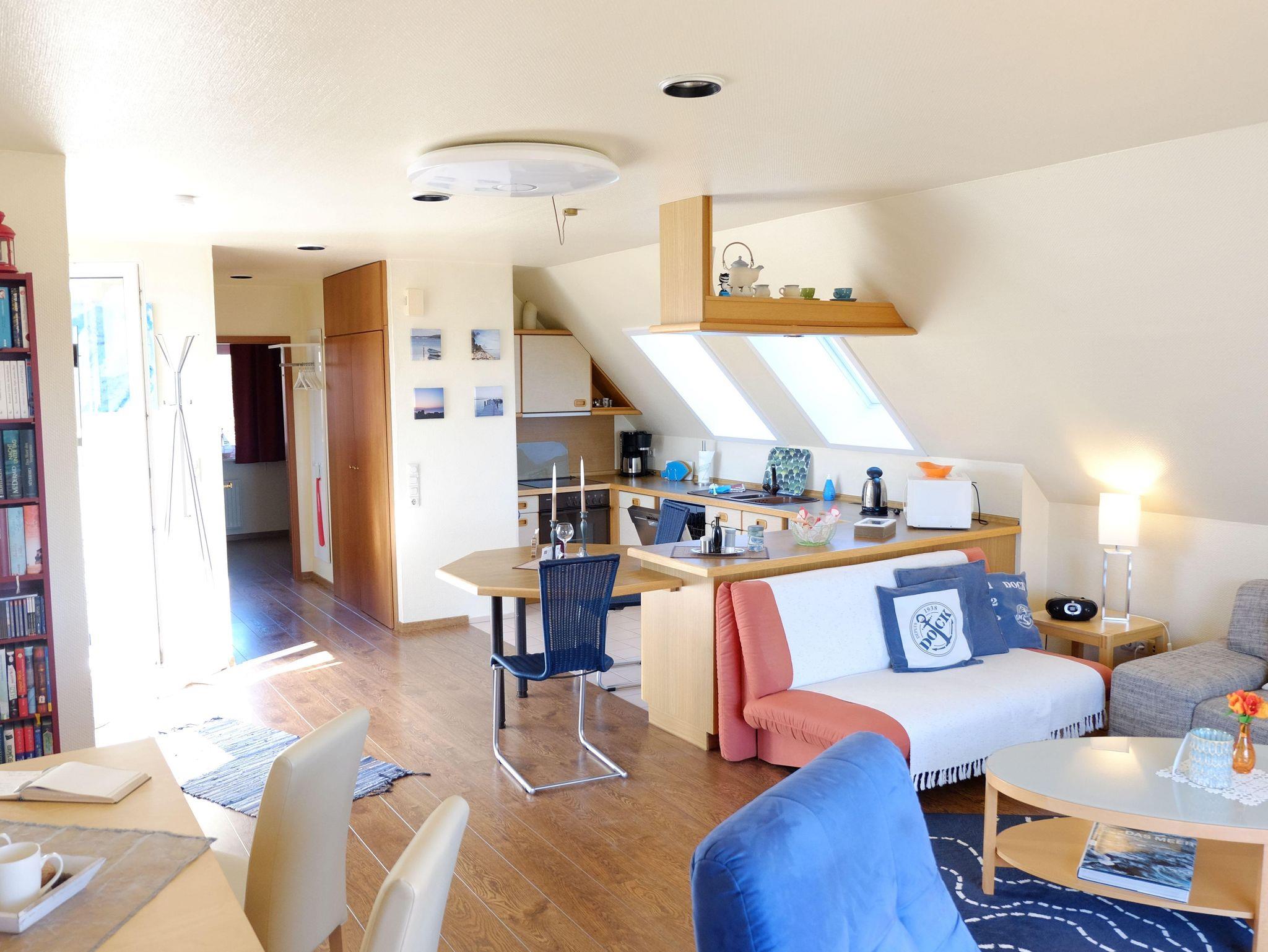• 1 Wohnzimmer mit Schlafcouch (140 x 200cm), Kaminofen, Meerblick, Fernseher, DVD player, Spiele, Bücher für Jund und Alt.