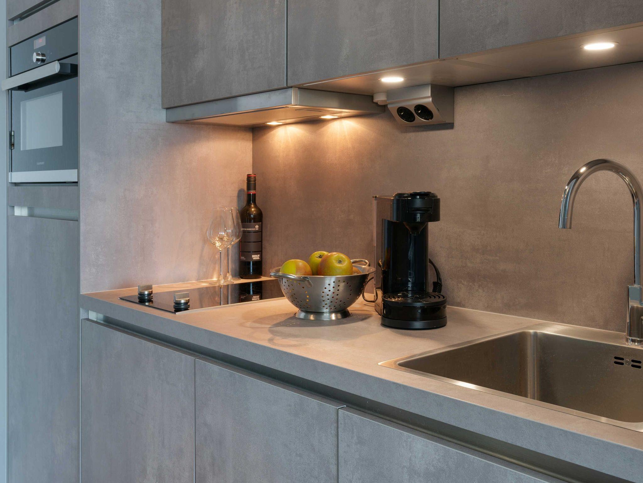 Der kombinierte Wohn-/ Schlafbereich ist hochwertig eingerichtet. Neben einem Doppelbett findet sich ein kleiner Essplatz und ein Sofa, das bei Bedarf noch zwei Schlafgelegenheiten extra bietet. Wer Lust auf Kochen hat, findet in der Küche alles, was er braucht.