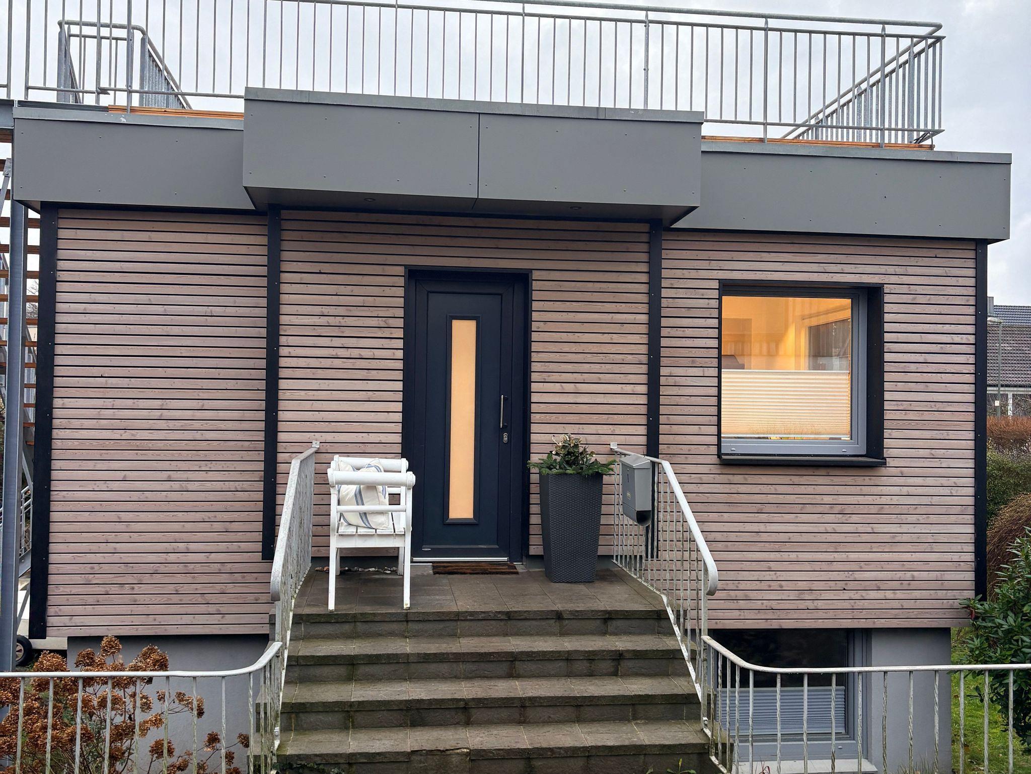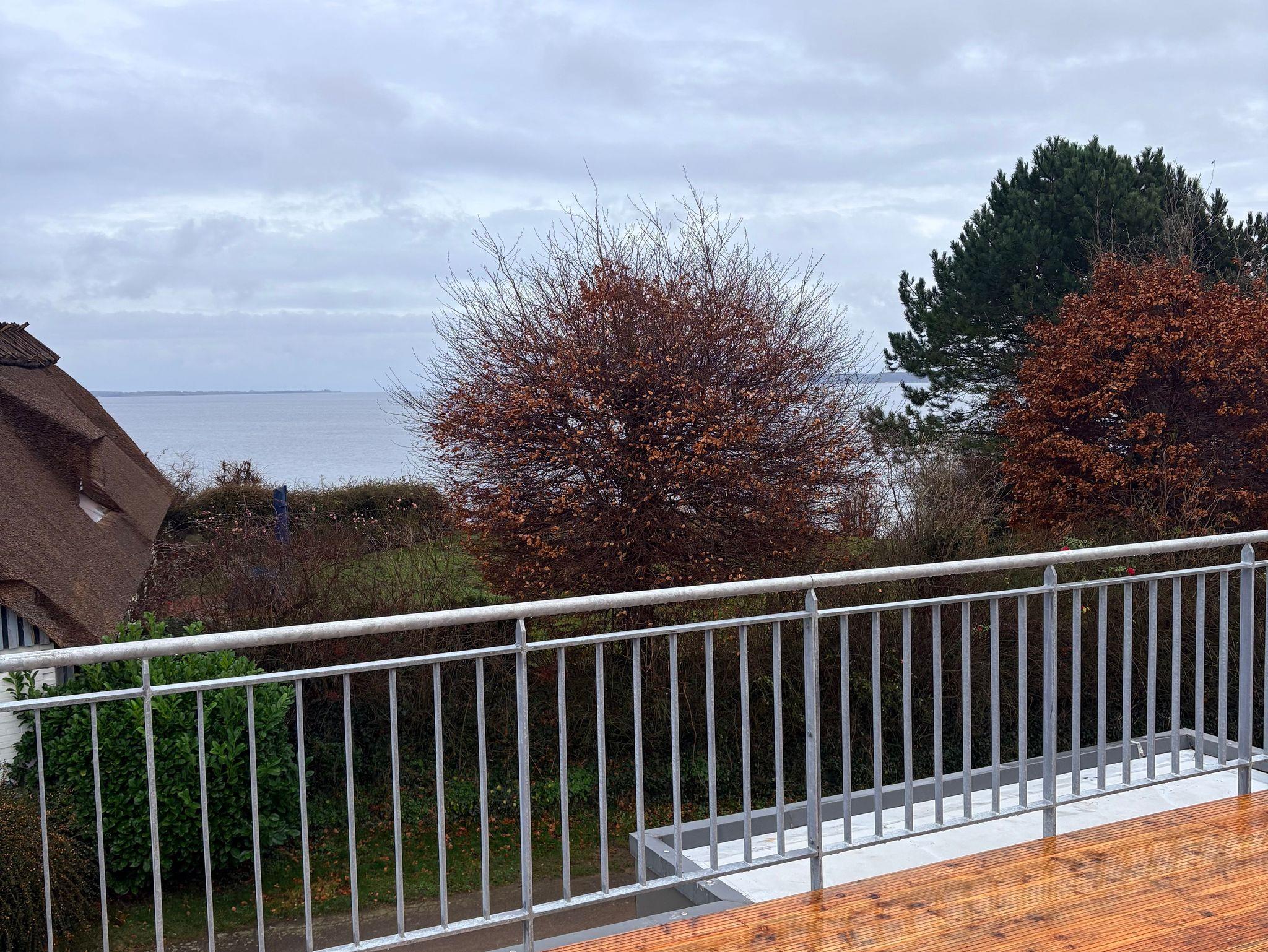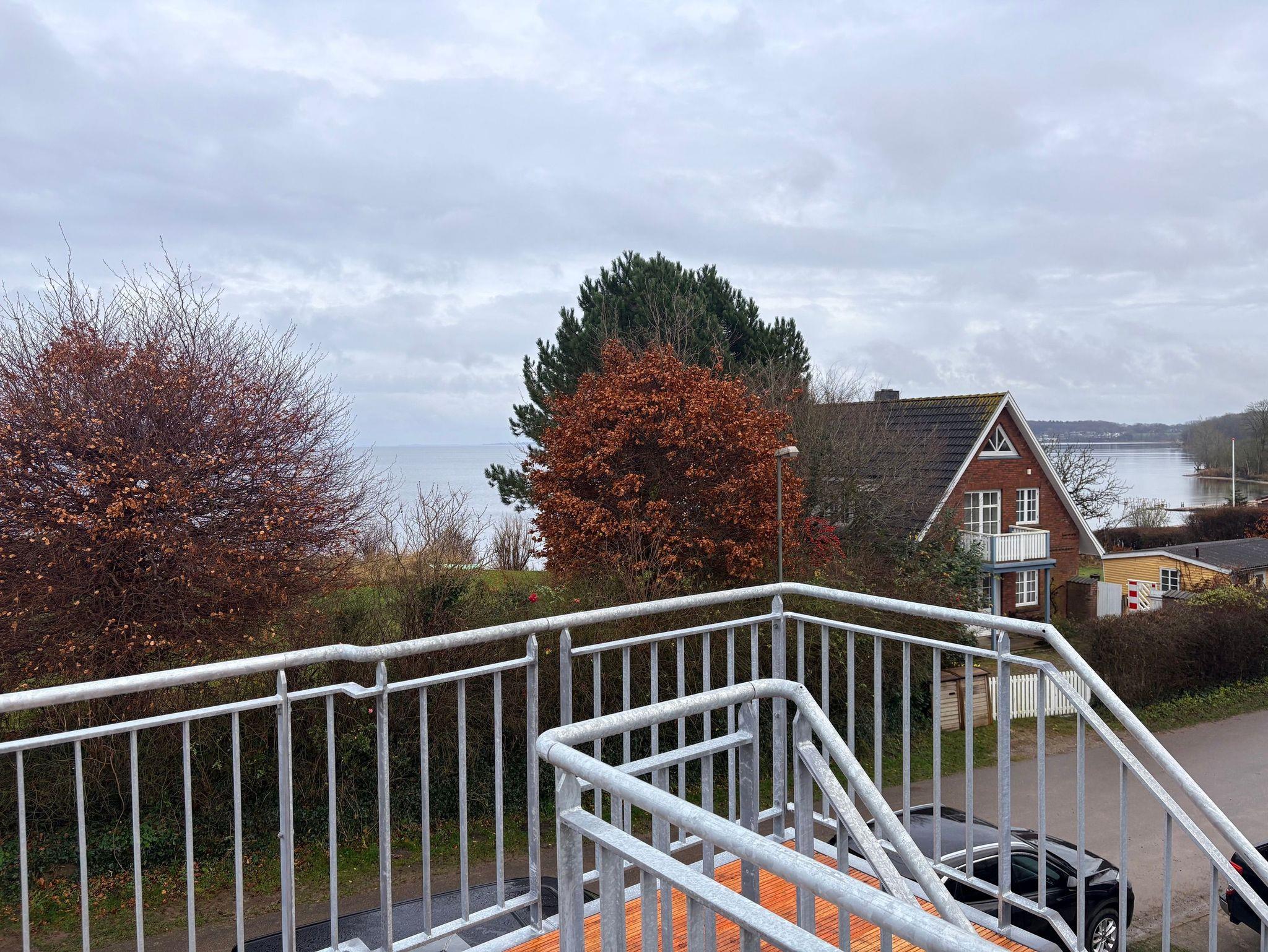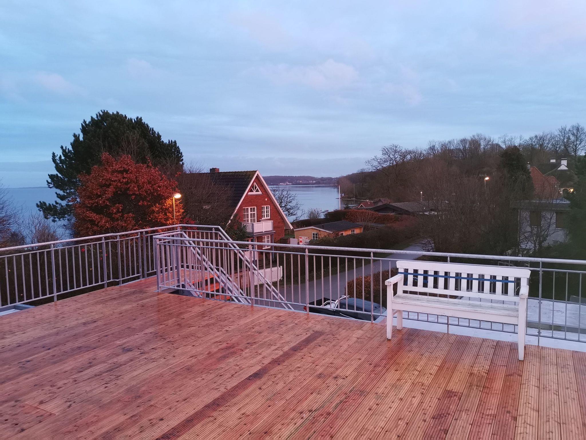 Vom Wohnbereich geht es über eine Terrasse hoch auf die 45m² große Dachterrasse mit Blick auf die Flensburger Förde.