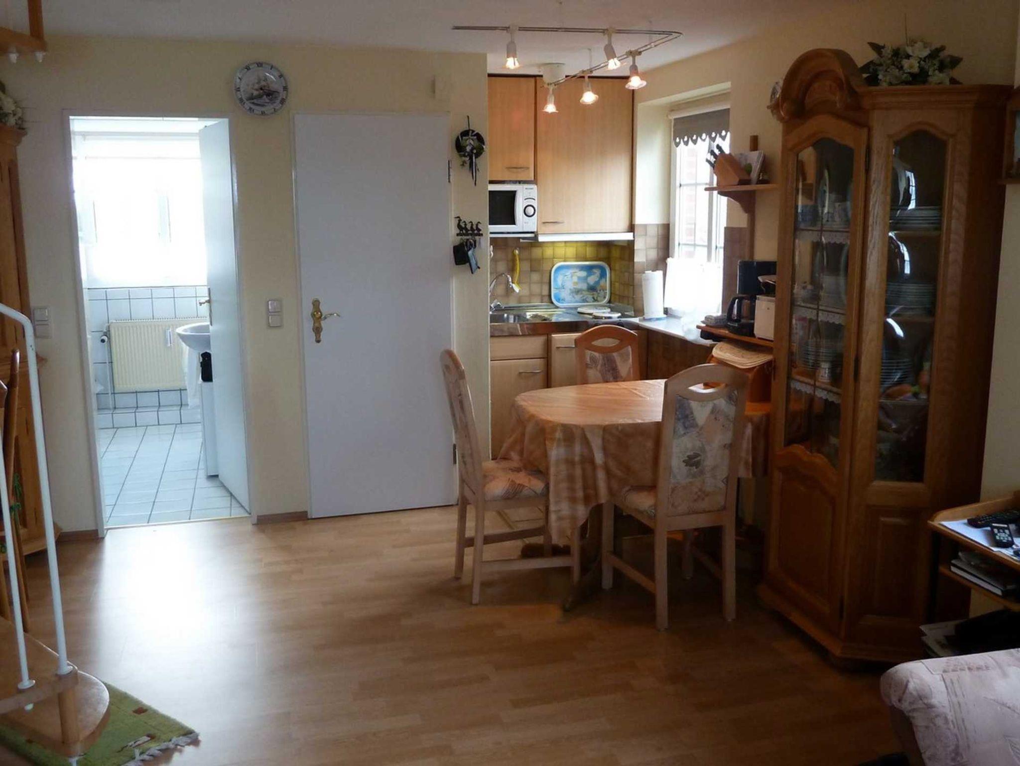Die Ferienwohnung liegt im Obergeschoss und ist für maximal 3 Personen geeignet. Das Wohnzimmer mit Kochecke, das Schlafzimmer, ein Badezimmer und ein Gäste-WC bieten allen Komfort. Zur Mitbenutzung stehen im Nebengebäude Trockner und Waschmaschine zur Verfügung.