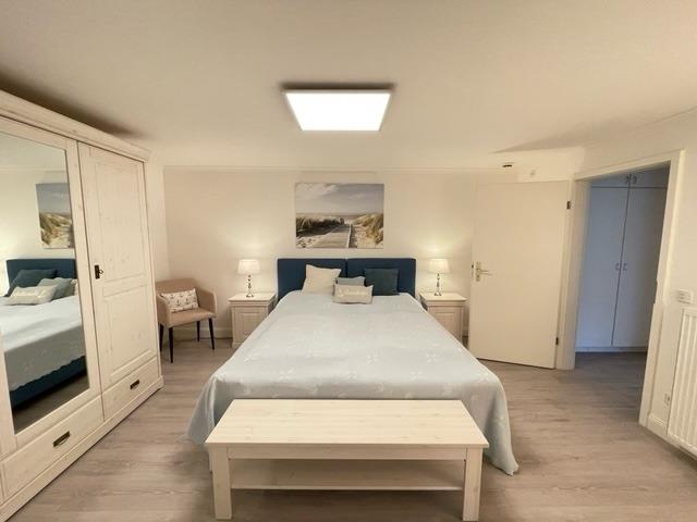 Die Ferienwohnung verfügt über zwei geschmackvoll eingerichtete Schlafzimmer. Beide sind mit komfortablen Doppelbetten (180x200 cm) ausgestattet und bieten höchsten Schlafkomfort. Ein Schlafzimmer ist zusätzlich mit einem Fernseher ausgestattet, sodass Sie sich gemütlich im Bett entspannen und Ihre Lieblingssendungen genießen können. Alle Zimmer sind mit modernen Plissees versehen, die nicht nur vor unerwünschtem Licht schützen, sondern auch einen eleganten Look verleihen. Das zweite Schlafzimmer ist innenliegend und hat kein Fenster.