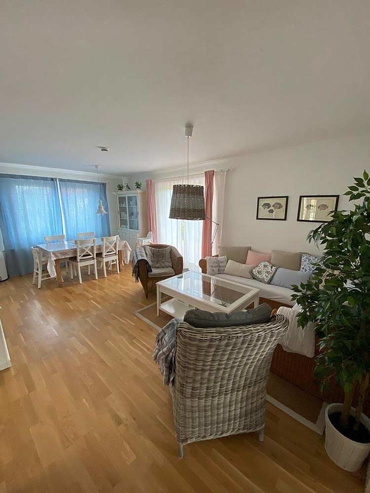 Der gemütliche Wohnbereich ist mit einem bequemen Sofa und einem modernen, streamingfähigen Fernseher ausgestattet. Bücher und Spiele stehen für kurzweilige Abende bereit, während das Glasfaser-WLAN jederzeit für eine schnelle Internetverbindung sorgt.