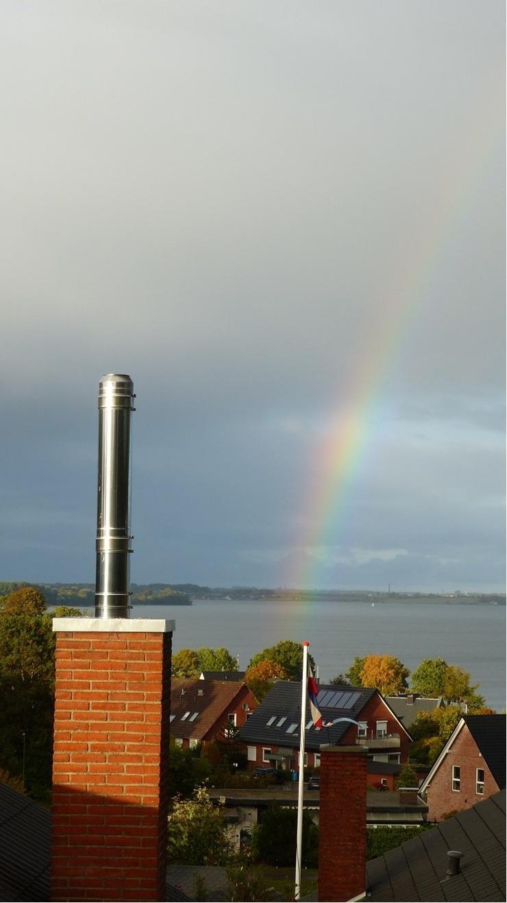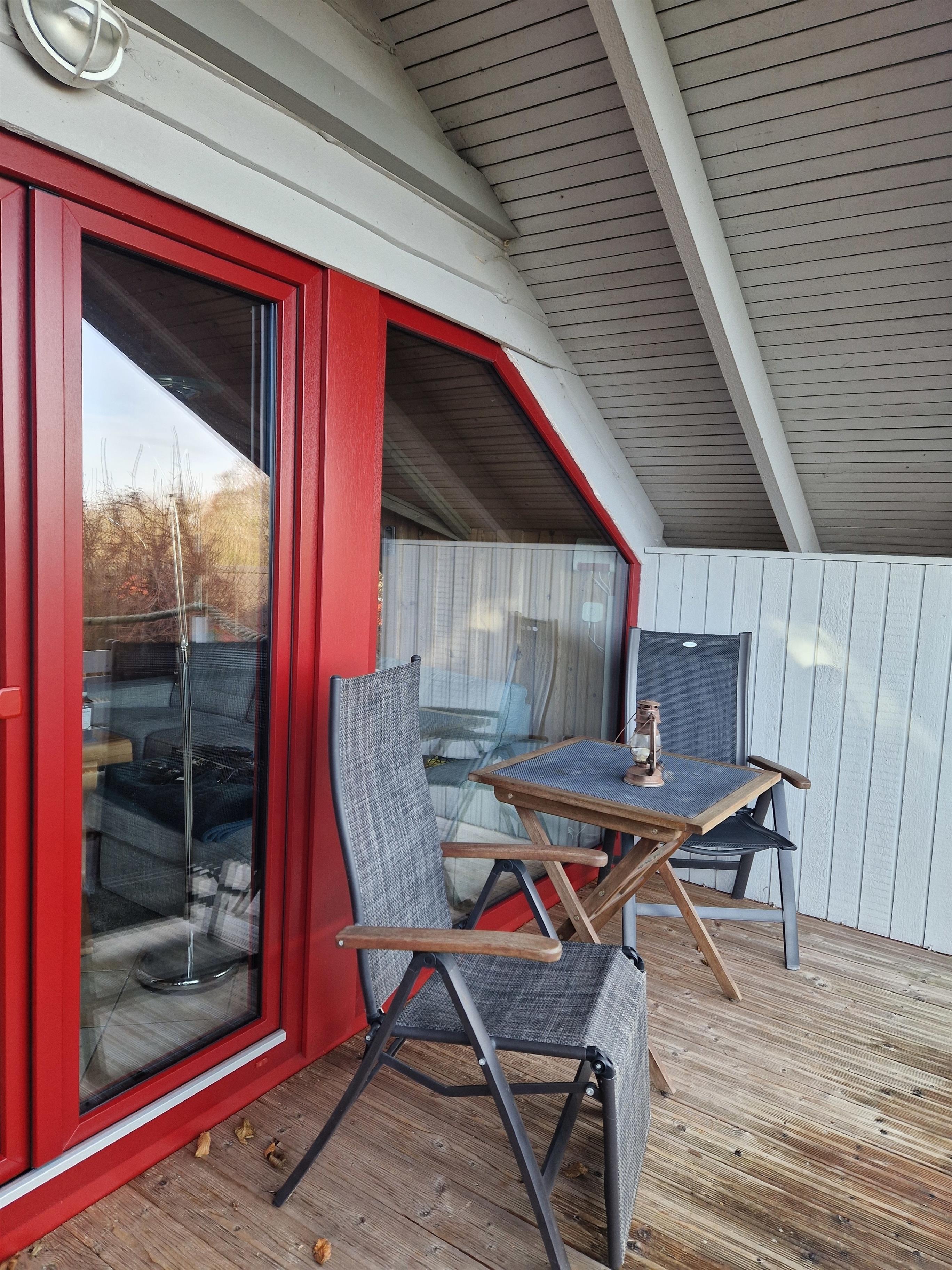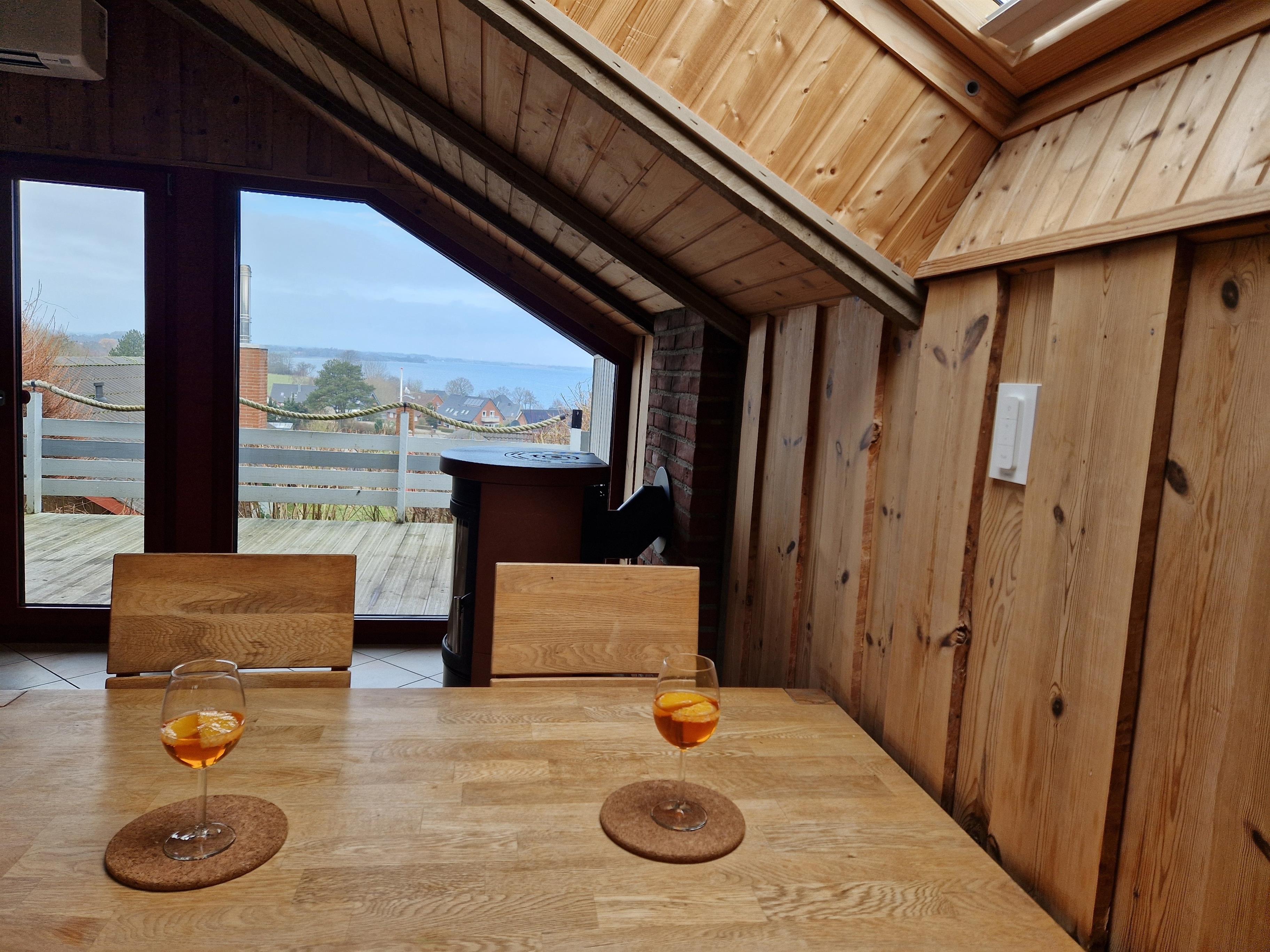 Der Wohnbereich ist ein behaglicher Rückzugsort mit bequemen Sofas, einem großen Esstisch und einem Kaminofen, der an kühleren Tagen für wohlige Wärme sorgt. Dank der großen Fensterfronten können Sie von hier aus die wunderschöne Landschaft und das wechselnde Spiel des Lichts auf der Förde genießen. Für Unterhaltung sorgen ein Flachbild-TV mit Sat-Empfang, ein DVD-Player und ein Bluetooth-Speaker für Ihre Lieblingsmusik.