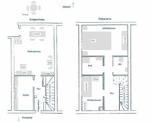 Die ca. 60 qm große Ferienwohnung erstreckt sich über zwei Etagen und bietet Platz für bis zu vier Personen. Im Erdgeschoss erwartet Sie ein großzügiges Wohn-Esszimmer, das mit einem gemütlichen Sofa, einem Fernseher sowie einer Auswahl an Gesellschaftsspielen und Büchern ausgestattet ist. Hier können Sie entspannen und die Zeit mit Ihren Liebsten genießen. Der direkte Zugang zum Garten ermöglicht es Ihnen, die frische Meeresluft zu genießen und auf den Gartenmöbeln die Sonne zu tanken, während Sie den Blick über das Meer schweifen lassen. Die voll ausgestattete Küche im Erdgeschoss bietet Ihnen alle Annehmlichkeiten, um köstliche Mahlzeiten zuzubereiten.