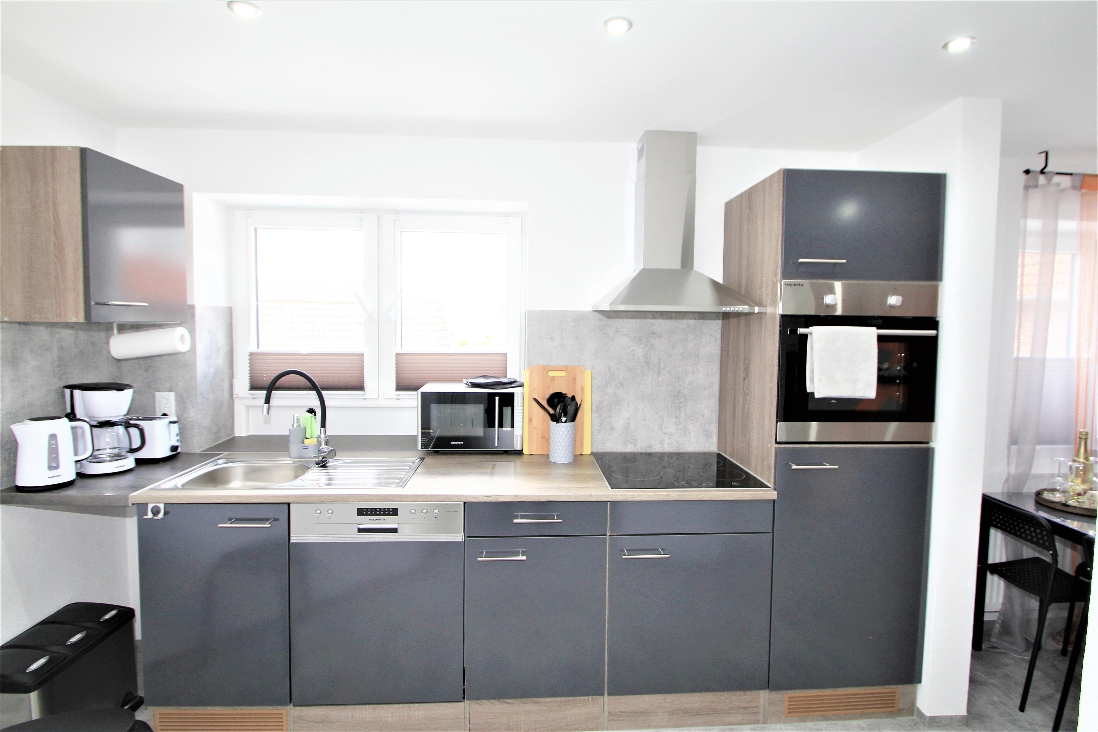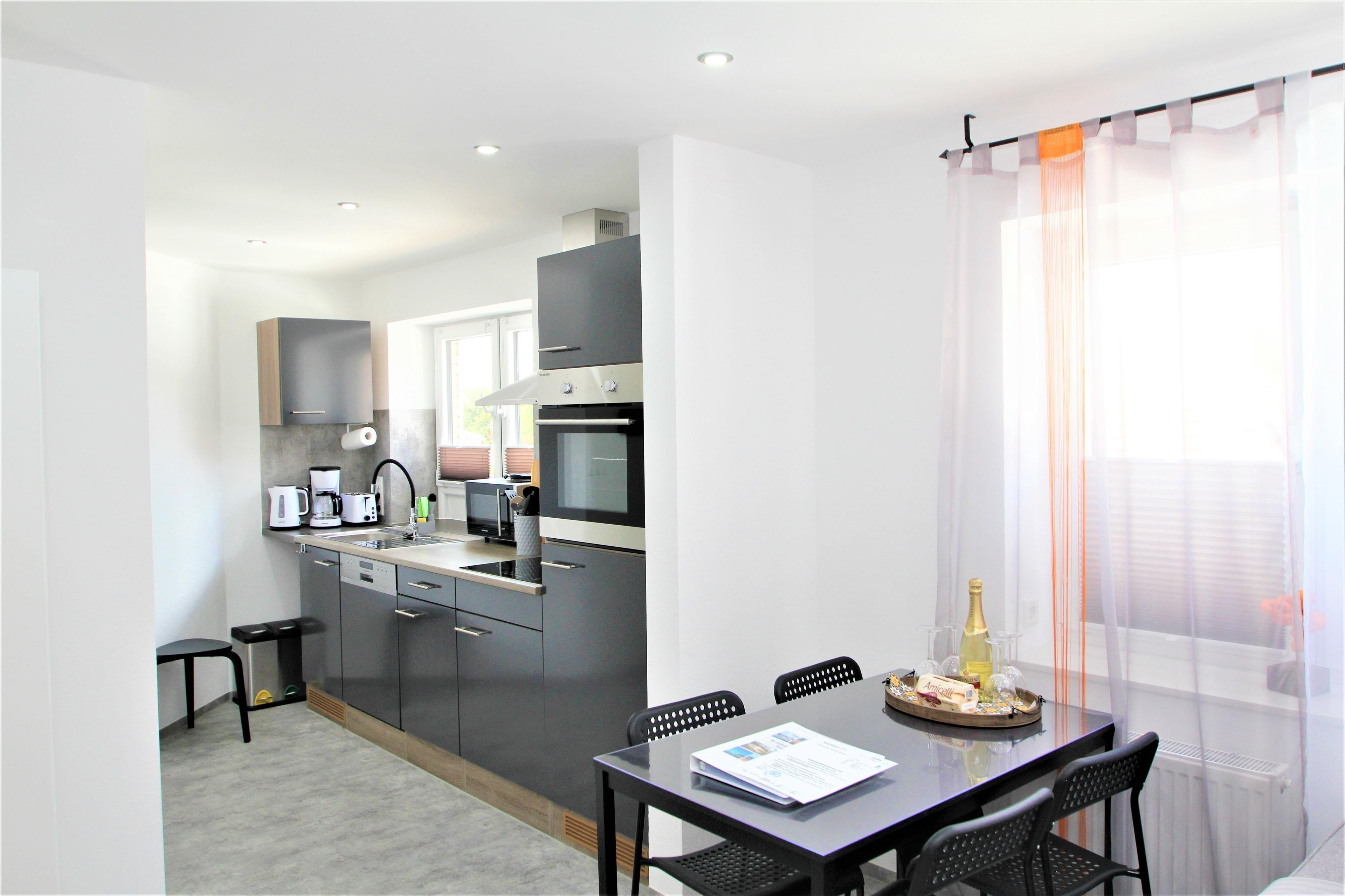 In der voll ausgestatteten Küche mit gemütlichem Essbereich finden Sie alles, was das Herz begehrt: einen Geschirrspüler, eine Mikrowelle, einen Kühlschrank, einen Backofen, einen Wasserkocher, einen Eierkocher, einen Toaster sowie eine Kaffeemaschine. So können Sie morgens mit einer duftenden Tasse Kaffee in den Tag starten und sich nach einem erlebnisreichen Ausflug ein köstliches Abendessen zaubern. Damit auch die Kleinsten bestens versorgt sind, stehen auf Anfrage ein Reisebett sowie ein Hochstuhl für Kinder bis zwei Jahren bereit.