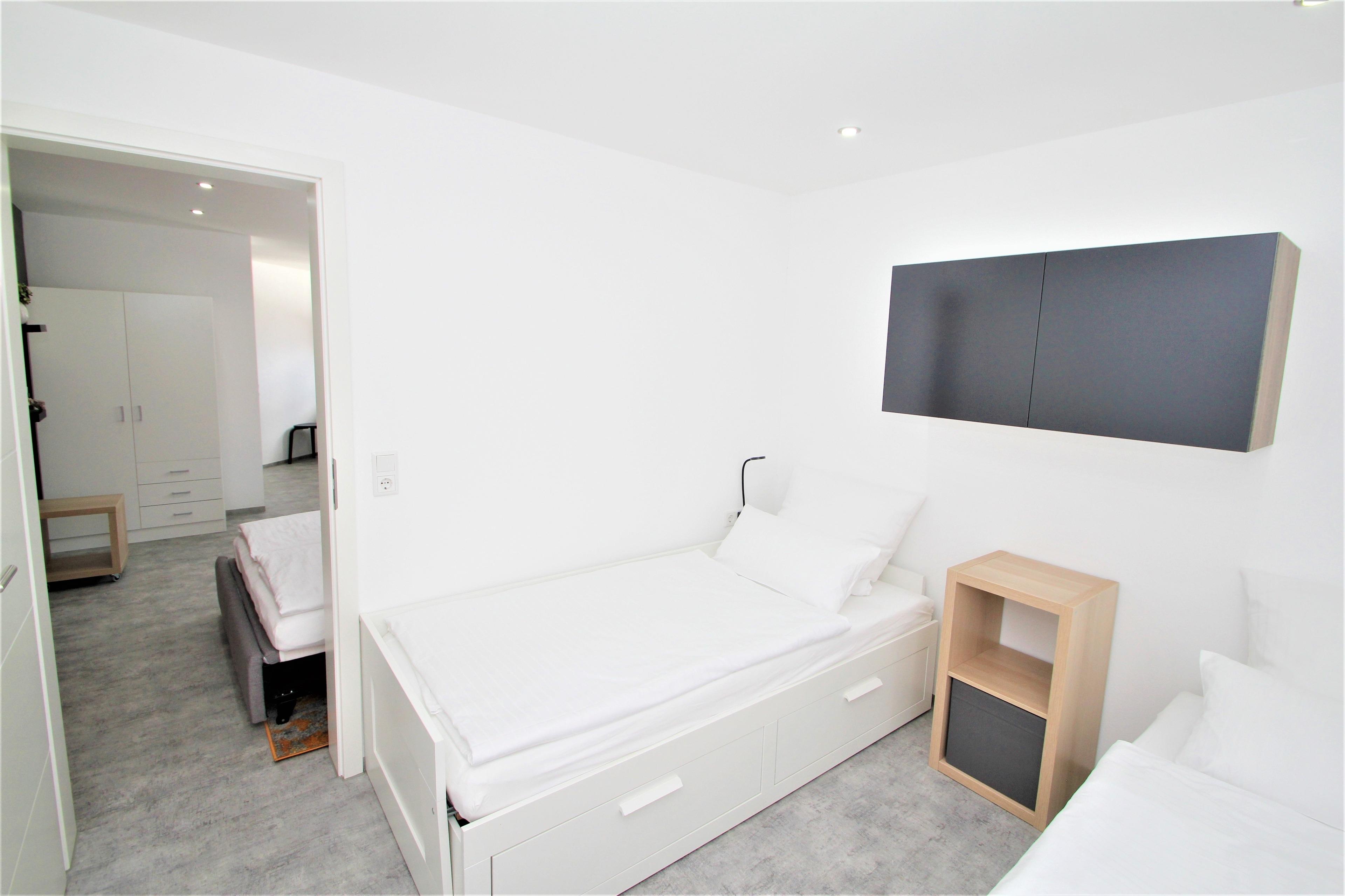 Das Schlafzimmer verfügt über zwei bequeme Einzelbetten, die sich bei Bedarf zu einer großzügigen Liegefläche von 180 x 200 cm ausziehen lassen – ideal für einen erholsamen Schlaf nach einem erlebnisreichen Tag. Im Wohnzimmer lädt eine komfortable Schlafcouch zum Entspannen ein und bietet zwei weiteren Personen eine angenehme Übernachtungsmöglichkeit. Ein geräumiger Schrank bietet genügend Platz für Ihre Garderobe, und für noch mehr Komfort sind Steckdosen in Bettnähe sowie ein Bügelbrett und Bügeleisen vorhanden – denn auch im Urlaub darf es an nichts fehlen.