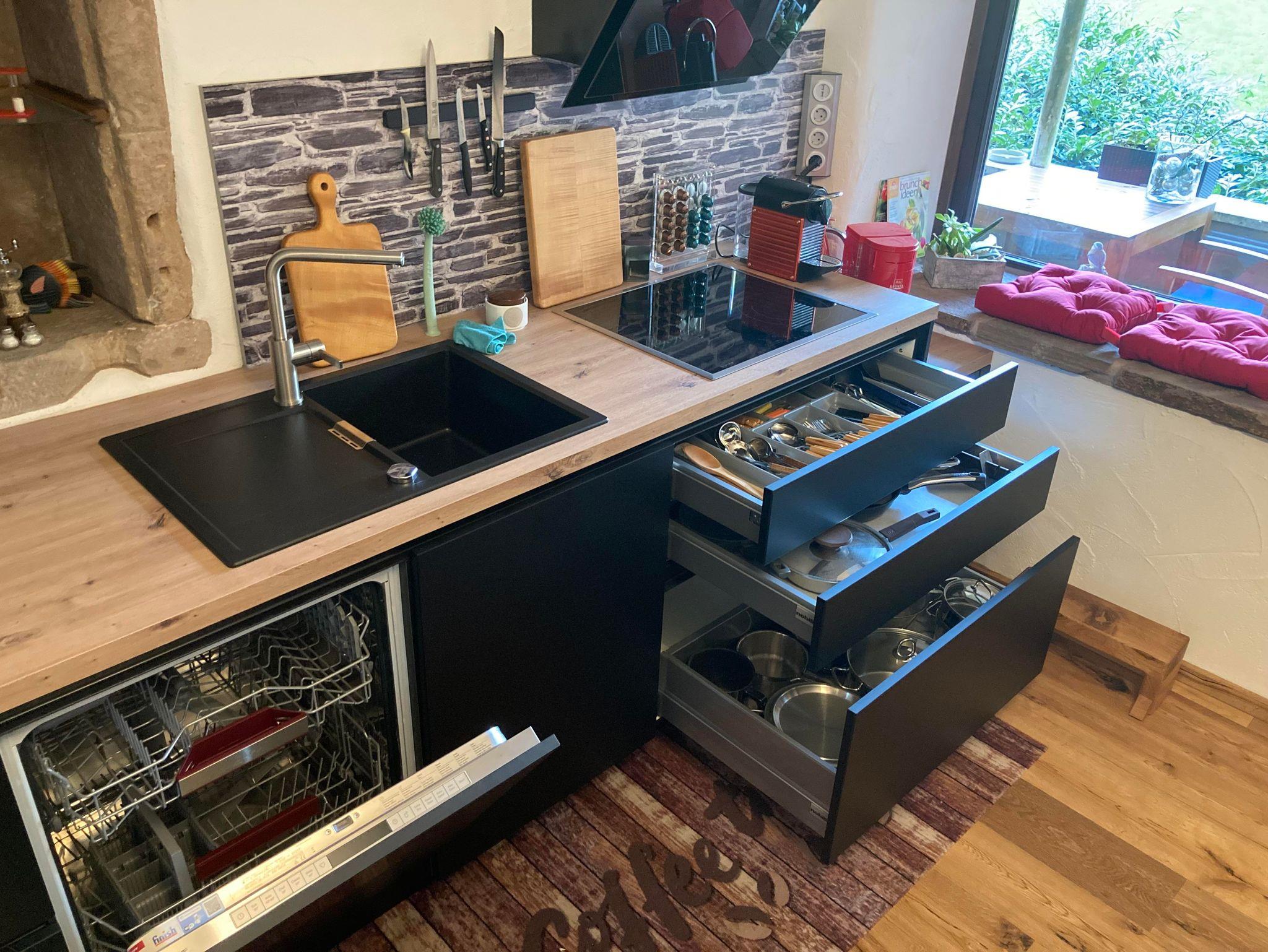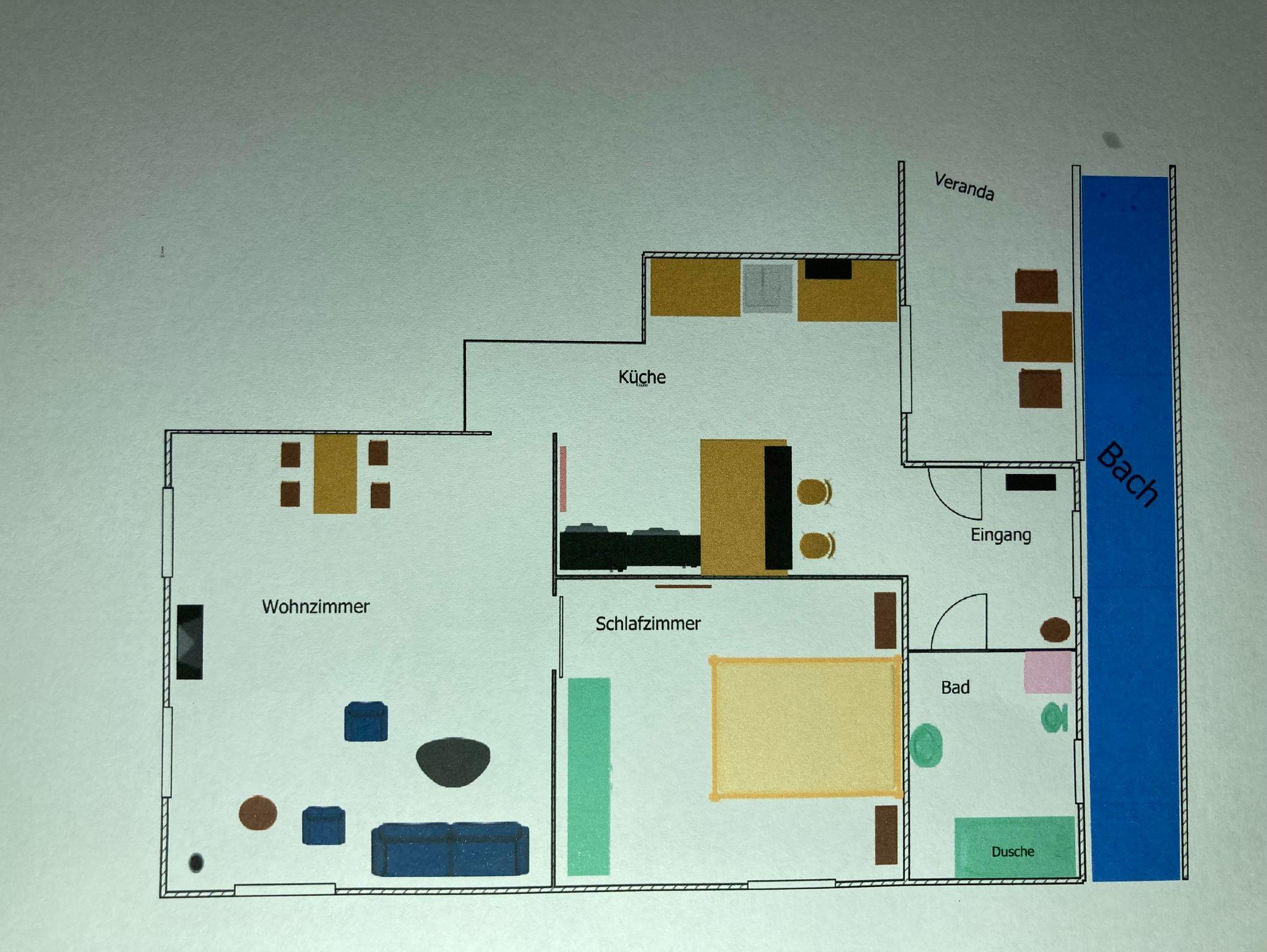 einem kleinen Flur/Eingang, 1 komplett eingerichteten Küche, 1 Wohnzimmer mit einer großen Schlafcouch und Esstisch, 1 Schlafzimmer mit Doppelbett, einer überdachten Terrasse direkt am Bachufer, 1 Badezimmer mit ebenerdiger Dusche und Waschmaschine.