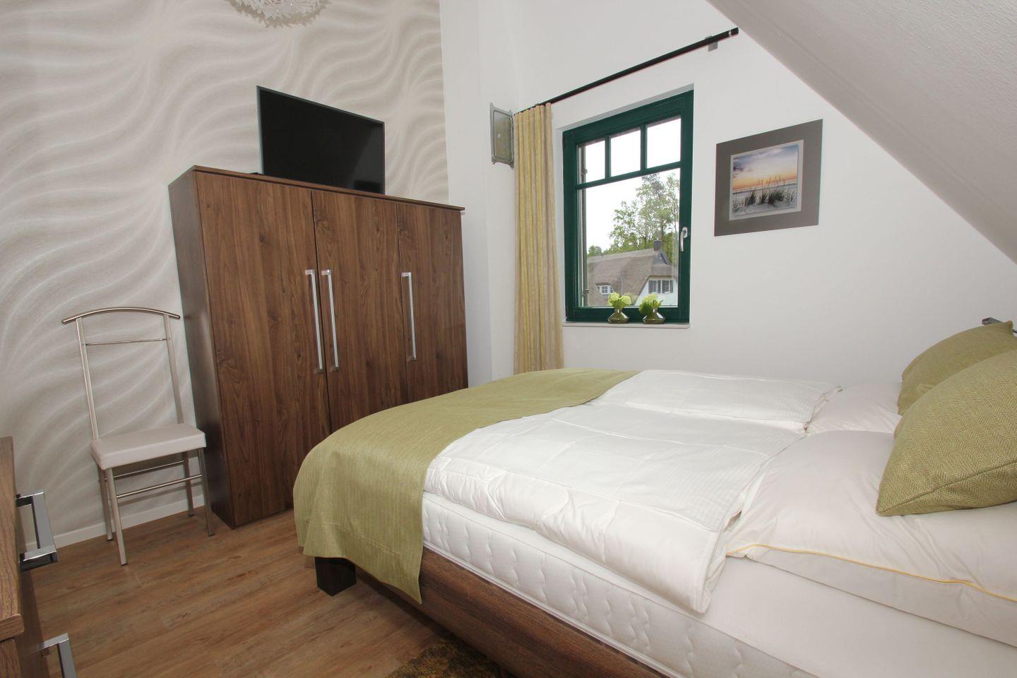 Vier separate Schlafzimmer, davon drei mit einem großzügigen Doppelbett, das vierte mit zwei Einzelbetten. Ein modernes Duschbad mit Badewanne, offener, verglaster Dusche und ein Gäste-WC im Erdgeschoss machen das Ferienhaus komplett.