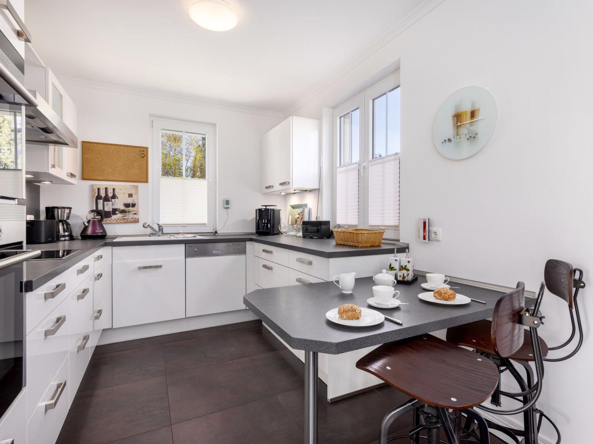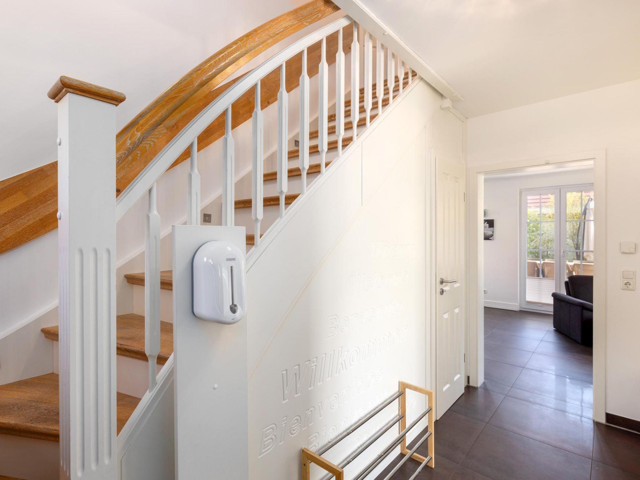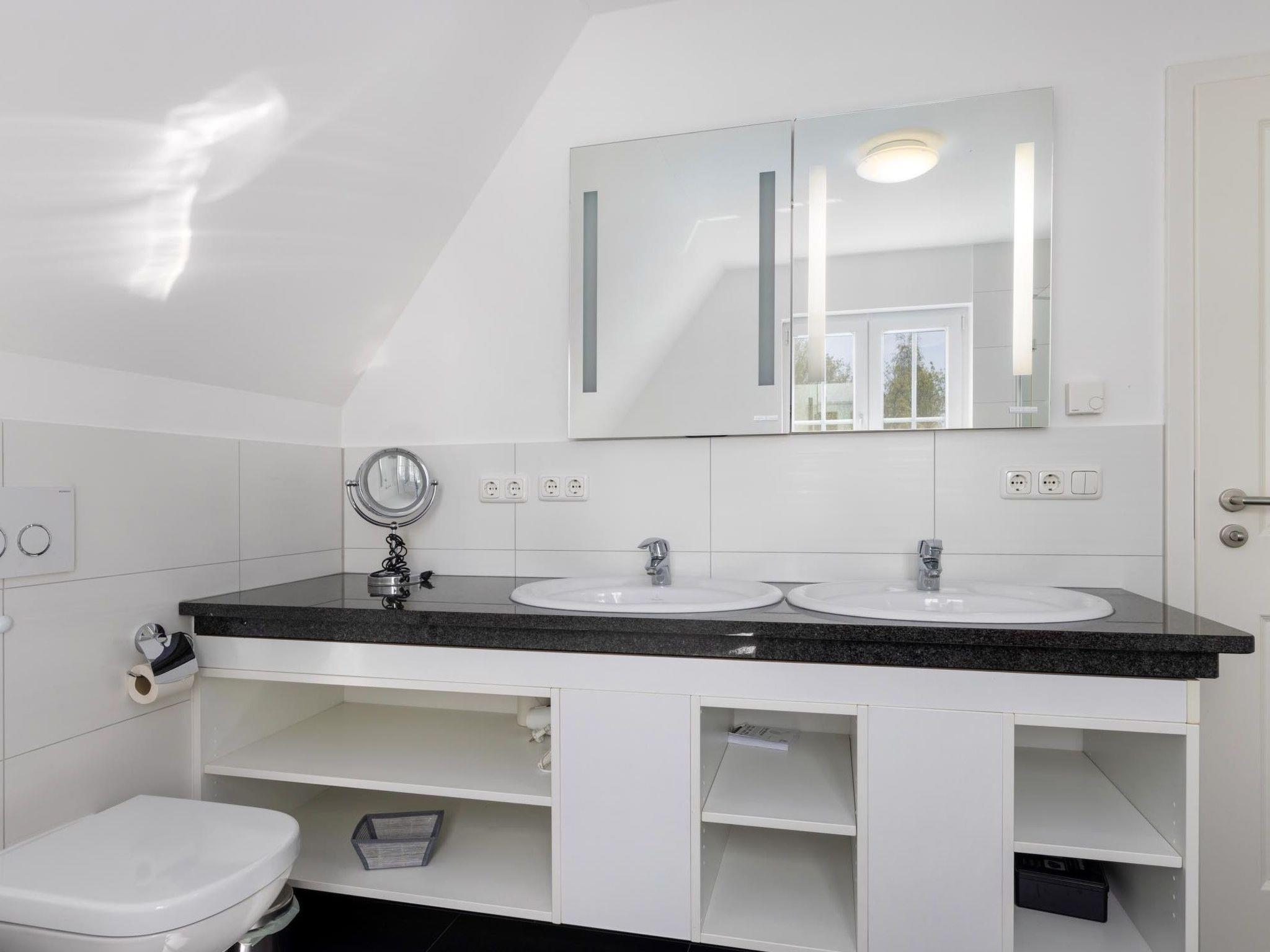 On the ground floor there is a bathroom with a spacious, barrier-free all-glass shower, double washbasin and WC. On the upper floor you will find another bathroom with a corner bath, also an all-glass shower, double washbasin and WC. There is a further WC with washbasin on the top floor.