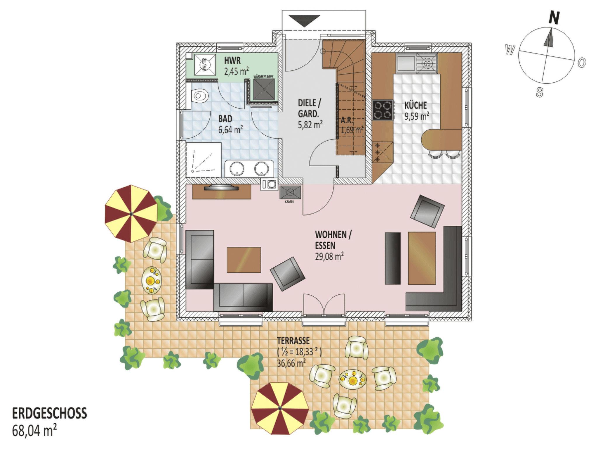 The house is characterised by its exclusive details, including a whitewashed oak staircase with integrated twilight-switched night light, electric shutters and fly screens in front of the windows. The spacious living/dining area with wood-burning stove and integrated kitchen opens onto the adjoining south-west-facing terrace, where you can relax in elegant garden furniture.