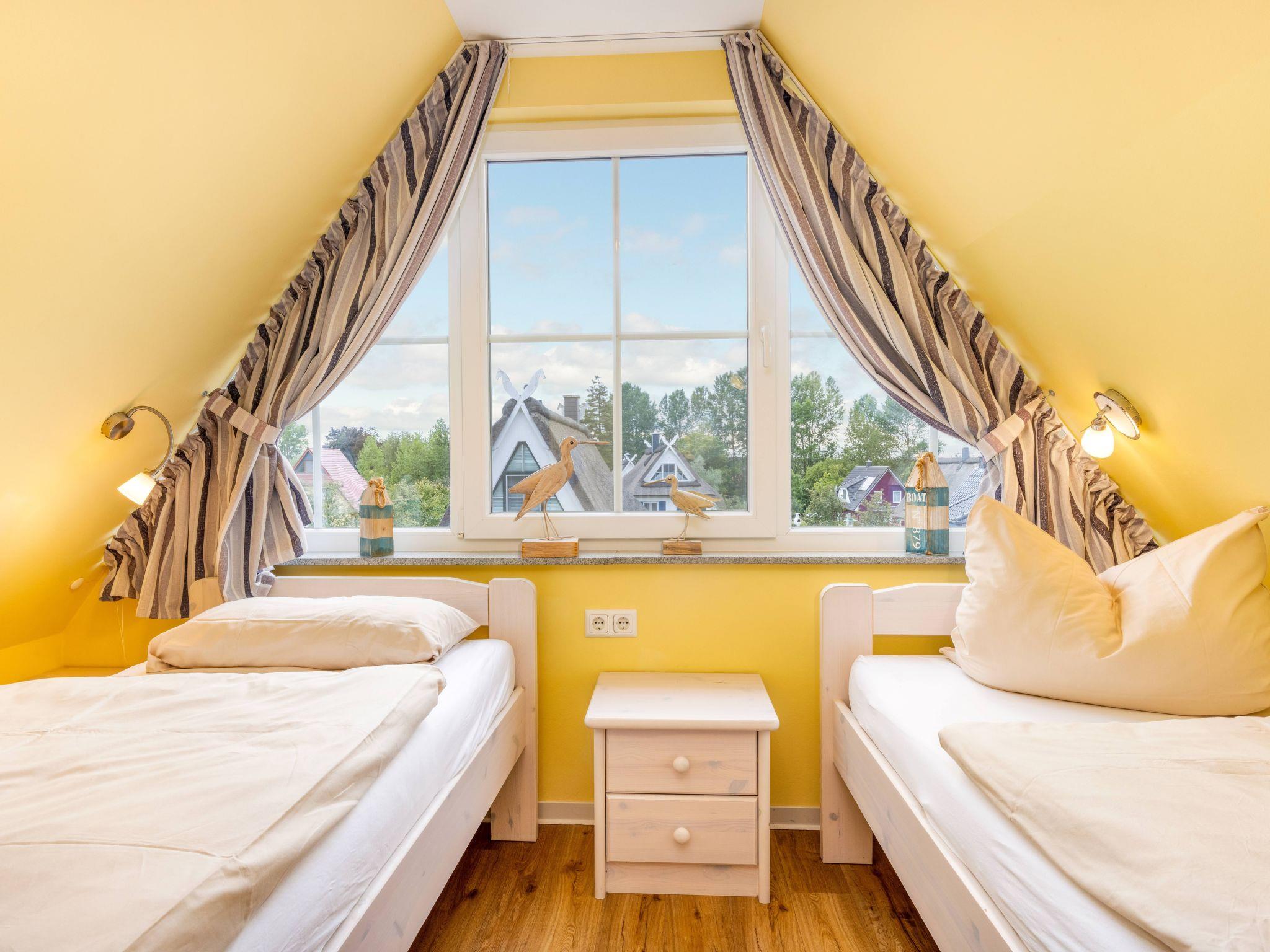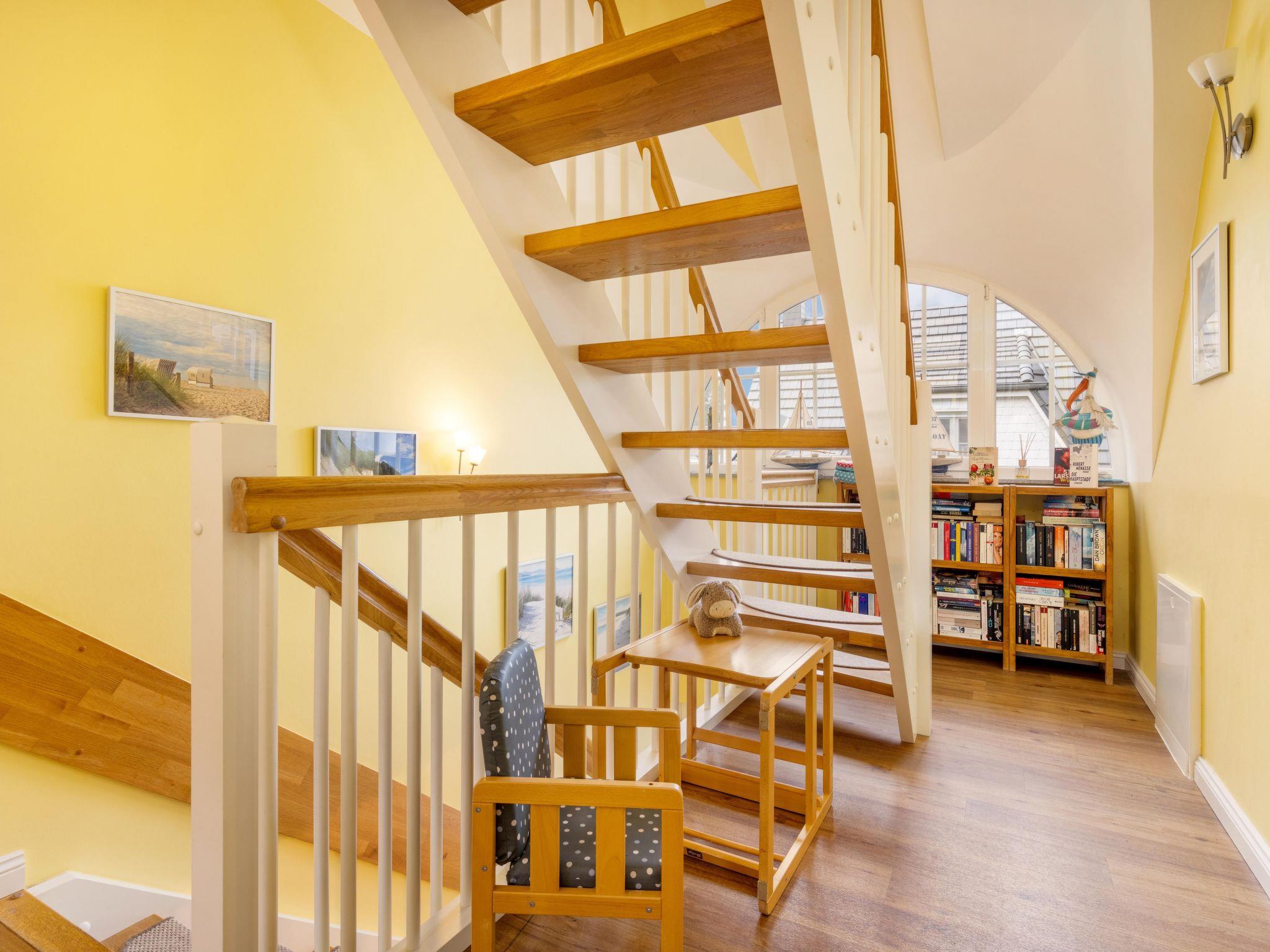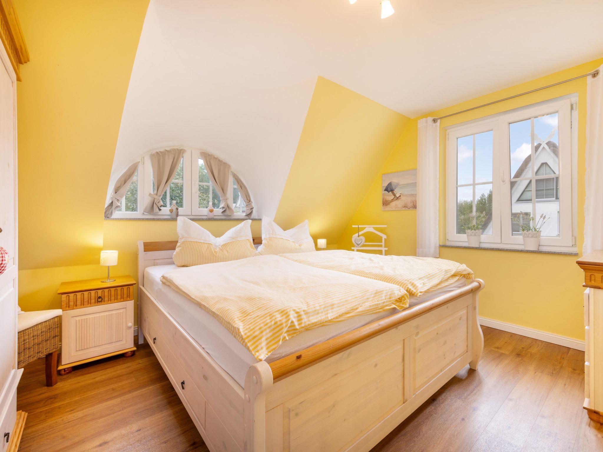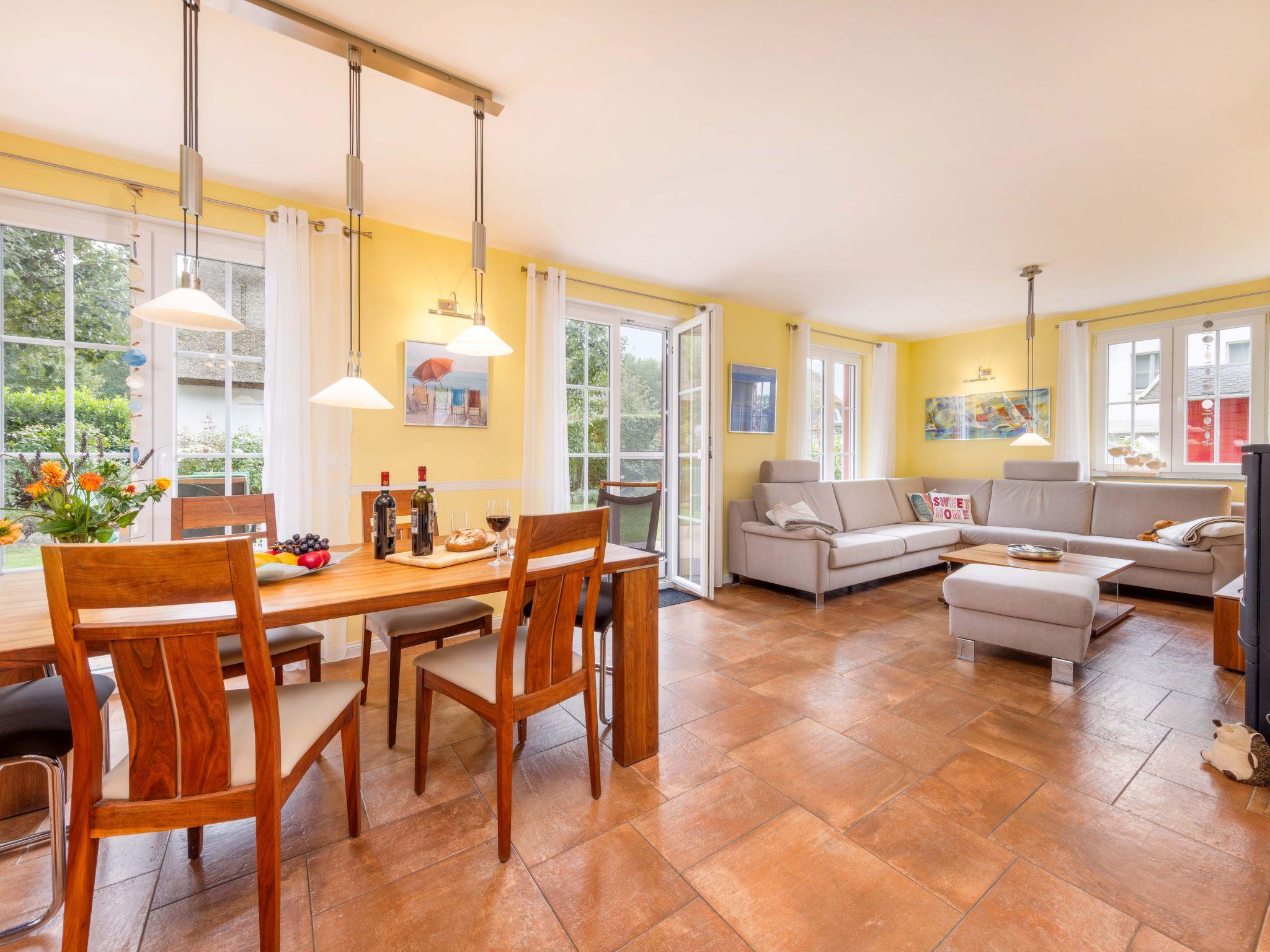 Look forward to the top-equipped thatched-roof holiday home. Breathe in the fresh Baltic Sea air and relax in the spacious and tastefully furnished thatched-roof house with 134 square metres of living space. It offers enough space for eight adults. The ground floor of the thatched-roof holiday home offers you a very tastefully furnished living room with a large living area, modern furniture and a spacious dining area. A wood-burning stove for cosy evenings, as well as a large LCD TV and a Blu-Ray system with radio. A modern, fully equipped kitchen with integrated microwave in the oven, ceramic hob, dishwasher, large fridge-freezer and many accessories such as a fully automatic coffee machine for your cappuccino or espresso, coffee machine, sandwich maker, waffle iron, children's crockery, toaster, raclette and much more. After a long day at the beach, you can spend a wellness evening in the sauna as a highlight for complete relaxation. The bathrooms on the ground floor and first floor are equipped with a modern double washbasin, walk-in shower with glass screen, WC and hairdryer. Also on the ground floor is the utility room with washing machine and tumble dryer, clothes horse, ironing board, iron and consumables. The windows and doors have electric shutters and insect screens. A tasteful oak staircase leads to the upper floor, where there are three bedrooms. Two beautiful country-style bedrooms (two x double bed) with excellent mattresses and plenty of cupboards for your wardrobe, LCD TV, clock radio and a bedroom with desk and 1.40m wide bed. Of course, there are also electric shutters and insect screens on the upper floor. The converted attic has a staircase with a stair gate. Here you will find a spacious, bright and friendly living and sleeping area with two single beds on one side and plenty of cupboards etc. on the other. On the opposite side, there is a spacious living area that invites you to relax and read. The loft is also equipped with a TV, a small library for children, children's games etc. and modern blackout curtains. Of course, smaller children have also been catered for. The holiday home has 2 travel cots with changing mat, high chair, children's books, board games etc. and of course a handcart with beach toys. There is also a library for adults.