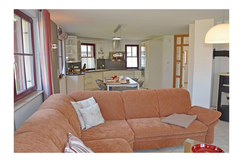 Erdgeschoss: großzügiger Wohn- Essbereich mit Fußbodenheizung und Kamin, gemütliche Couchlandschaft, TV/ Sat (Flatscreen), WLAN vorhanden, Home-Entertainment-Anlage mit Blu-ray Player, Radio/ CD, offene komplett ausgestattete Einbauküche mit 4- Plattenherd/ Induktion (Ceranfeld), Backofen, Kühlschrank mit großem Gefrierfach, Mikrowelle, Geschirrspüler und diverse Elektrogeräte, Gefriertruhe vorhanden (Ideal für Angler), komfortabler Saunabereich mit Dusche, WC und Fön, Wirtschaftsraum mit Waschtrockner Obergeschoss: 1. Schlafzimmer mit Doppelbett, TV (Flatscreen) und großem Einbaukleiderschrank, 2. Schlafzimmer mit Doppelbett und großem Einbaukleiderschrank, 3. Schlafzimmer mit einem Einzelbett, zusätzlich ausziehbarem Rollbett und ein Kindergitterbett von FLEXA, Treppenschutzgitter, Bad mit Dusche, Badewanne, WC und Fön, Terrasse in Süd- und Westrichtung mit Gartenmöbeln und Strandkorb, Grillplatz Besonderes: “ein perfekter Urlaubstraum im Reethaus-Dünenwald” luxuriöses Reetdach gedecktes Haus, besonders kinderfreundlich eingerichtet, Kinderhochstuhl vorhanden, allergikerfreundlich, Nichtraucher, Sauna ohne Gebühr, Waschtrockner ohne Gebühr, Bügeleisen und Bügelbrett vorhanden, Grundstück ca. 480 qm mit Gartenhaus, 6 Fahrradstellplätze vorhanden, 2 PKW- Stellplätze am Haus, Haustiere nicht erwünscht, diverse Einkaufsmöglichkeiten mit Bäcker und Restaurants im Ort vorhanden, optimale Rad- und Wandermöglichkeiten