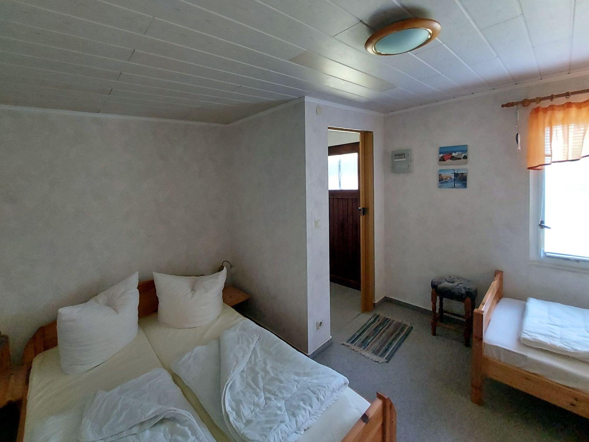 • ein Schlafzimmer mit Doppel- und Einzelbett sowie einem Kleiderschrank,