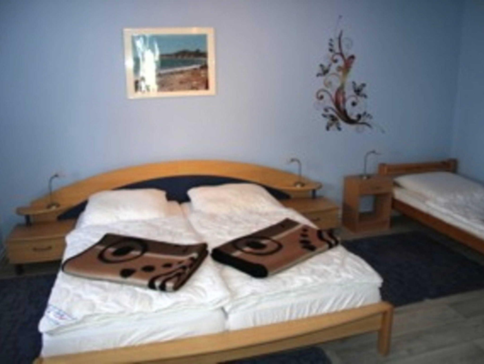 Die Nasszelle ist mit Waschbecken, WC und Dusche ausgestattet. Im Schlafraum können drei Personen schlafen: zwei Personen im geräumigen Doppelbett, eine Person im Einzelbett. Ein großer Kleiderschrank bietet Platz für die Urlaubsgarderobe. Es findet sich auch noch ein Platz für ein Reisebett für Kleinkinder, das nach Voranmeldung zur Verfügung gestellt wird.