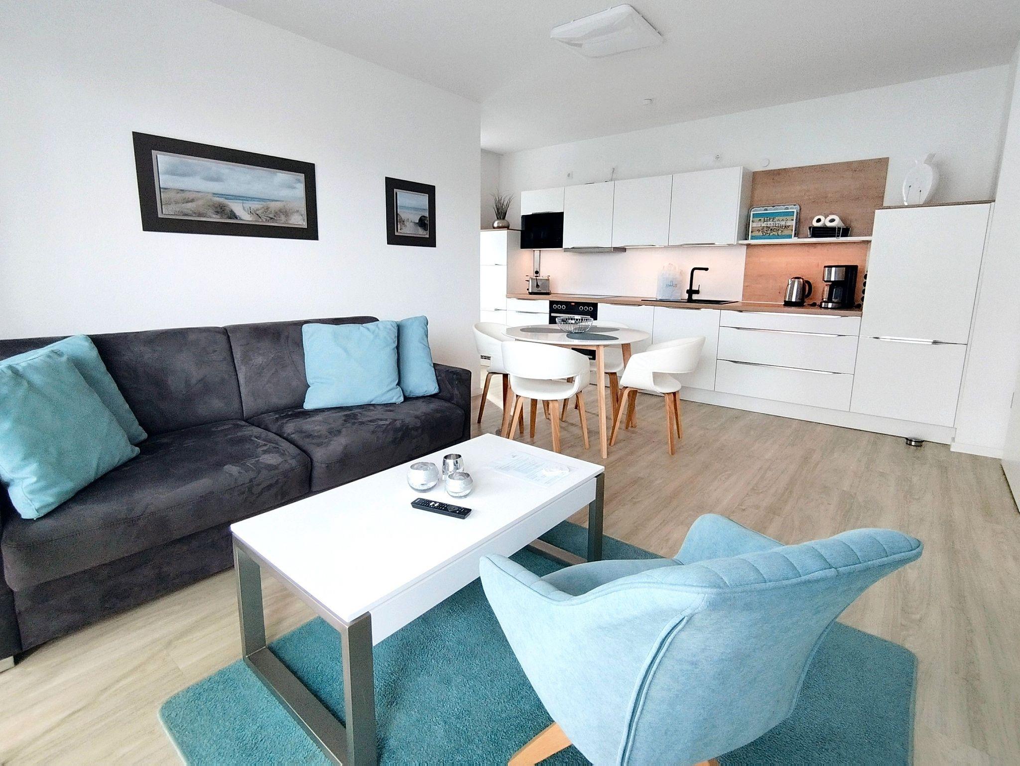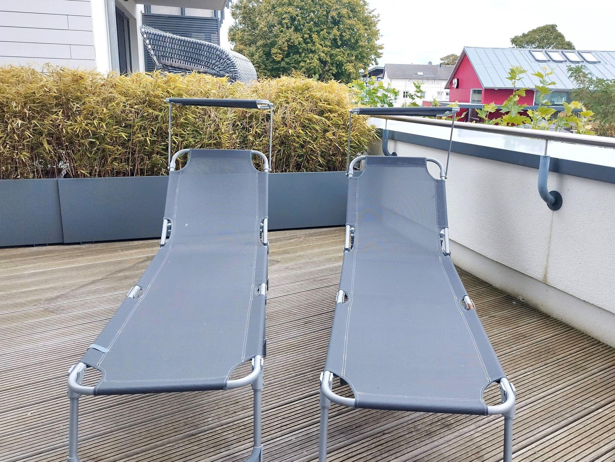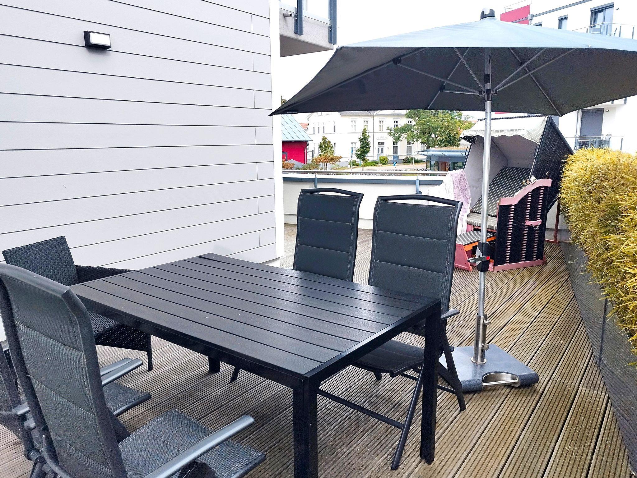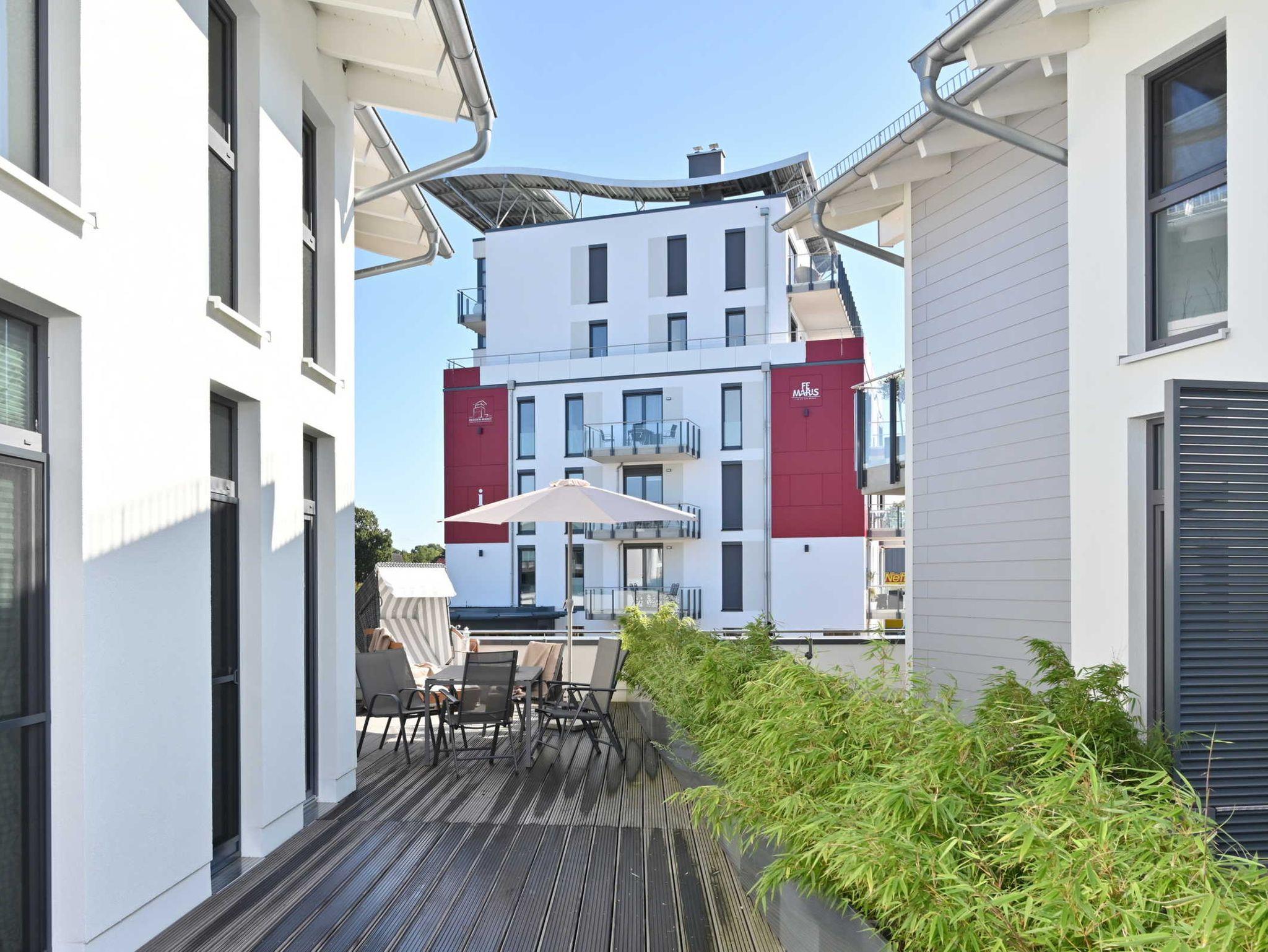 Sie besitzt ein Schlafzimmer mit Doppelbett. Das Wohnzimmer verfügt über eine Schlafcouch. Hier können max. 4 Personen einen wunderbaren Urlaub verbringen. Die riesige Dachterrasse (70m²) ist mit Gartenmöbeln und einem Strandkorb bestückt und lädt nicht nur zum Sonnenbaden ein. Aus allen Räumen treten Sie auf die Terrasse. Das Bad verfügt über WC und Dusche.