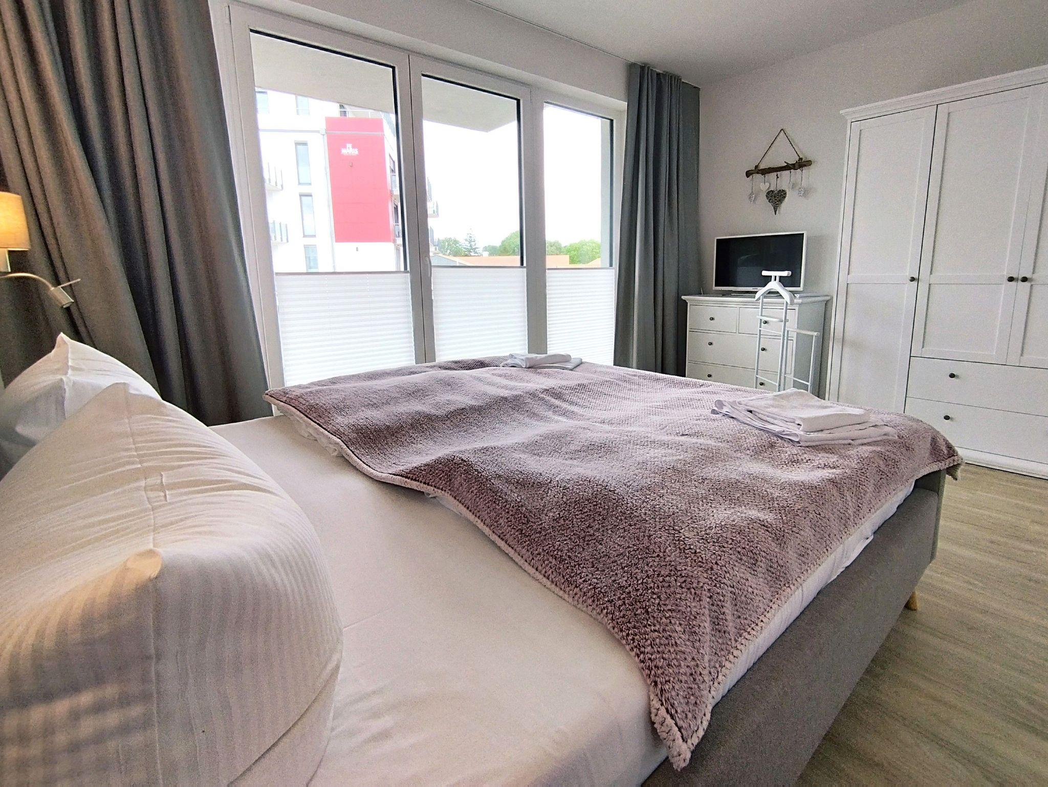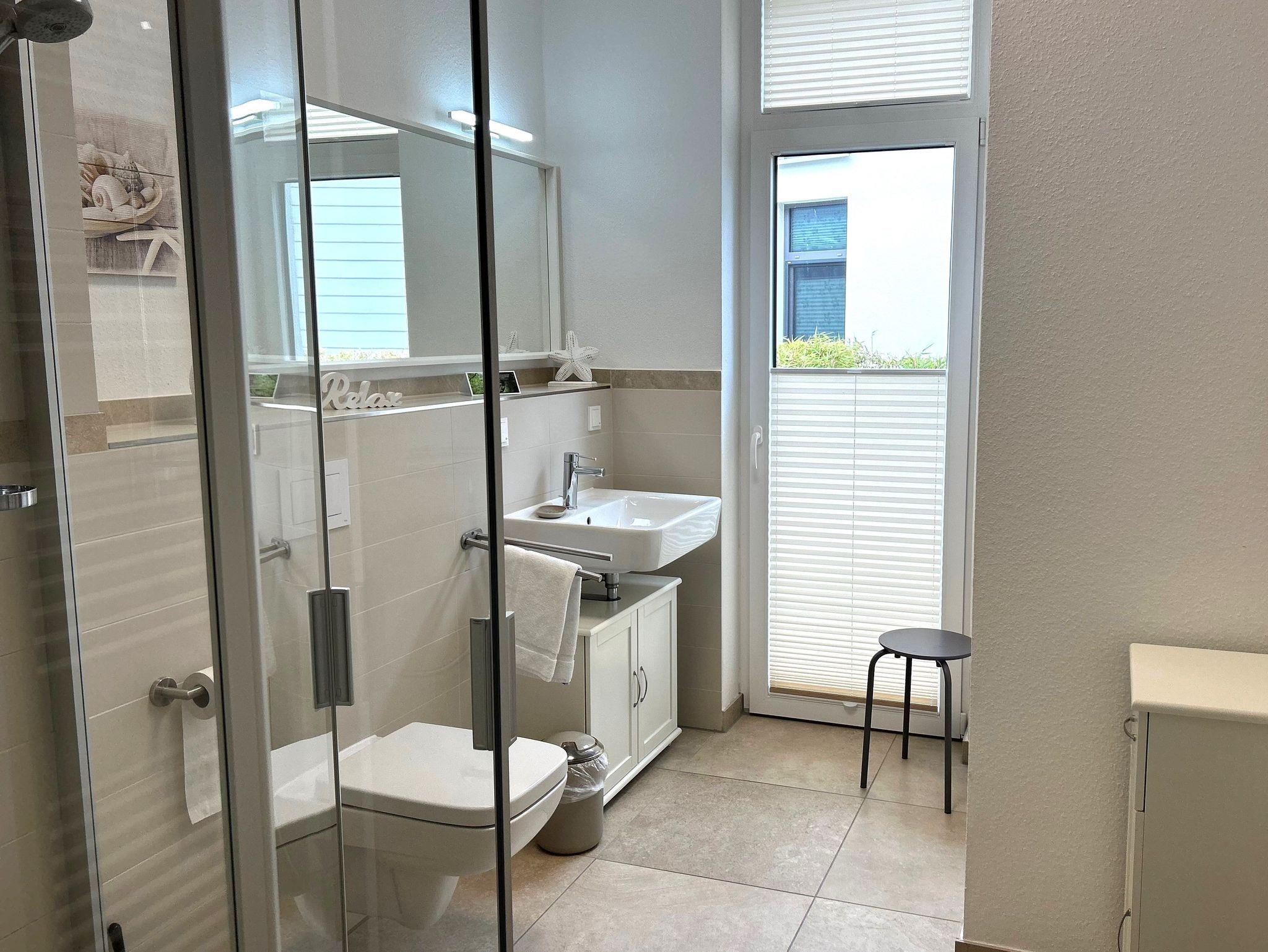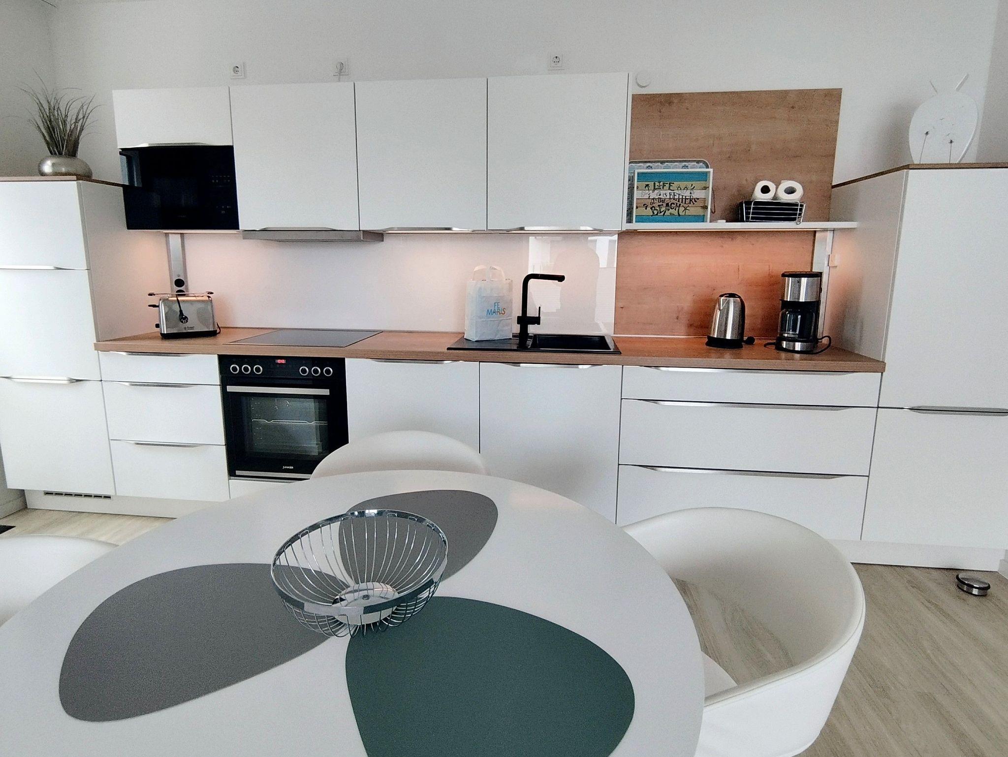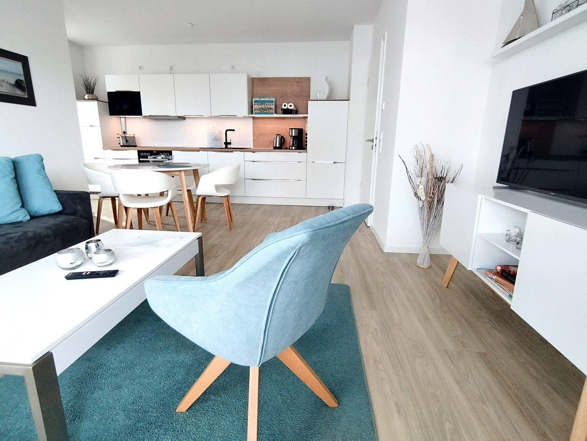Sie besitzt ein Schlafzimmer mit Doppelbett. Das Wohnzimmer verfügt über eine Schlafcouch. Hier können max. 4 Personen einen wunderbaren Urlaub verbringen. Die riesige Dachterrasse (70m²) ist mit Gartenmöbeln und einem Strandkorb bestückt und lädt nicht nur zum Sonnenbaden ein. Aus allen Räumen treten Sie auf die Terrasse. Das Bad verfügt über WC und Dusche.