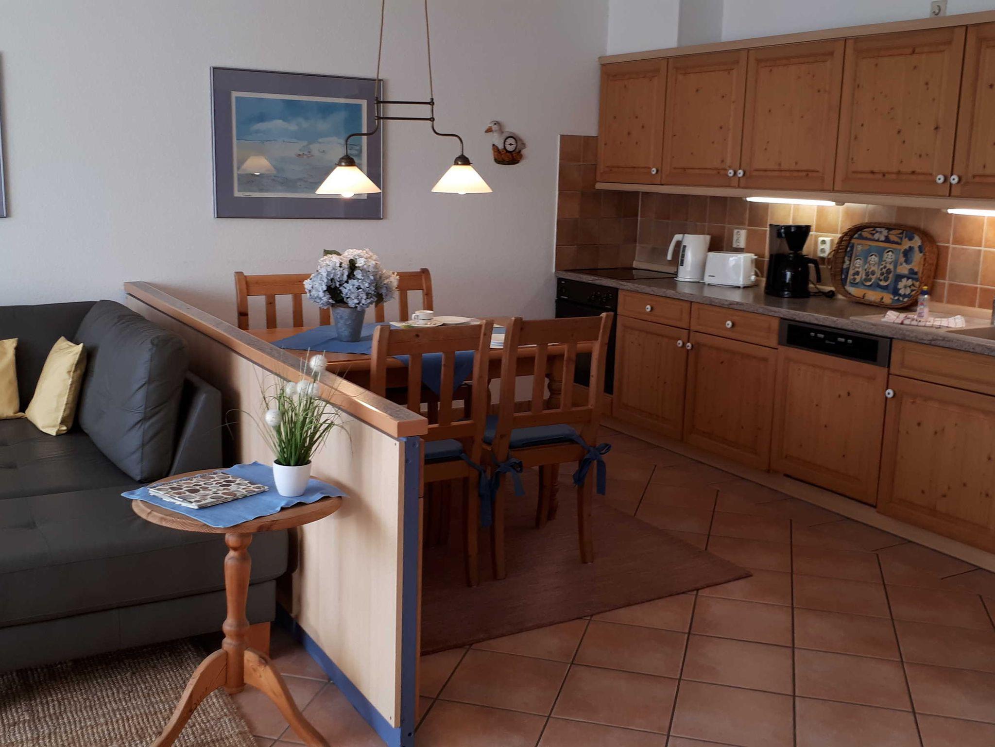 Die Küche ist komplett ausgestattet mit Geschirrspüler, Spüle, Kühlschrank mit Gefrierfach, Cerankochfeld, Backofen, Wasserkocher, Mikrowelle, Toaster, Eierkocher, Kaffeemaschine und natürlich mit Geschirr und Besteck. Von der offenen Küche kann man über die große Rundsitzgruppe bis zur Terrasse schauen. Die Möblierung ist aus Vollholz und vermittelt elegante Gemütlichkeit.