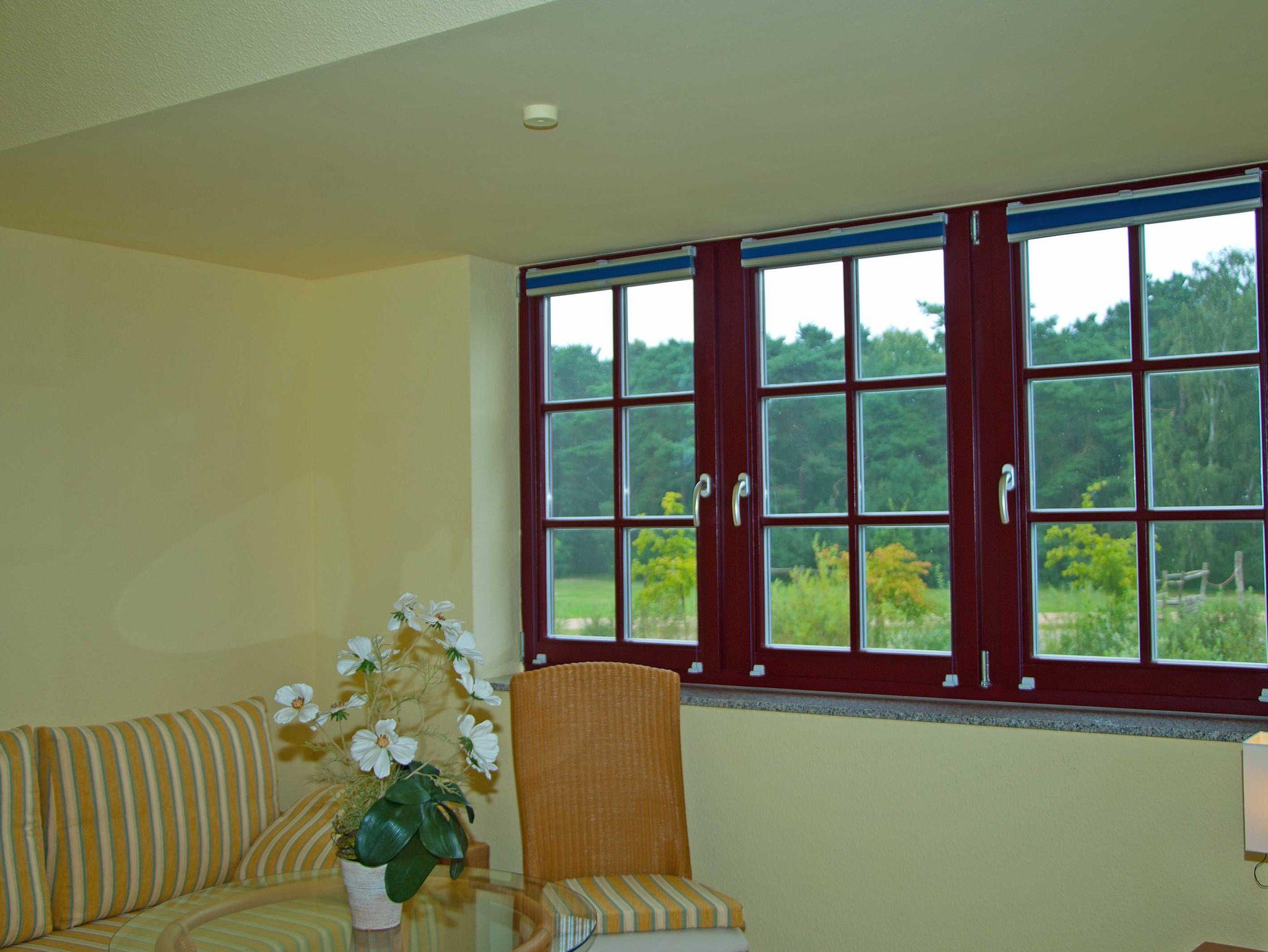 Im Wohnbereich werden Sie sich auch mal bei schlechtem Wetter sehr wohlfühlen. Die Einrichtung mit massiven Eichenmöbeln ist auf den gemütlichen Stil des Hauses mit dem Reetdach abgestimmt.