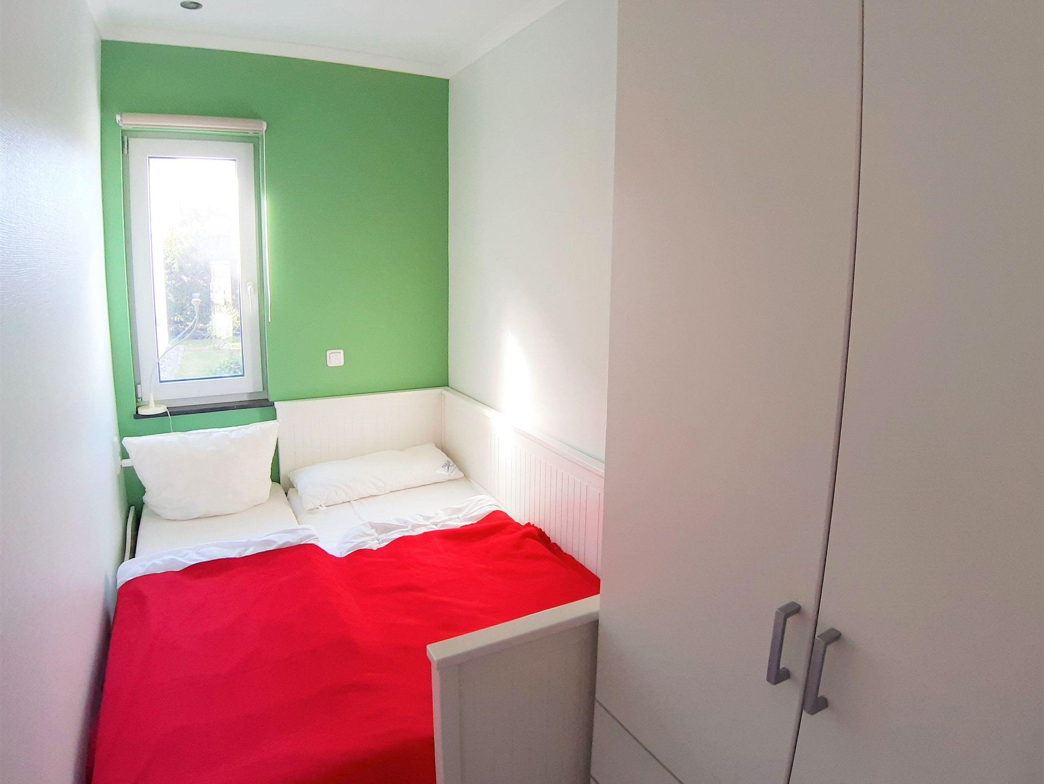 Jette verfügt über zwei Schlafzimmer mit insgesamt vier Schlafplätzen (ein Doppelbett & zwei Einzelbetten (1x 90x200cm; 1x 70x200cm). Zum Bungalow gehört ein Parkplatz. Der Garten/ die Terrasse sind räumlich durch Bewuchs vom restlichen Garten, welcher Feriengästen des Nachbarhauses zur Verfügung stehen, getrennt.