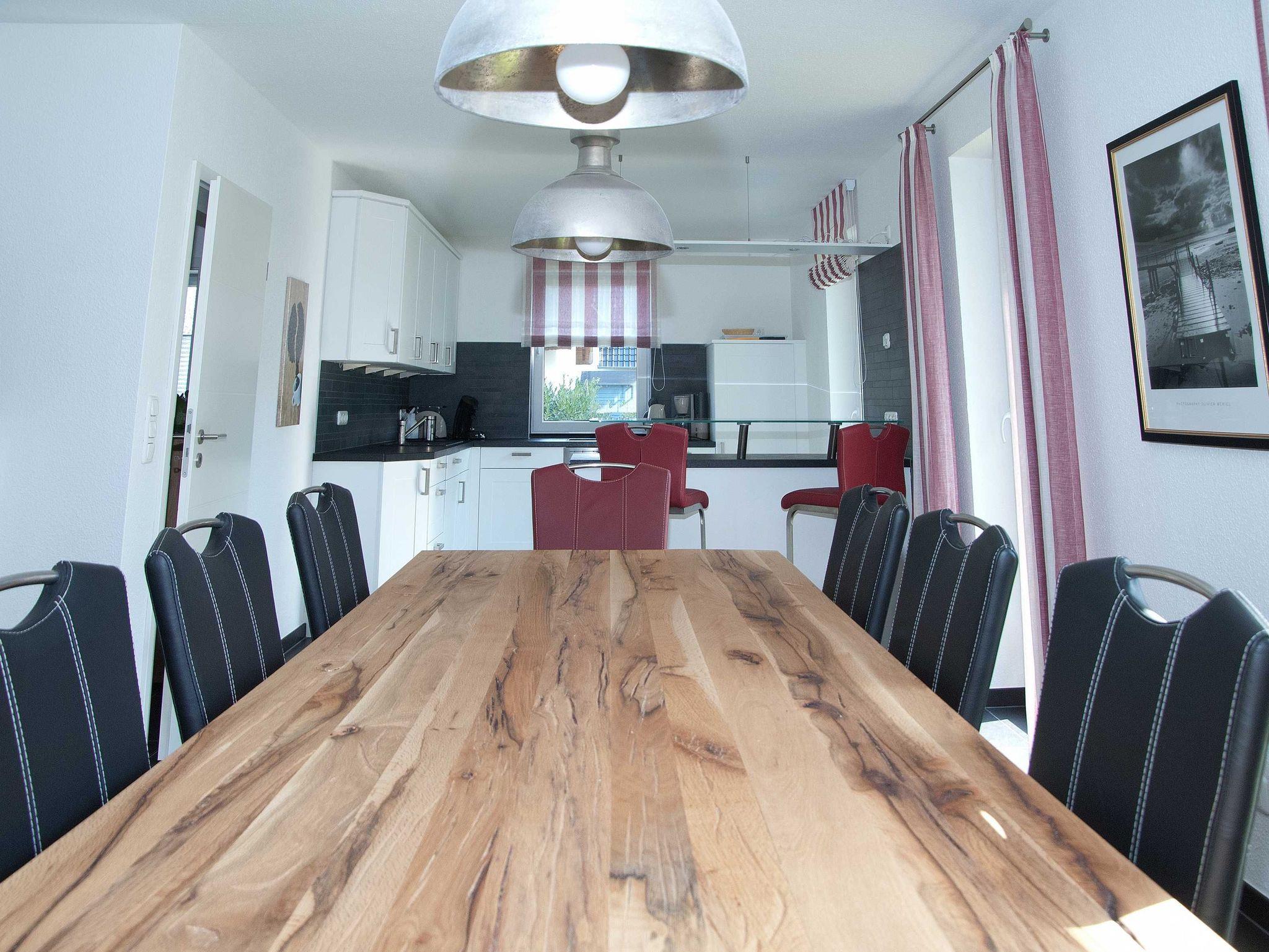 Am massiven Esstisch haben 6-10 Personen Platz. Eine Verlängerung für den Tisch haben wir im Hauswirtschaftsraum abgestellt.