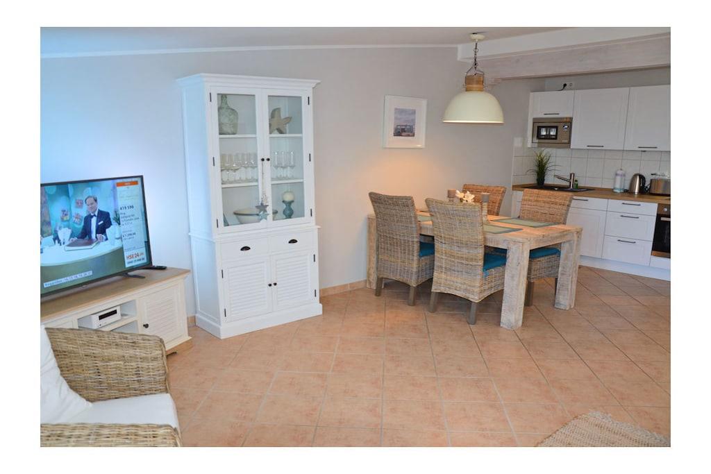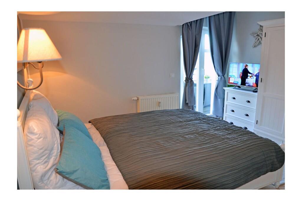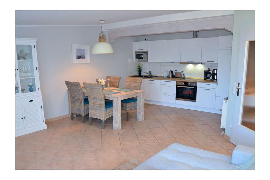 Moderner Wohn- Essbereich mit gemütlicher Couch und hochwertiger Ausstattung mit Echtholzmöbel, TV/ Sat (50 Zoll Full HD Smart TV), Blu-ray Player, HiFi, Internet (WLAN) steht kostenfrei zur Verfügung, sehr gute offene komplett ausgestattete Einbauküche mit 4-Plattenherd (Ceranfeld), Backofen, Kühlschrank mit kleinem Gefrierfach, Mikrowelle, Geschirrspüler, Bad mit Dusche/WC , Fön und Kosmetikspiegel, Waschmaschine in Abstellkammer vorhanden, Schlafzimmer mit Doppelbett (2 Matratzen je 80 x 200) und ein Schlafsessel für Kinder und Jugendliche (Sessel zum Bett ausziehbar, Maße: 107 x 193 x 16) sowie einen weiteren 32 Zoll Full HD TV und Kleiderschrank, Zugang zum Balkon vom Schlafzimmer und Wohnzimmer mit Meerblick, Balkon mit Lounge-Möbeln (2 Lounge-Sessel, Esstisch mit Stühlen und im Frühjahr/Sommer eine Liege – alles aus Polyrattan) Die Ferienwohnung „Beachcomber“ – direkt am Ostseestrand, im denkmalgeschützten Haus mit Charme 2018 wurde die Wohnung komplett renoviert mit sehr individueller und hochwertiger Ausstattung. Die Wohnung ist modern und familienfreundlich eingerichtet. Bücher und Gesellschaftsspiele für gemütliche Abende sind vorhanden. Die Ferienwohnung ist ein Nichtraucherquartier. In der Abstellkammer befinden sich Staubsauger, Wäscheständer und Reinigungsmaterialien. Der PKW-Stellplatz befindet sich im Objekt (Tiefgarage, Garagenhöhe 1,90m). Der Stellplatz bietet genug Platz, um vor oder hinter dem Auto noch Fahrräder abzustellen. Einkaufsmöglichkeiten, Bäcker und Restaurants sind in unmittelbarer Nähe. Optimale Rad- und Wandermöglichkeiten runden das Angebot ab. Haustiere sind leider nicht erwünscht.